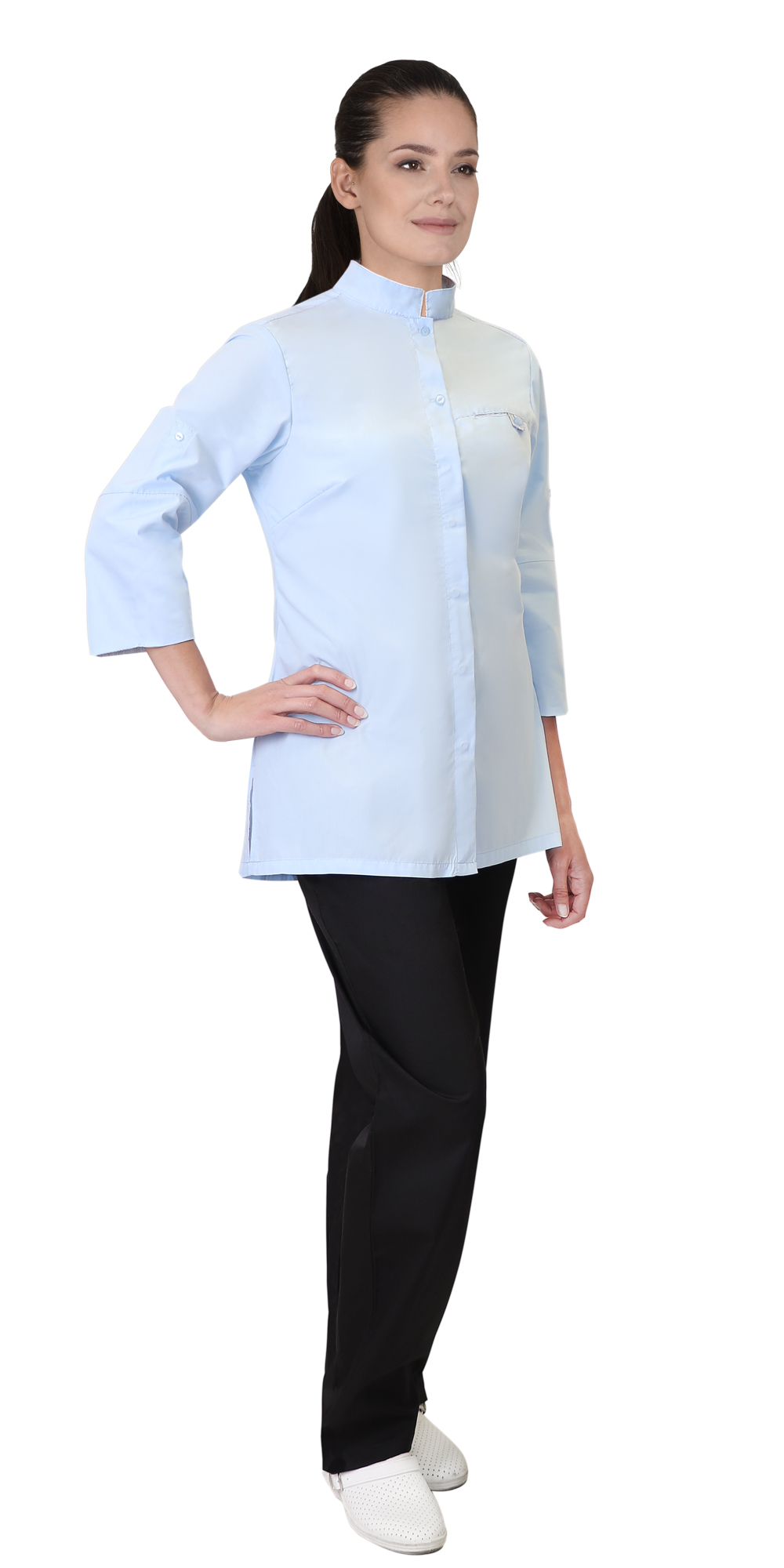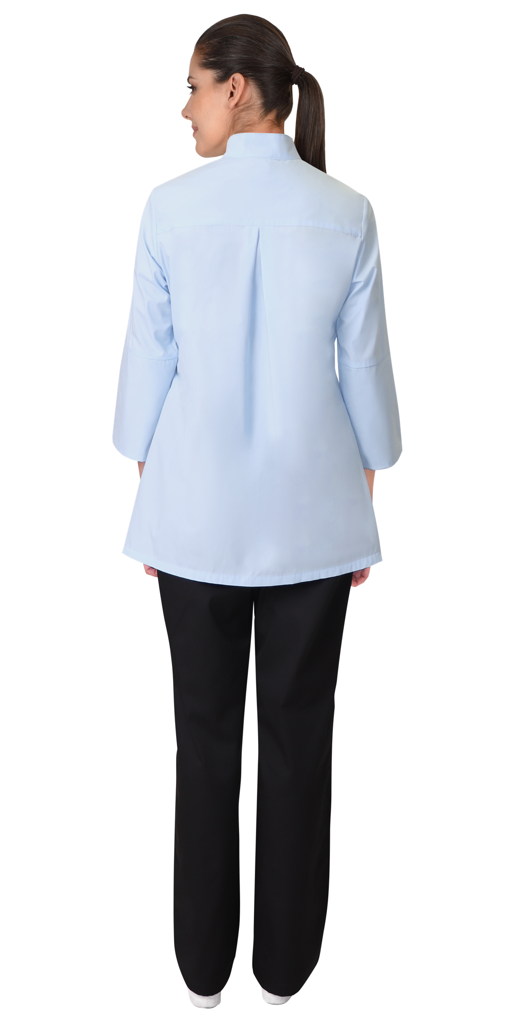 Блуза женская прямого силуэта с боковыми разрезами. Центральная застежка на 5 потайных кнопок и 2 верхние пуговицы для пристегивания фартука. Воротник стойка. Нагрудный карман на левой полочке. Рукава втачные, длиной ¾, с возможностью уменьшения длины и её фиксации при помощи хлястика и пуговицы. Подкладка кармана, внутренняя кокетка и отворот рукава выполнены из отделочной ткани в полоску.