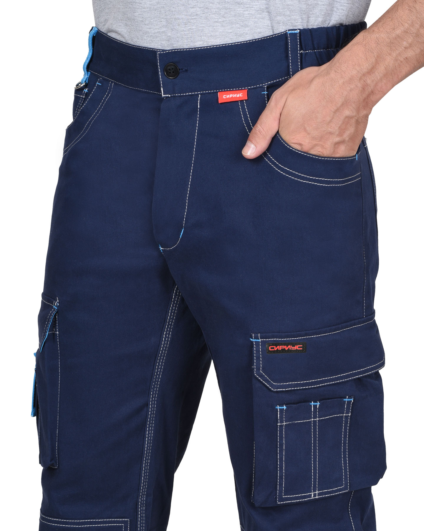 Брюки прямого силуэта с контрастной отстрочкой, с застежкой гульфика на молнию YKK и пуговицу, с карманом с фигурным входом и часовым карманом на правой половинке. На боковых швах накладные объемные карманы с фигурным клапаном на липучке. Изделие с объемными наколенниками с карманом для амортизационных накладок и застежкой на липучке по нижнему краю. Брюки с задними накладными фигурными карманами, отрезной кокеткой, с притачным поясом, частично стянутым резинкой ткацкой по боковым сторонам для лучшего прилегания. На поясе шлевки, одна из которых контрастного цвета с полукольцом для карабина.