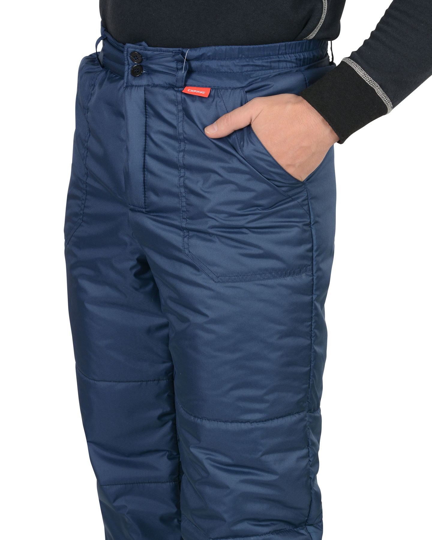 Брюки прямые, утеплённые, с центральной застежкой на тесьму "молния", притачным поясом с эластичной лентой по бокам, с застежкой на две обметанные петли и пуговицы, с пятью шлёвками: две на передней, три на задней части пояса; с боковыми карманами, задним карманом с клапаном на липучке.