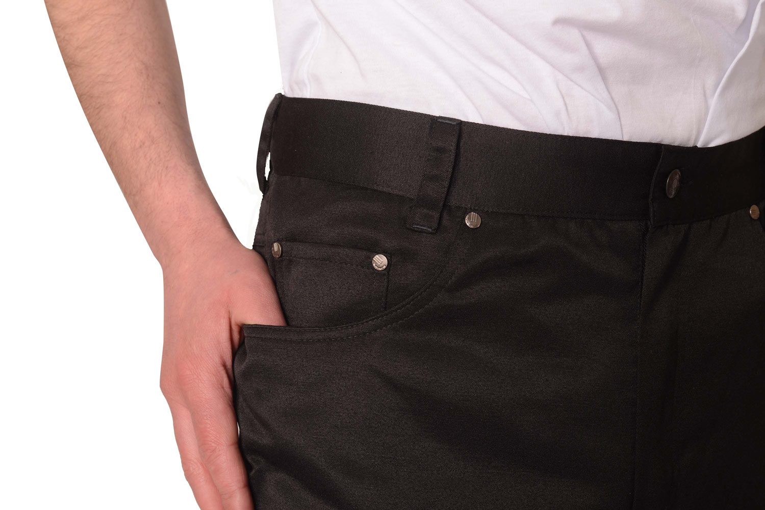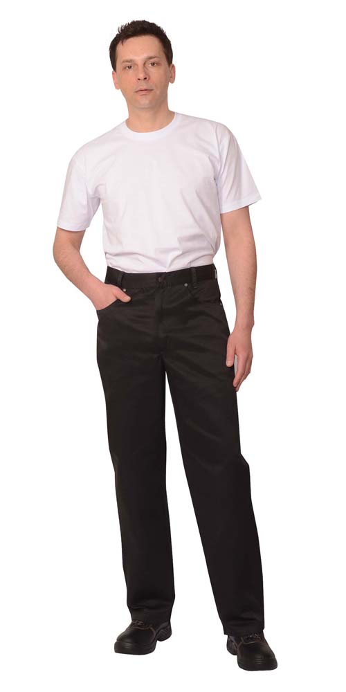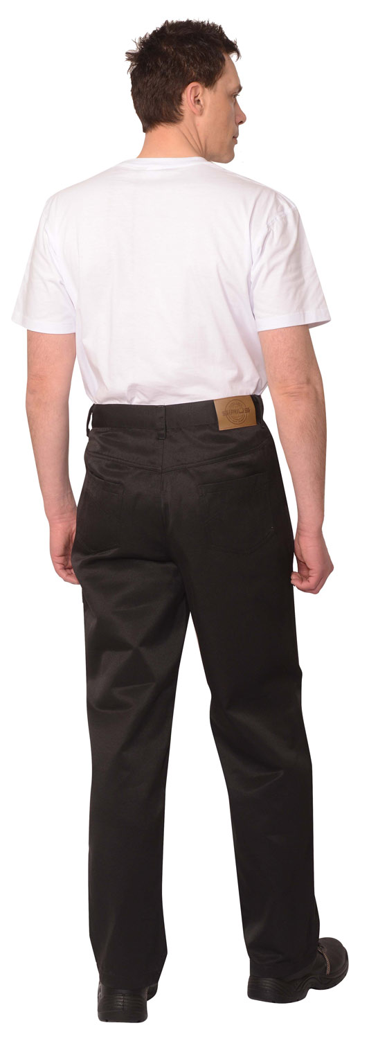 Брюки с застежкой спереди на тесьму "молния", боковыми внутренними карманами, отрезной кокеткой и двумя накладными карманами на задних половинках, с притачным поясом со шлевками, застегивающимся на петлю и пуговицу. Со стороны спинки справа на пояс настрачивается кожаная нашивка-логотип "Сириус".