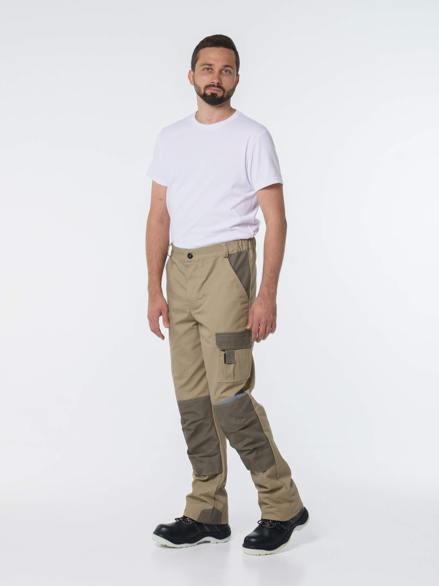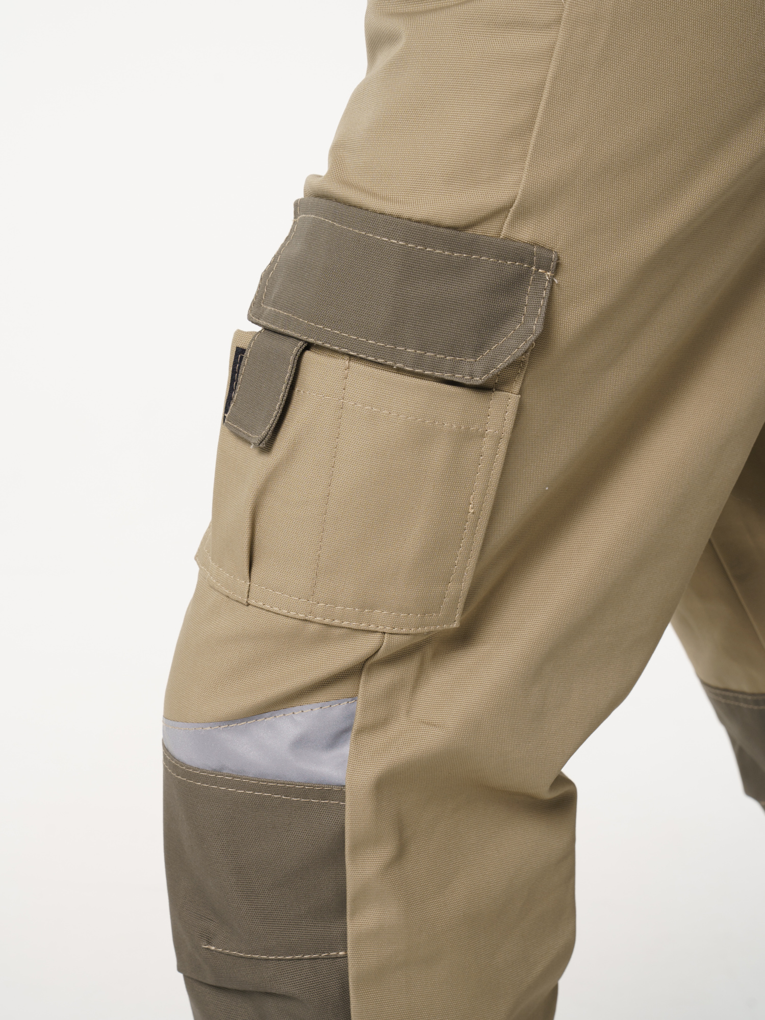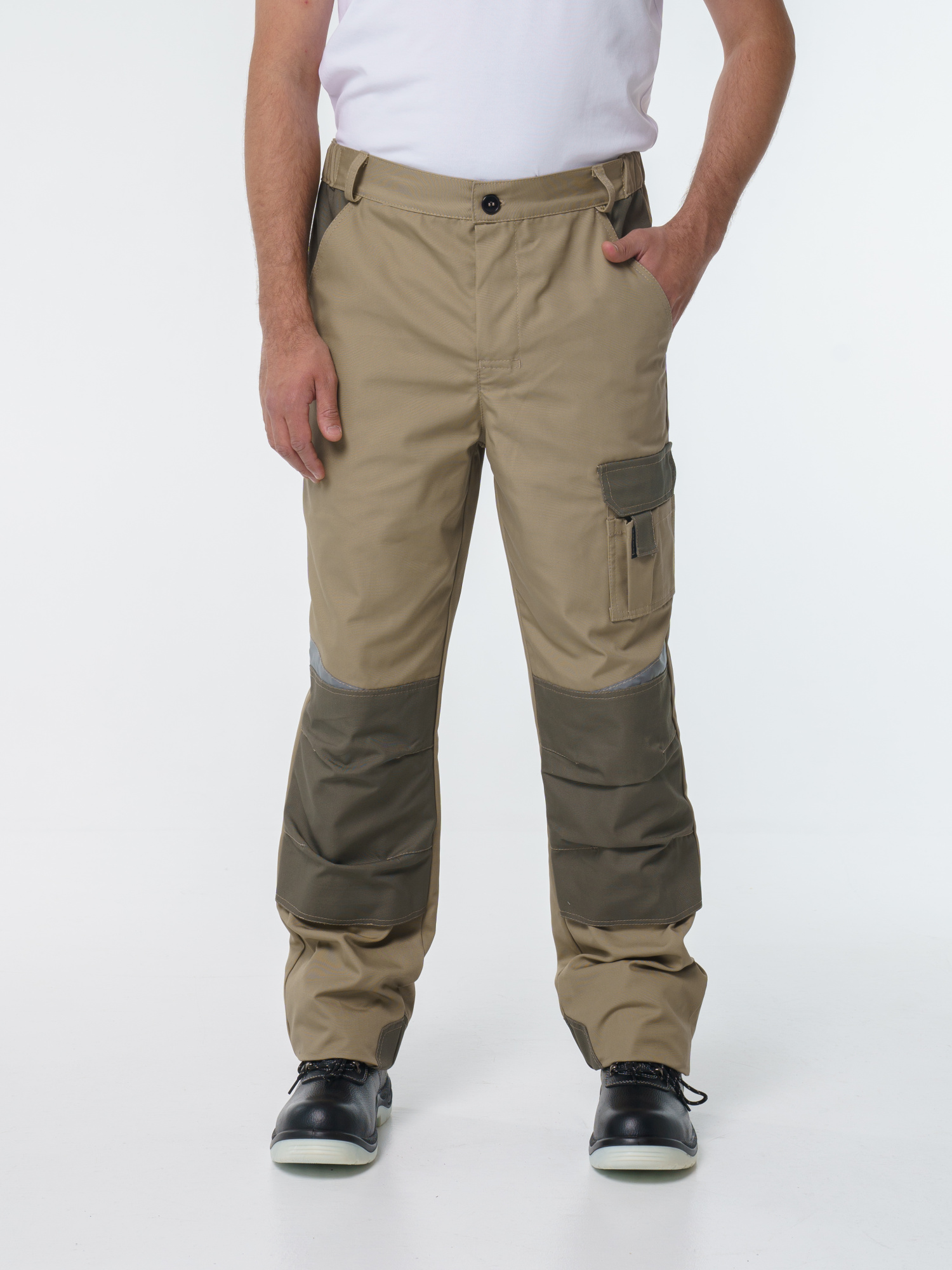 Брюки ФАВОРИТ-МЕГА прямые; с застёжкой гульфика на тесьму - «молния»; с застежкой пояса на одну петлю и пуговицу; с боковыми внутренними карманами; с карманами и фигурными клапанами застегивающиеся на потайную липучку на боковом шве; с фигурным карманом на задней половинке; с карманами под инструменты; с наколенниками. Пояс брюк частично стянут резинкой ткацкой по бокам. В брюках предусмотрена лента светоотражающая (мелкодисперсная белая) 50 мм фигурной формы.