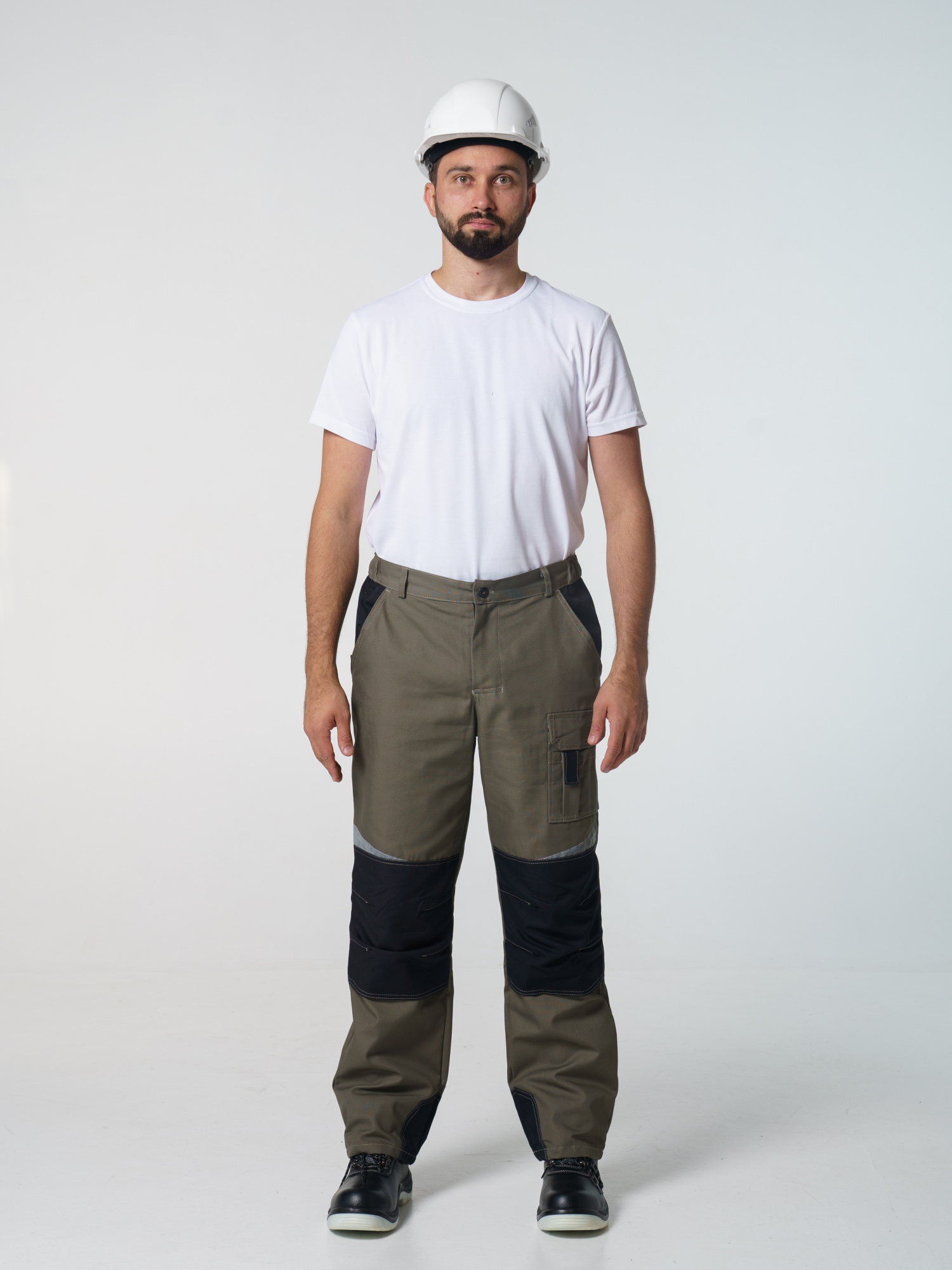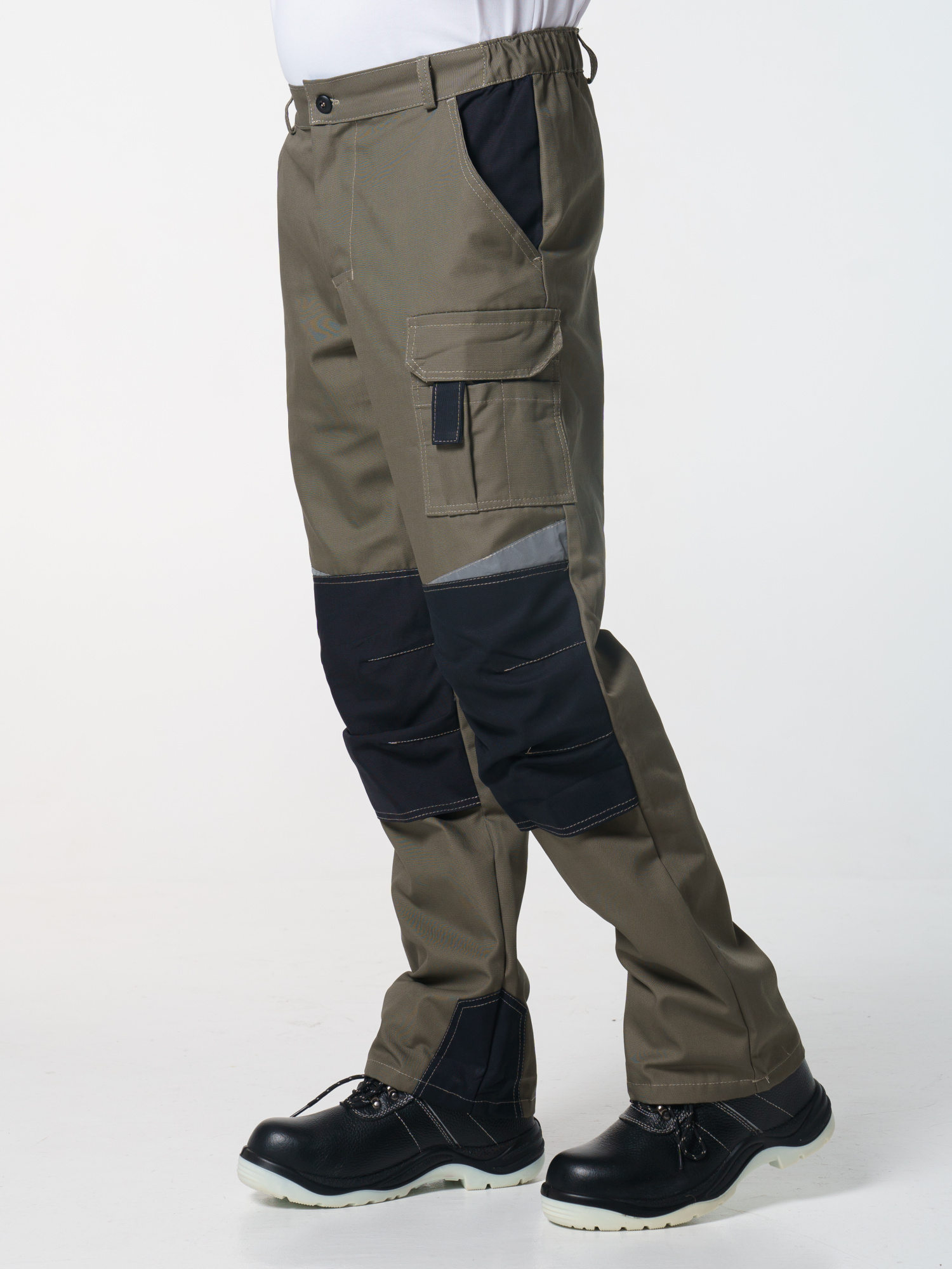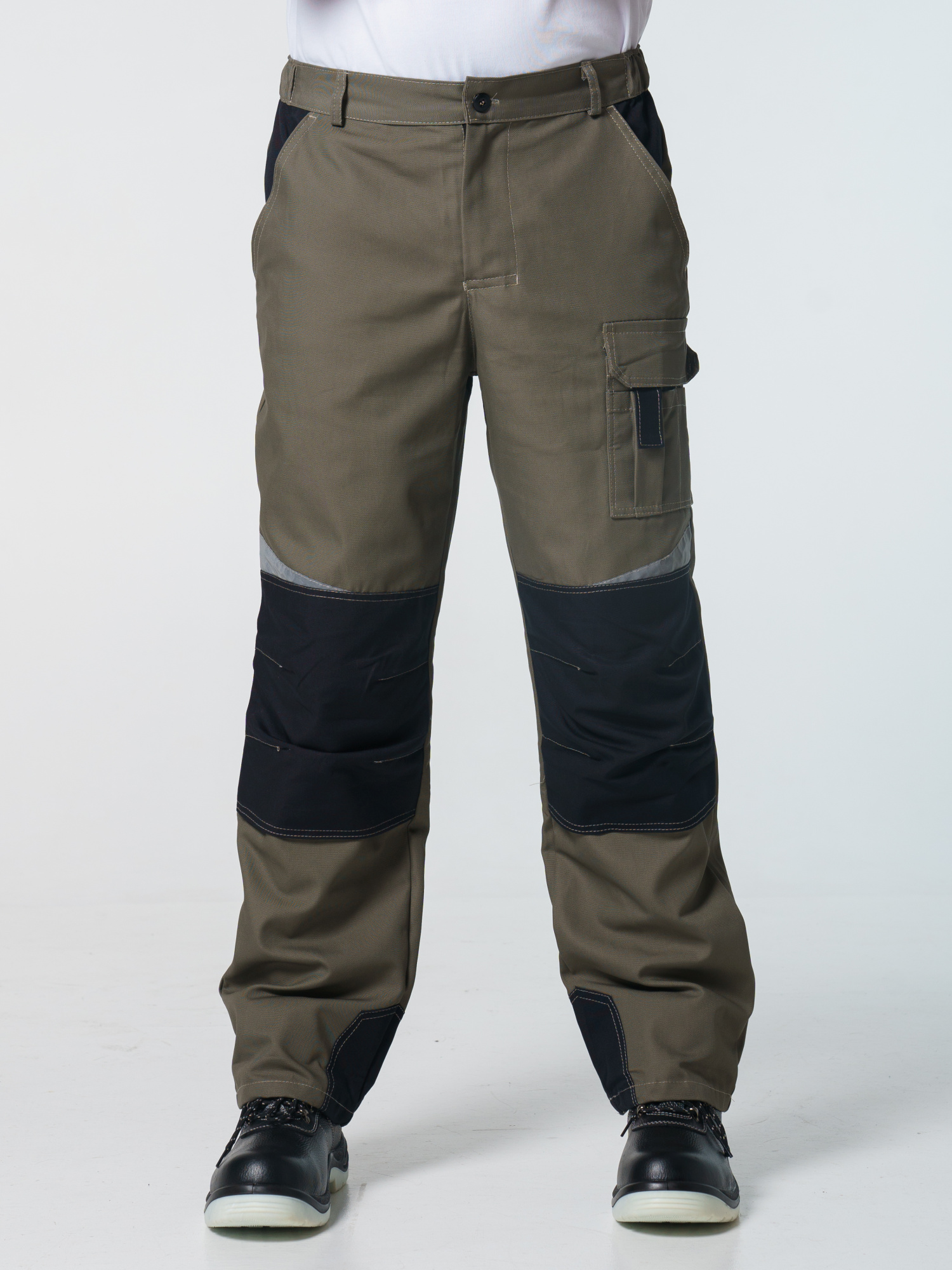 Брюки ФАВОРИТ-МЕГА прямые; с застёжкой гульфика на тесьму - «молния»; с застежкой пояса на одну петлю и пуговицу; с боковыми внутренними карманами; с карманами и фигурными клапанами застегивающиеся на потайную липучку на боковом шве; с фигурным карманом на задней половинке; с карманами под инструменты; с наколенниками. Пояс брюк частично стянут резинкой ткацкой по бокам. В брюках предусмотрена лента светоотражающая (мелкодисперсная белая) 50 мм фигурной формы.