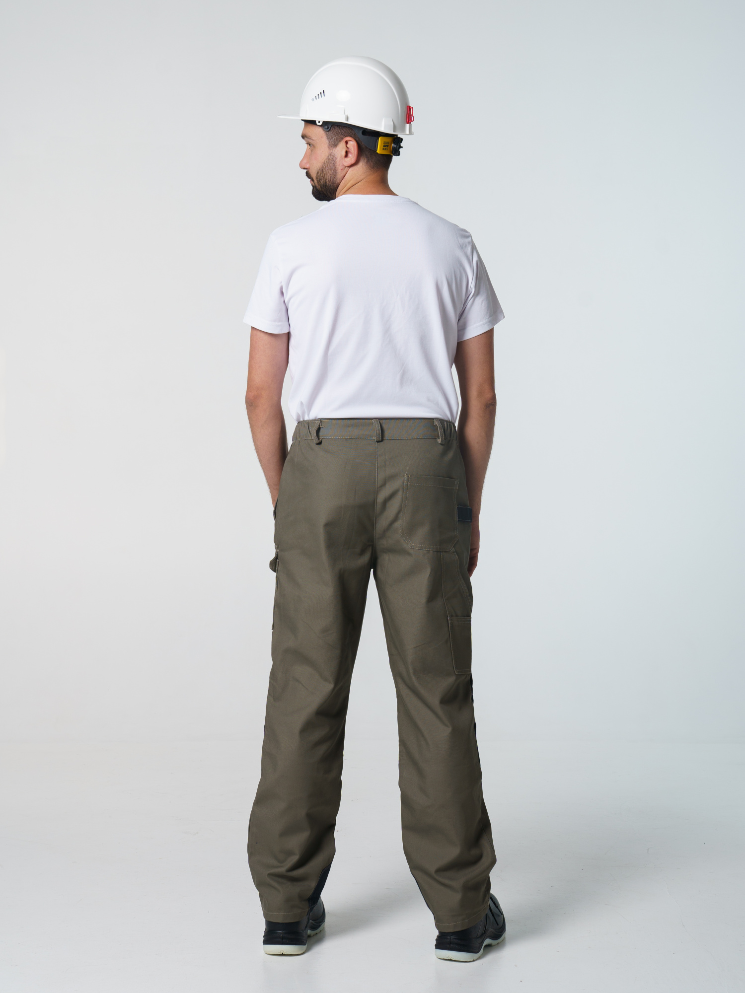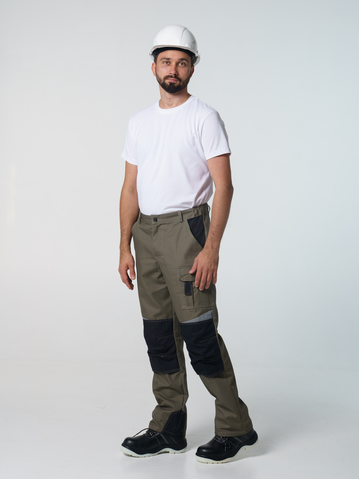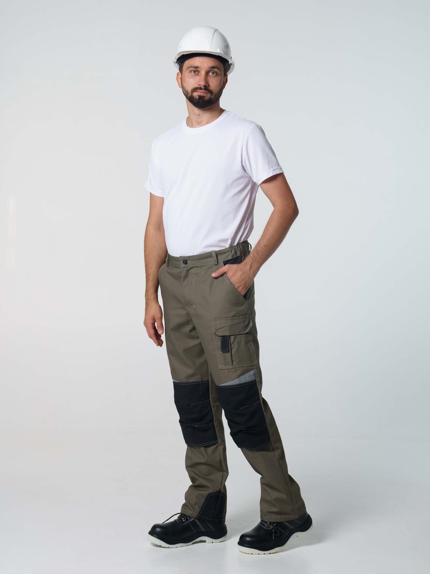 Брюки ФАВОРИТ-МЕГА прямые; с застёжкой гульфика на тесьму - «молния»; с застежкой пояса на одну петлю и пуговицу; с боковыми внутренними карманами; с карманами и фигурными клапанами застегивающиеся на потайную липучку на боковом шве; с фигурным карманом на задней половинке; с карманами под инструменты; с наколенниками. Пояс брюк частично стянут резинкой ткацкой по бокам. В брюках предусмотрена лента светоотражающая (мелкодисперсная белая) 50 мм фигурной формы.