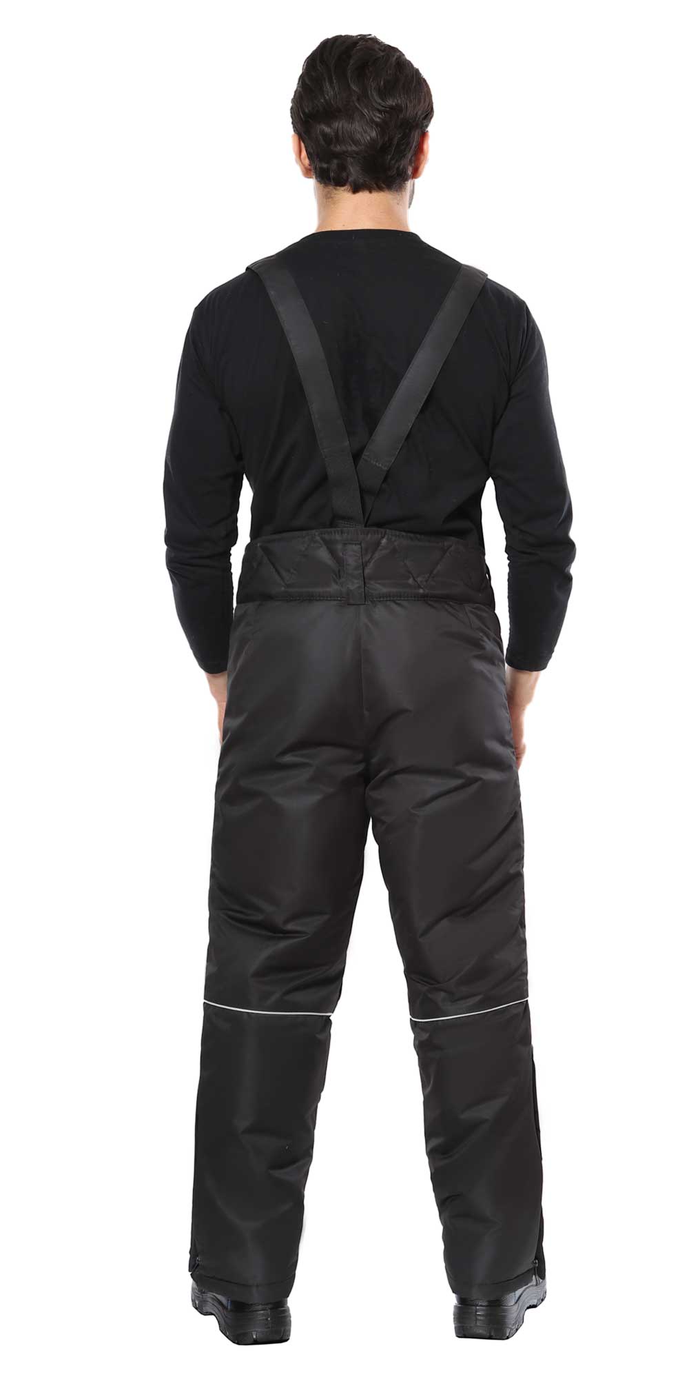 Брюки прямые на утеплённой подкладке, с застежкой спереди на молнию – гульфик. Брюки с широким поясом с застежкой на 2 пуговицы, с боковыми накладными карманами с молнией, со съёмными бретелями. Бретели пристегиваются к брюкам при помощи пуговиц и петель, регулируются по длине защелками-фастексами. По боковым швам внизу разрез с молнией. В брюках на задних половинках предусмотрен кант СВМ 3мм 100К для обозначения сигнальной видимости.