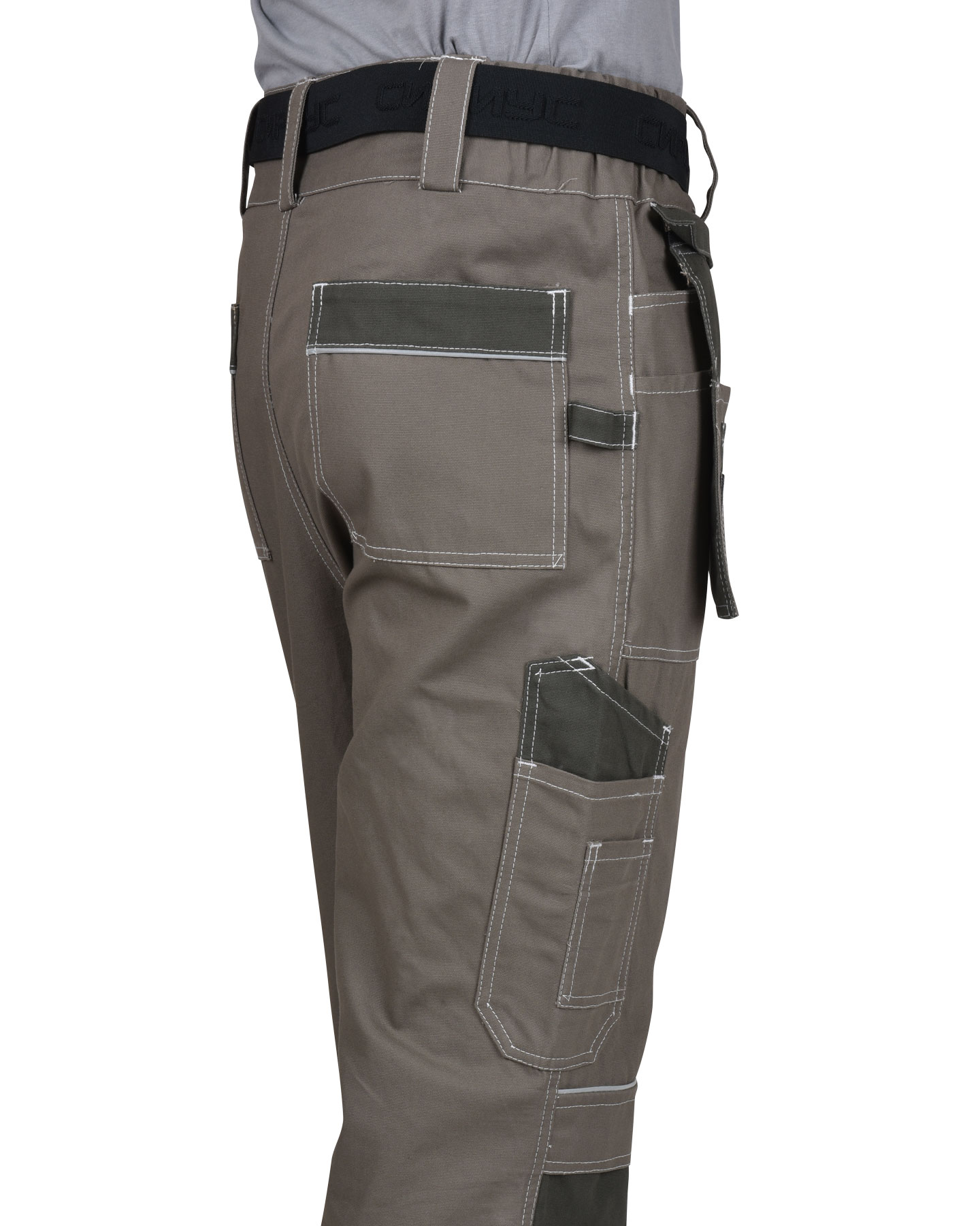 Брюки выполнены из ткани "Канвас Комфорт", прямого силуэта, с притачным поясом, с застежкой гульфика на тесьму – «молния», с различными многофункциональными карманами и объёмными наколенниками. В брюках предусмотрен ремень из резинки ременной «Сириус» застегивающийся на защелку-фастекс.