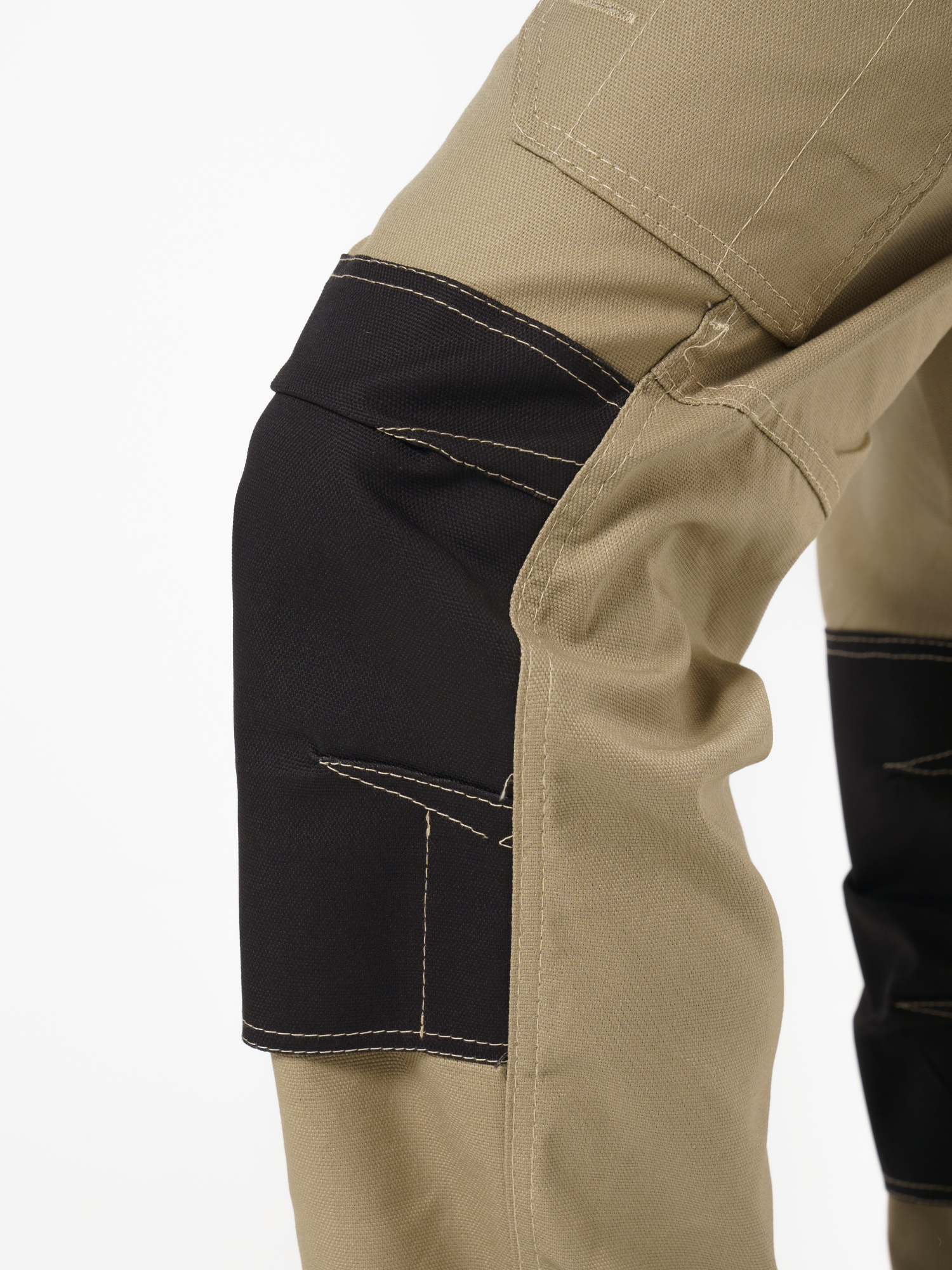Брюки с притачным поясом, застегивающимся на джинсовую пуговицу и с регулировкой ширины пояса при помощи пат и кнопок, с накладными карманами и объемными наколенниками с возможностью вставить в них объемные щитки