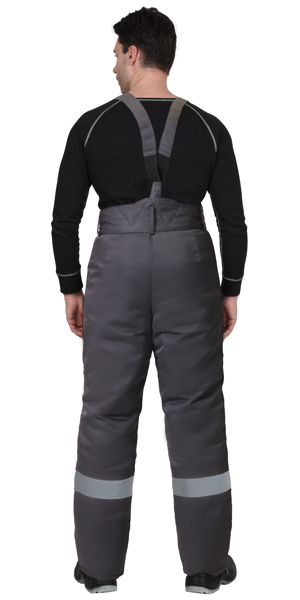 Брюки прямые на утеплённой подкладке, с застежкой спереди на молнию – гульфик. Брюки с широким поясом с застежкой на 2 пуговицы, с боковыми накладными карманами, со съёмными бретелями. Бретели пристегиваются к брюкам при помощи пуговиц и петель, регулируются по длине защелками-фастексами. По низу брюк предусмотрена лента светоотражающая ш.50 мм для обозначения сигнальной видимости в тёмное время суток.