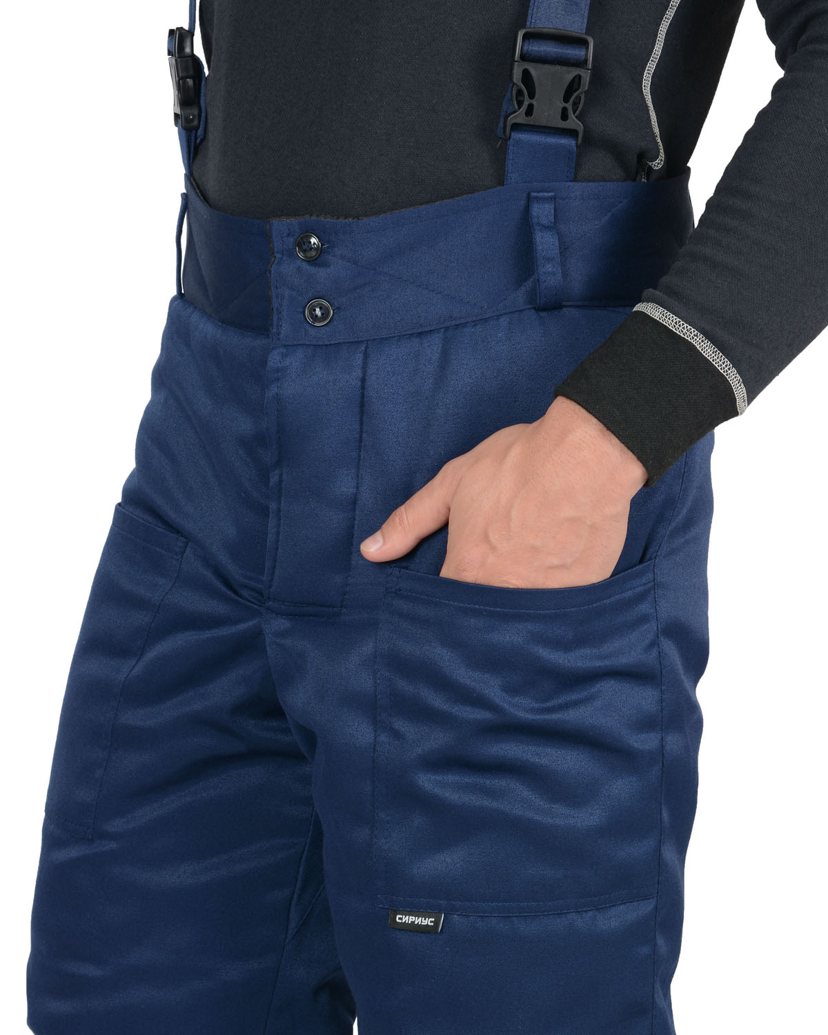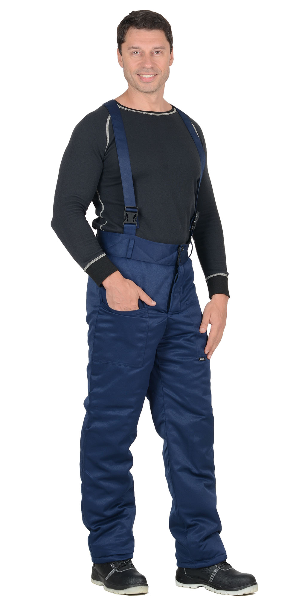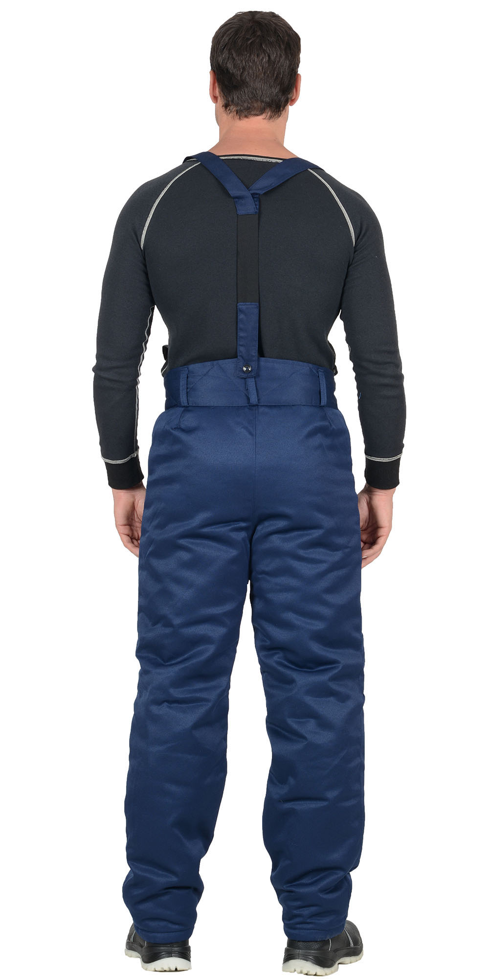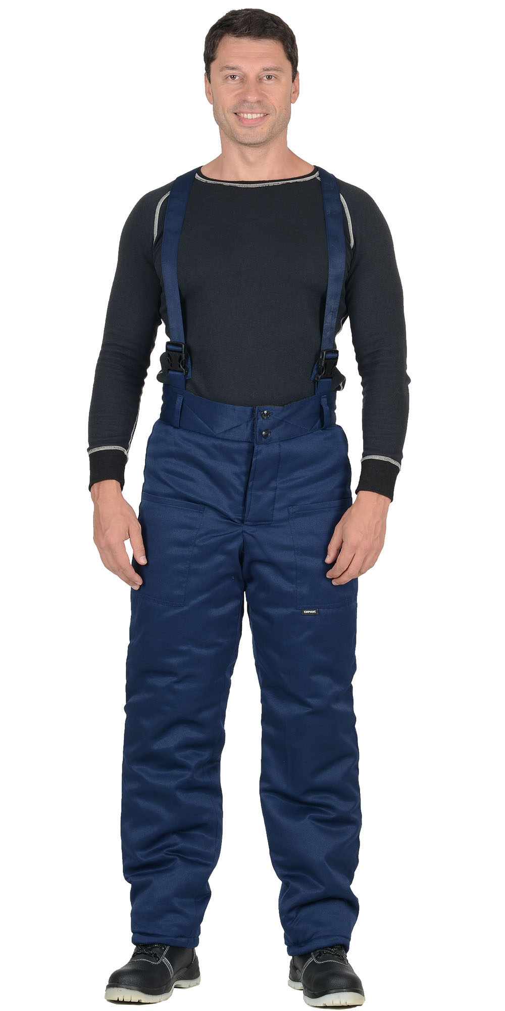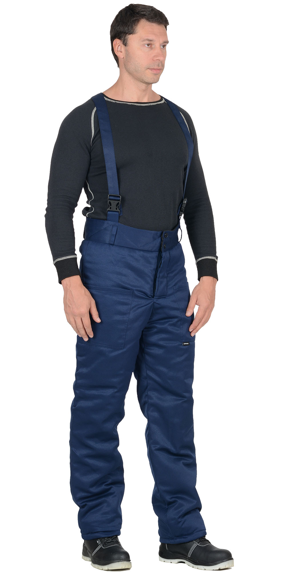 Брюки прямые, с накладными карманами, на притачной утеплённой подкладке, с застёжкой гульфика на молнию. Брюки с широким притачным поясом с застежкой на петли и пуговицы, с бретелями. Бретели съемные, пристегиваются к брюкам при помощи пуговиц и петель, регулируются защелками-фастексами.
