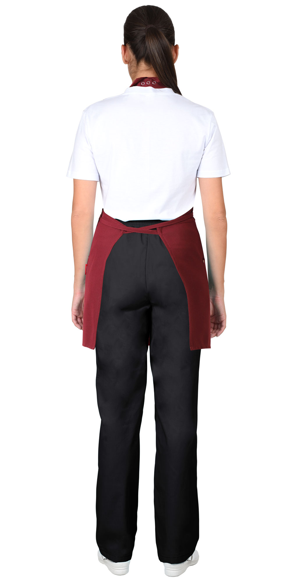 Фартук предназначен для защиты переда и боковых частей работающих от вредных производственных факторов в сфере обслуживания. Фартук с цельновыкроенным нагрудником с центральной бортовой сквозной застёжкой на 8 кнопок и прямой линией низа. Боковые завязки для регулировки фартука на фигуре по объему. Воротник втачной застёгивающийся сзади на 3 кнопки для регулировки фартука по шее. На нижние боковые части фартука настрочены накладные карманы.