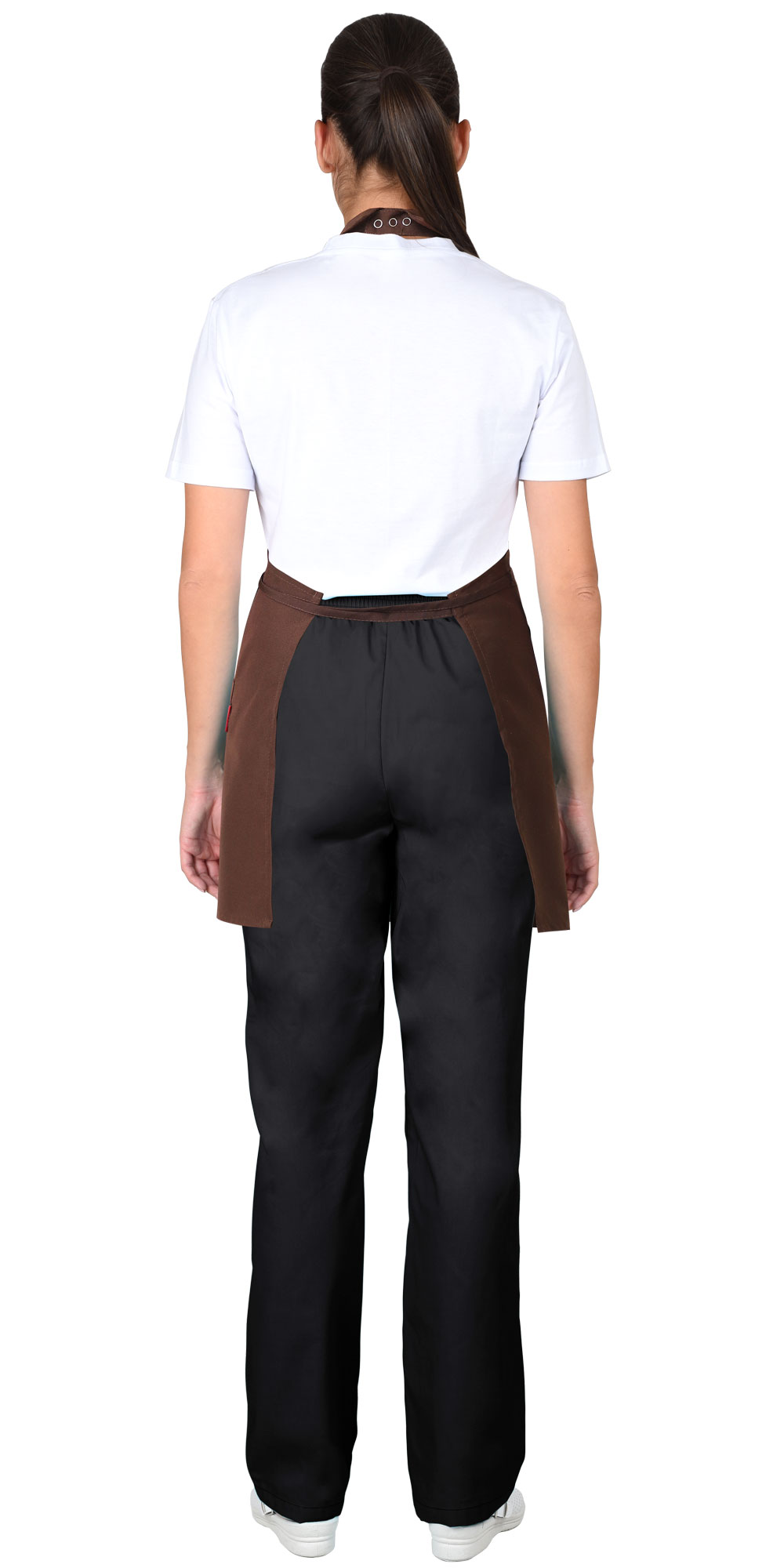 Фартук предназначен для защиты переда и боковых частей работающих от вредных производственных факторов в сфере обслуживания. Фартук с цельновыкроенным нагрудником с центральной бортовой сквозной застёжкой на 8 кнопок и прямой линией низа. Боковые завязки для регулировки фартука на фигуре по объему. Воротник втачной застёгивающийся сзади на 3 кнопки для регулировки фартука по шее. На нижние боковые части фартука настрочены накладные карманы.