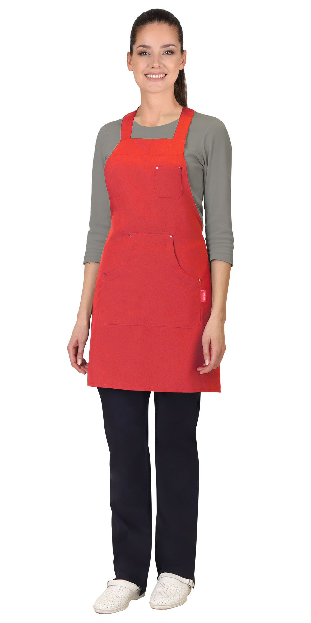 Фартук с цельновыкроенным нагрудником, с прямой линией низа и прямыми боковыми сторонами, с боковыми завязками для регулировки фартука на фигуре по объему, и с шейной бретелью, застёгивающейся сзади на 3 кнопки справа налево для регулировки длины бретели по горловине. Боковые бретели входят в шов подгибки боковых сторон фартука, шейные бретели - в шов обтачивания верхнего среза фартука. По центру полотна фартука накладной фигурный карман с двумя боковыми входами овальной формы. Входы в карман обтачаны обтачкой. По концам входа в карманы установлены хольнитены.