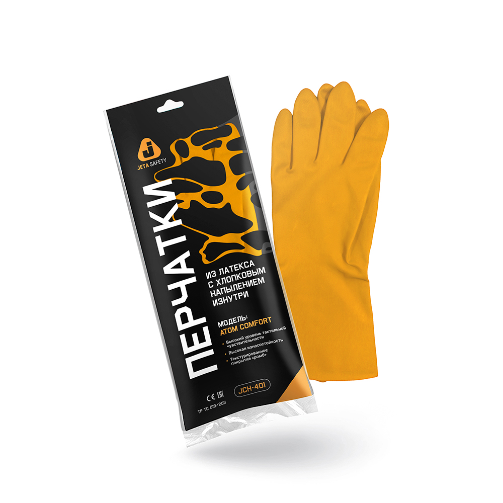 JETA SAFETY JCH-401 Atom Comfort — латексные перчатки с хлопковым напылением изнутри. Предназначены для работ со смолами, растворителями, кислотами, солями; подходят для сборки обезжиренных деталей, химической обработки поверхностей, промышленного клининга, окрашивания распылителем, технического обслуживания, чистки и обезжиривания с использованием химических веществ.