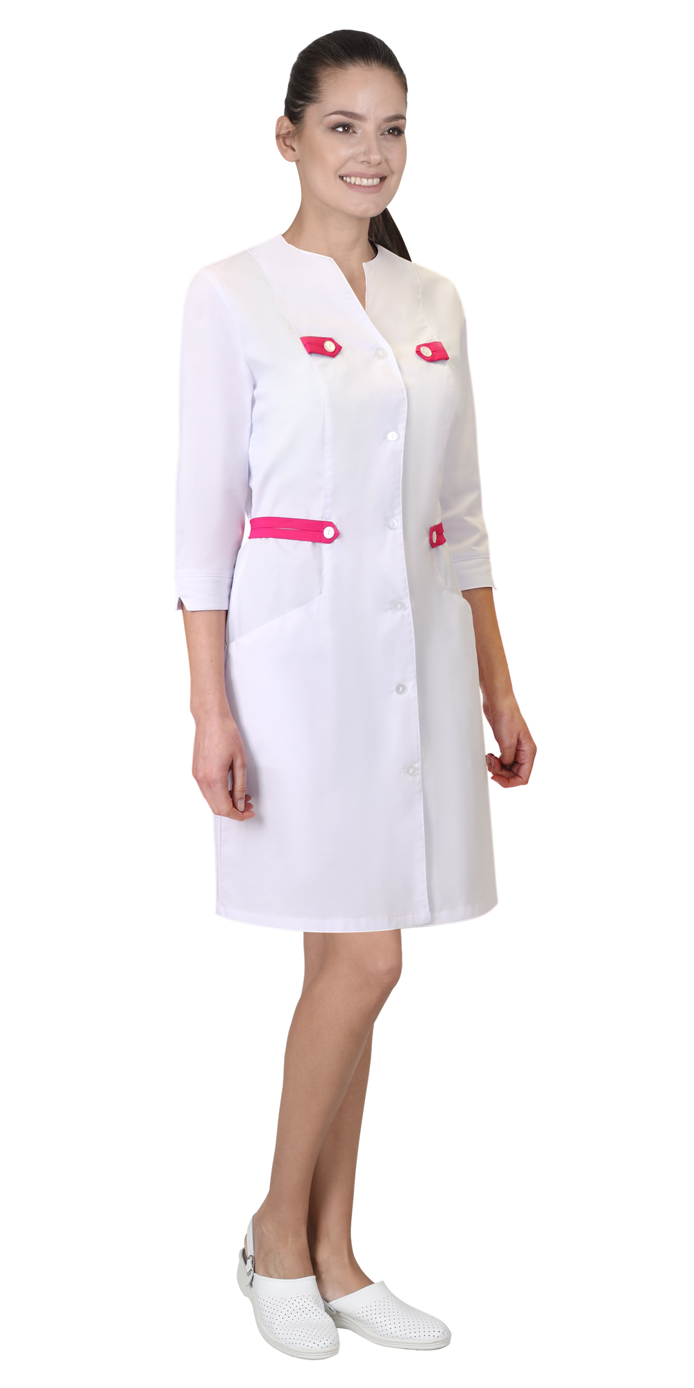 Халат "БРАЙТЛИ" женский белый с фуксией, тк.Твил стрейч (ЧЗ)