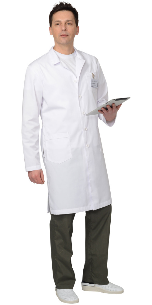 Халат мужской предназначен для медицинского персонала. Халат прямого силуэта, с центральной бортовой застежкой на пять петель и пуговиц, с отложным воротником и лацканом, с втачными длинными рукавами, с верхним нагрудным карманом на левой полочке и двумя нижними накладными карманами, по линии талии на спинке хлястик на пряжке и пуговицах. Халат с боковыми разрезами. Особенностью модели являются разрезы в боковых швах для свободного проникновения рук в брючные карманы.