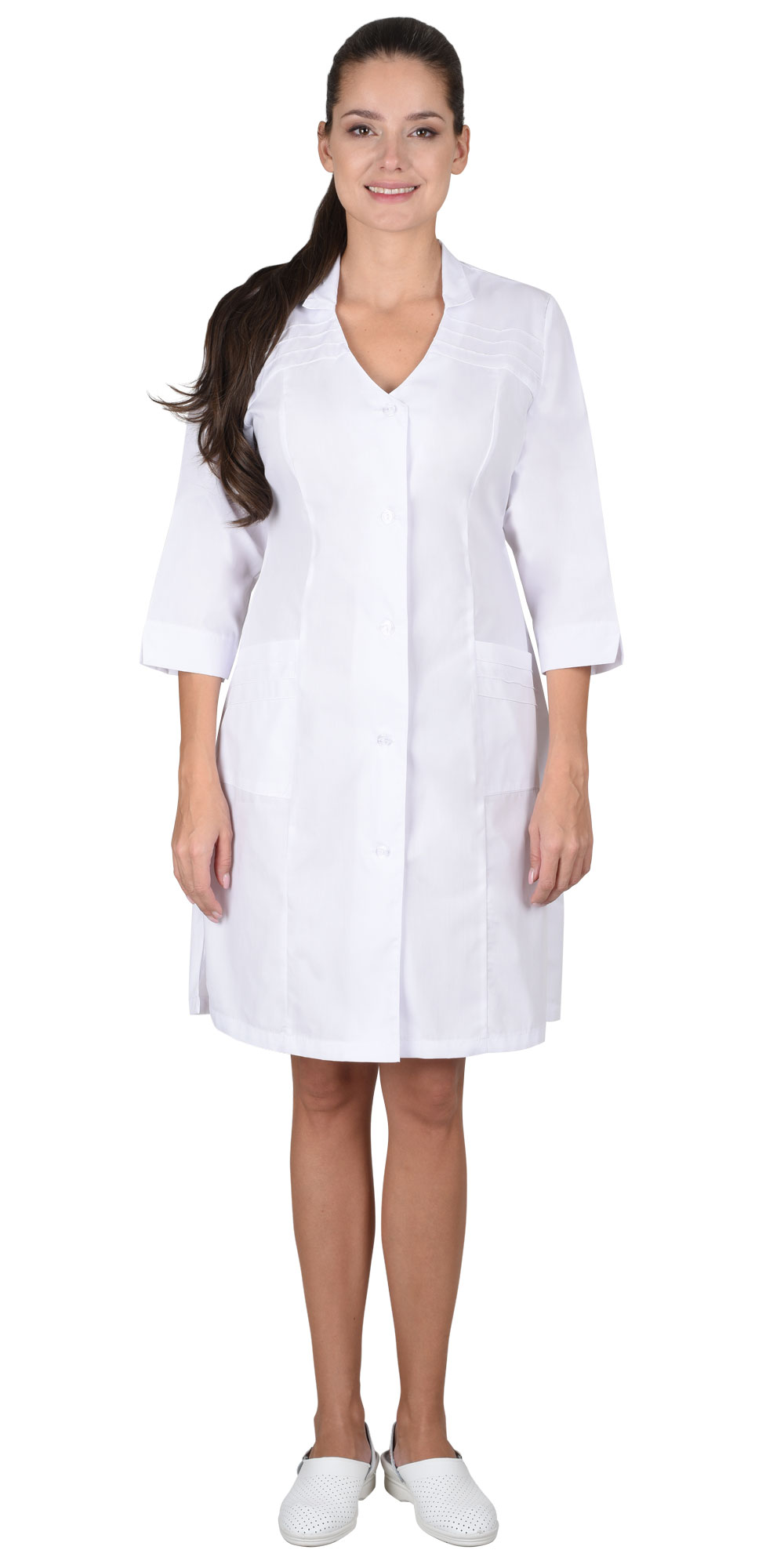 Укороченный халат полуприлегающего силуэта. Особенность модели-декоративные защипы по кокеткам и на карманах. Воротник-стойка. Рукава 3/4 с фигурным разрезом.
