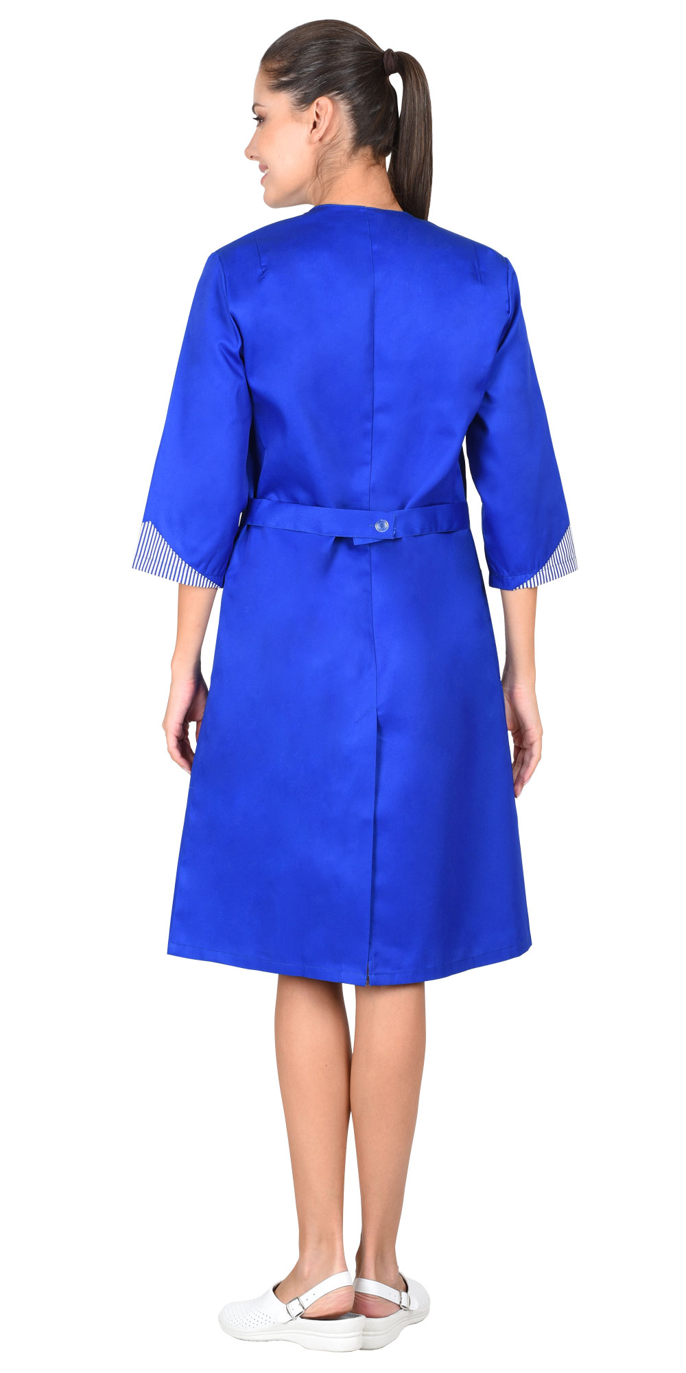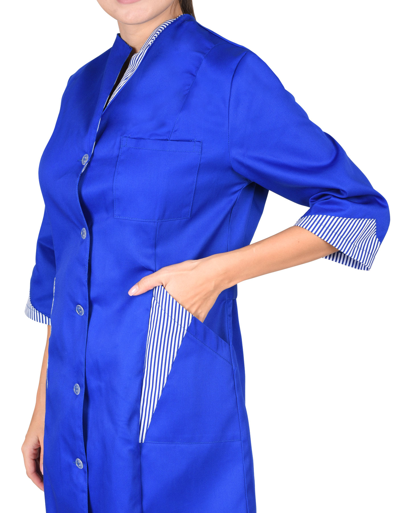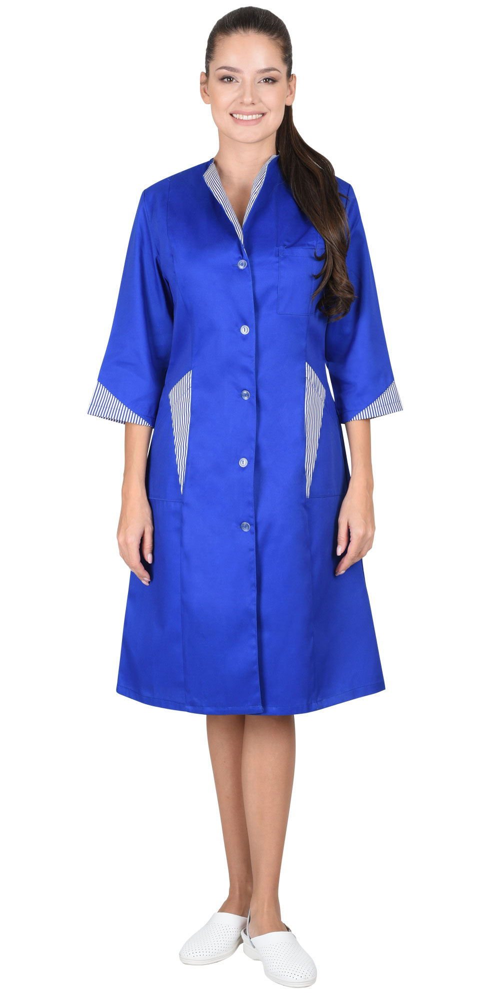 Халат полуприлегающего силуэта, слегка расширенный к низу. Застёжка на пуговицы, рельефы. Воротник, часть нижних карманов и низ рукавов 3/4 из отделочной ткани.