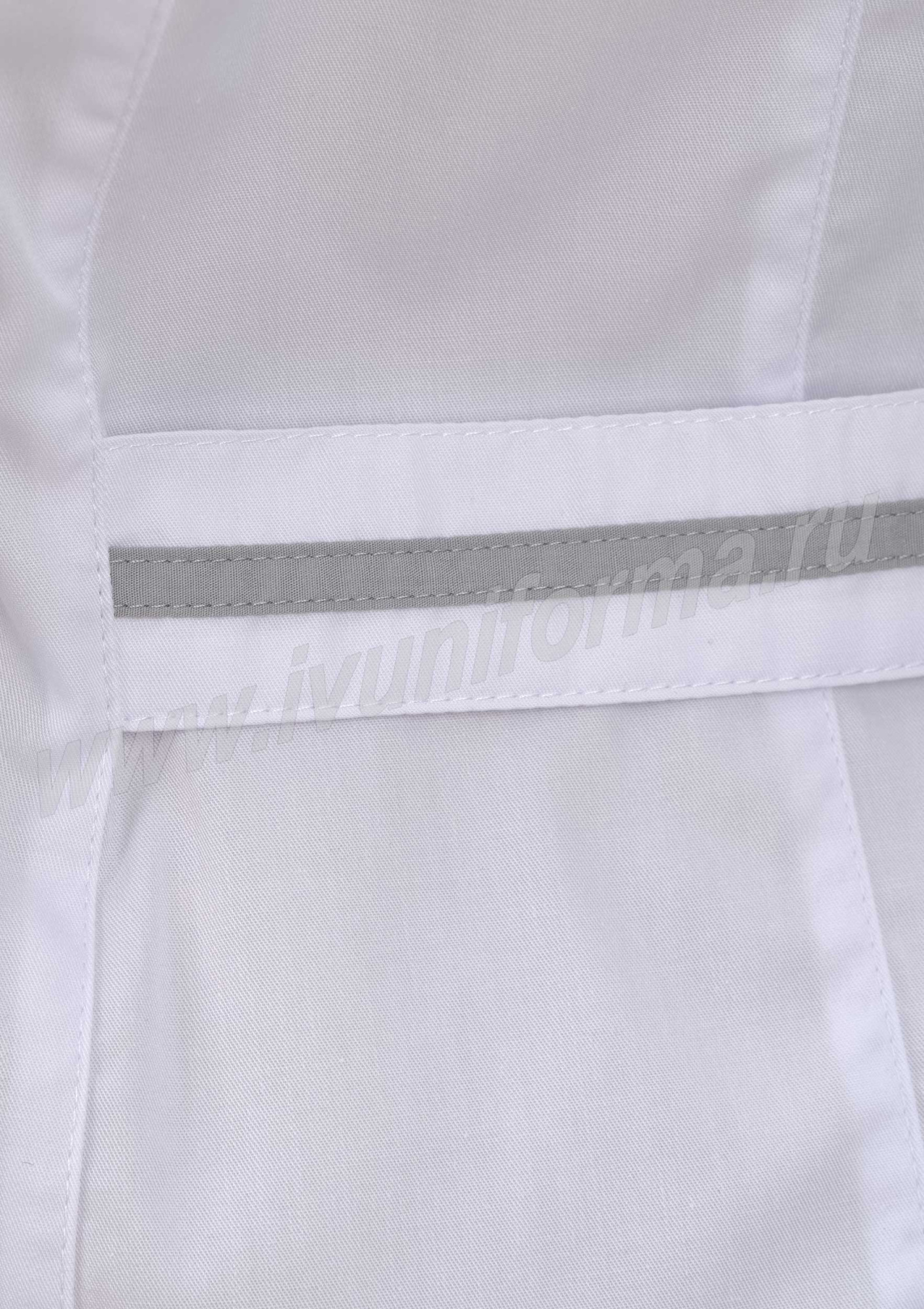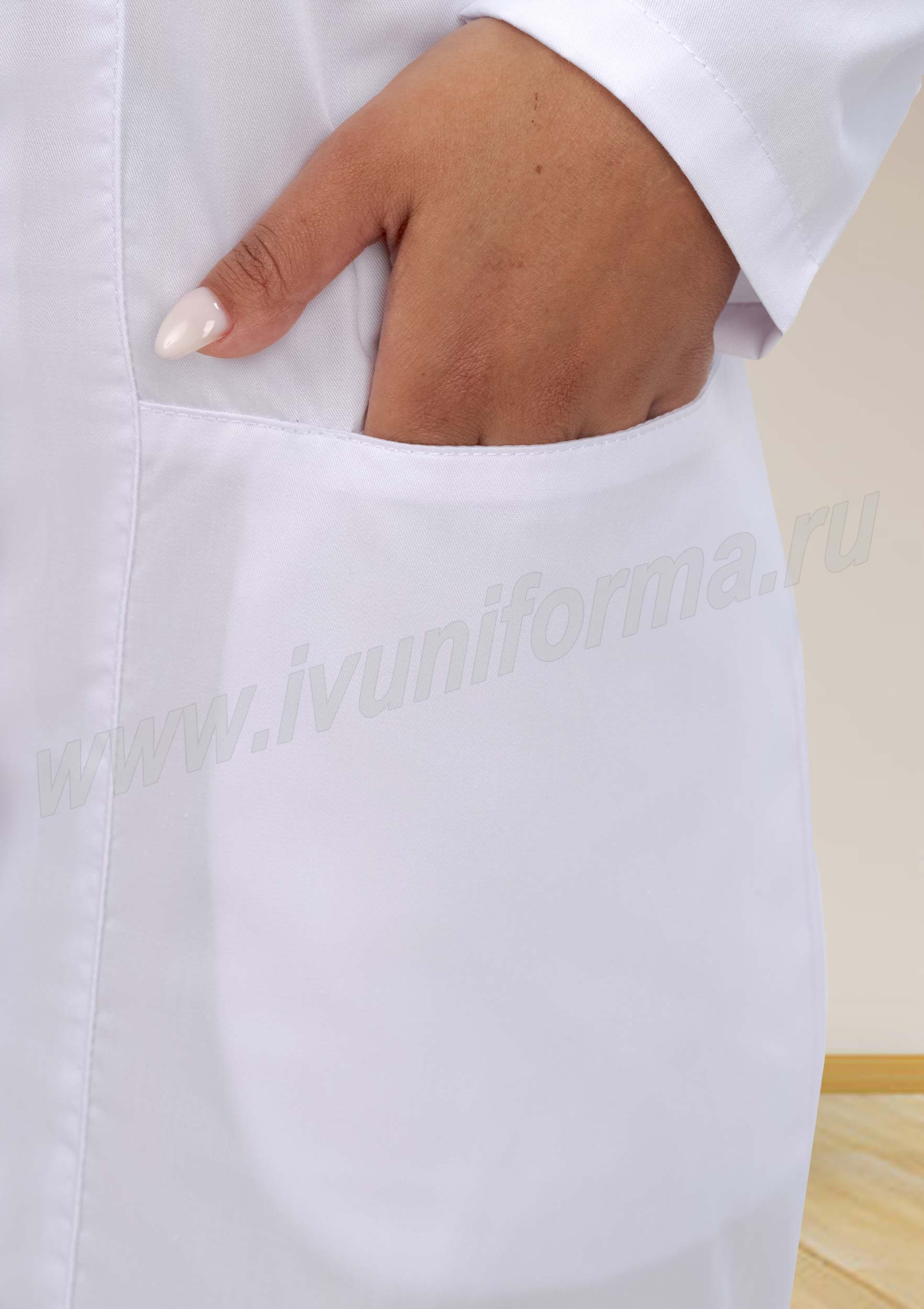 Халат женский полуприлегающего силуэта с центральной бортовой застежкой на кнопки, переходящей в фигурный вырез. На полочке два нагрудных и два нижних кармана. Воротник -стойка, рукав втачной, длинный. Изящное прилегание халата достигается за счет рельефов и отрезного шва ниже талии. Вдоль стойки, по нагрудным карманам и хлясту проходит контрастная тесьма. Халат предназначен для медицинских работников.