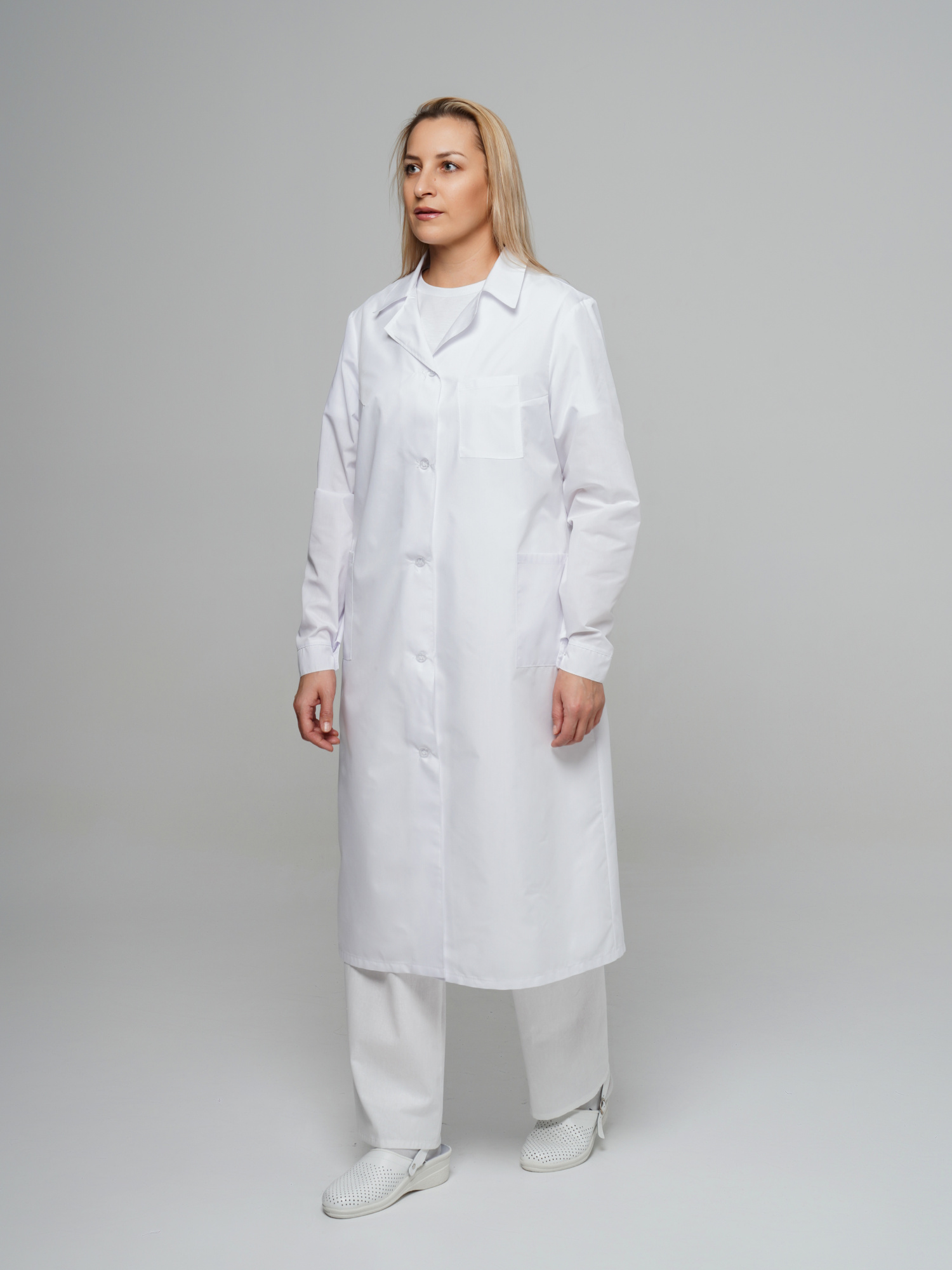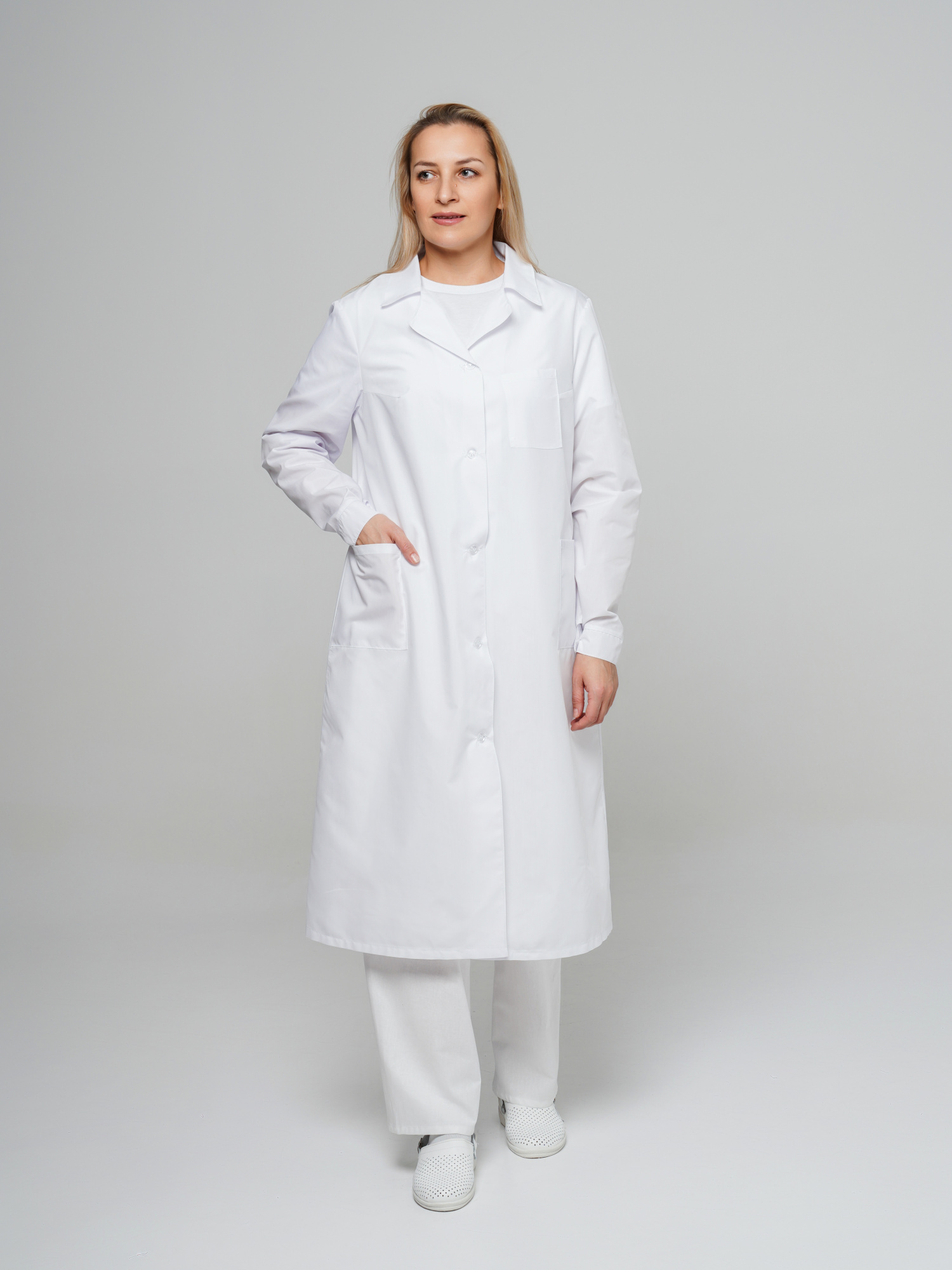 Халат рабочий женский №203 отбеленный, ткань ТИСИ (ЧЗ) (112-116/194-200)