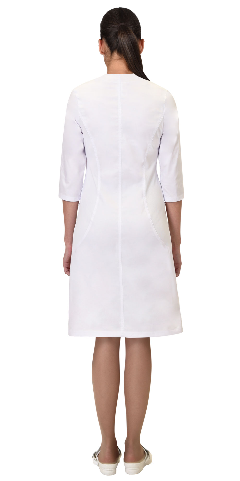 Халат полуприлегающего силуэта с центральной застёжкой на кнопки. Фигурный вырез горловины, без воротника. Рукава втачные, длинной 3/4. Боковые детали халата и два накладных карманы выполнены из трикотажной сетки.