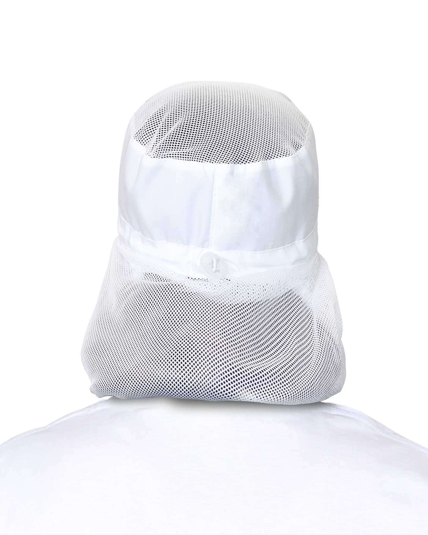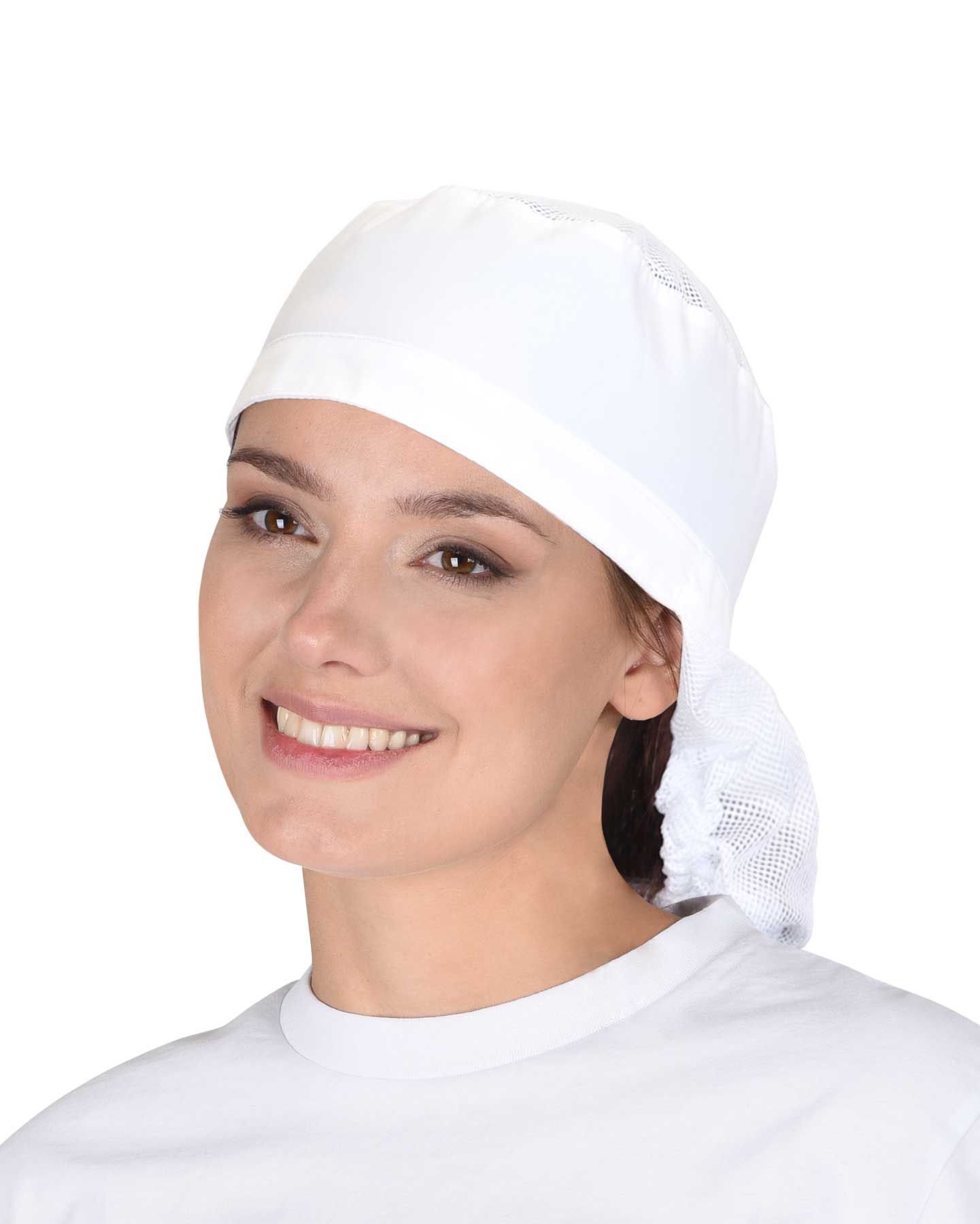 Колпак комбинированный, изготовлен из двух видов материала. Верх головного убора выполнен из трикотажной вставки для дополнительного воздухообмена. Объем по окружности головы регулируется кулиской со стопором. Сзади «мешочек» для волос из трикотажной сетки.