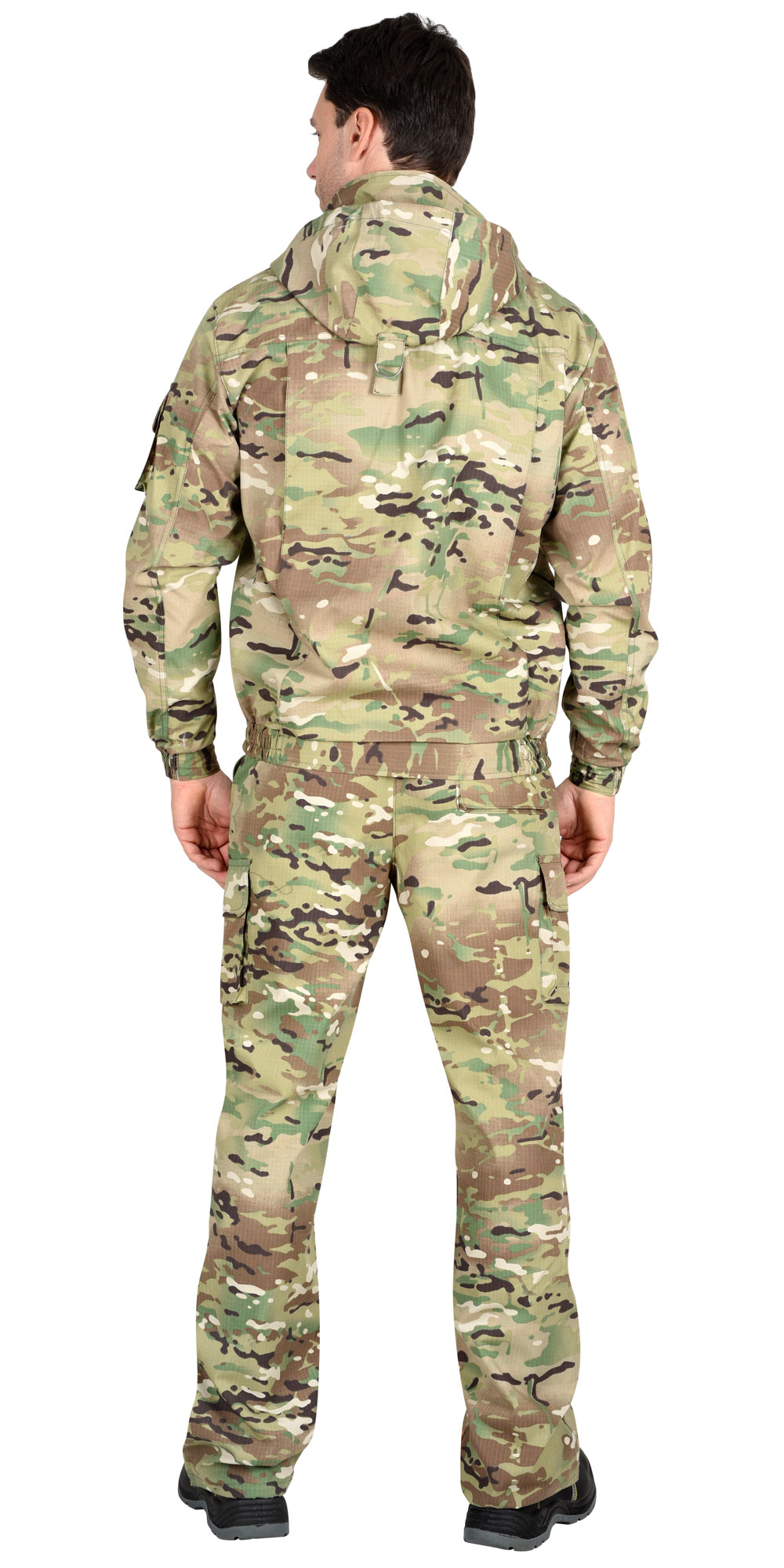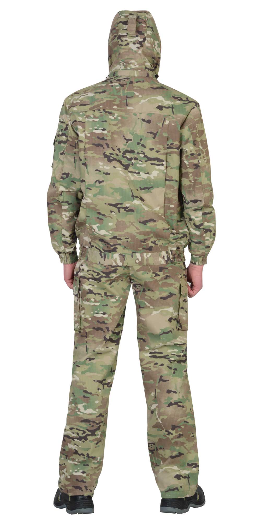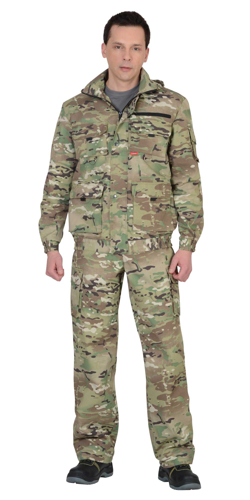 Куртка короткая, прямого силуэта, с центральной застёжкой на молнию накрытой ветрозащитным клапаном, воротник стойка, пристёгивающимся капюшоном, различными многофункциональными накладными карманами с клапанами. Рукава с манжетами и патой регулирующий ширину. Низ куртки с притачным поясом стянутым, частично, резинкой.Брюки прямые с притачным поясом стянутым, частично резинкой и застёгивающимся на пуговицу, со шлёвками, застёжкой гульфика на молнию, с различными функциональными карманами. Низ брюк регулируется эластичным шнуром.Ткань: "Рип-Стоп", ВО, 65% п/э., 35% х/б, 215 г/кв.м.ГОСТ 12.4.280-2014