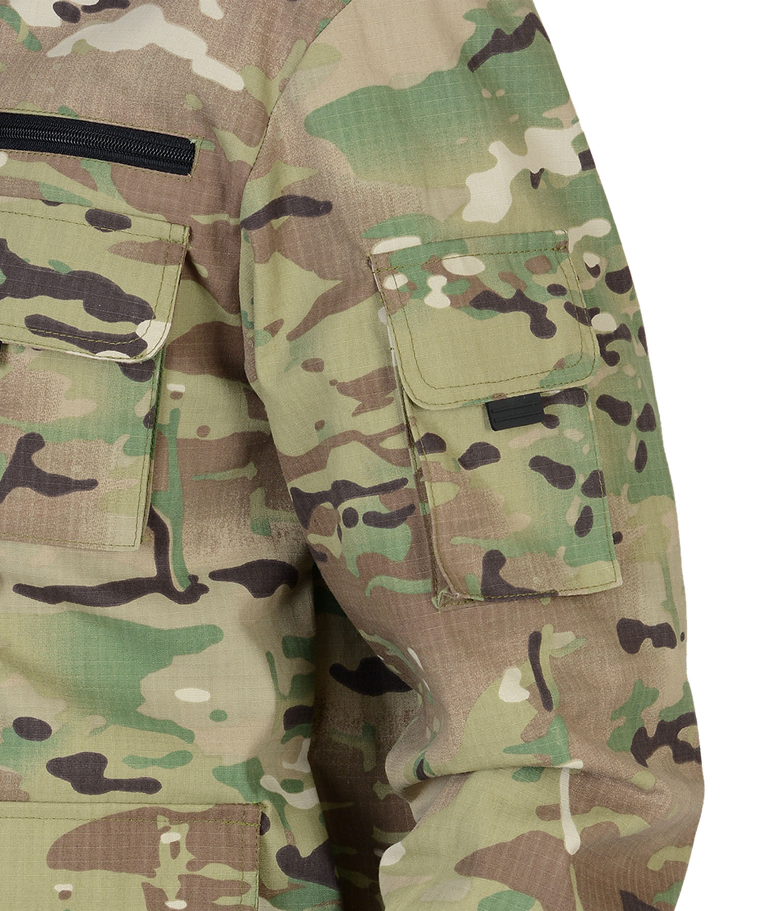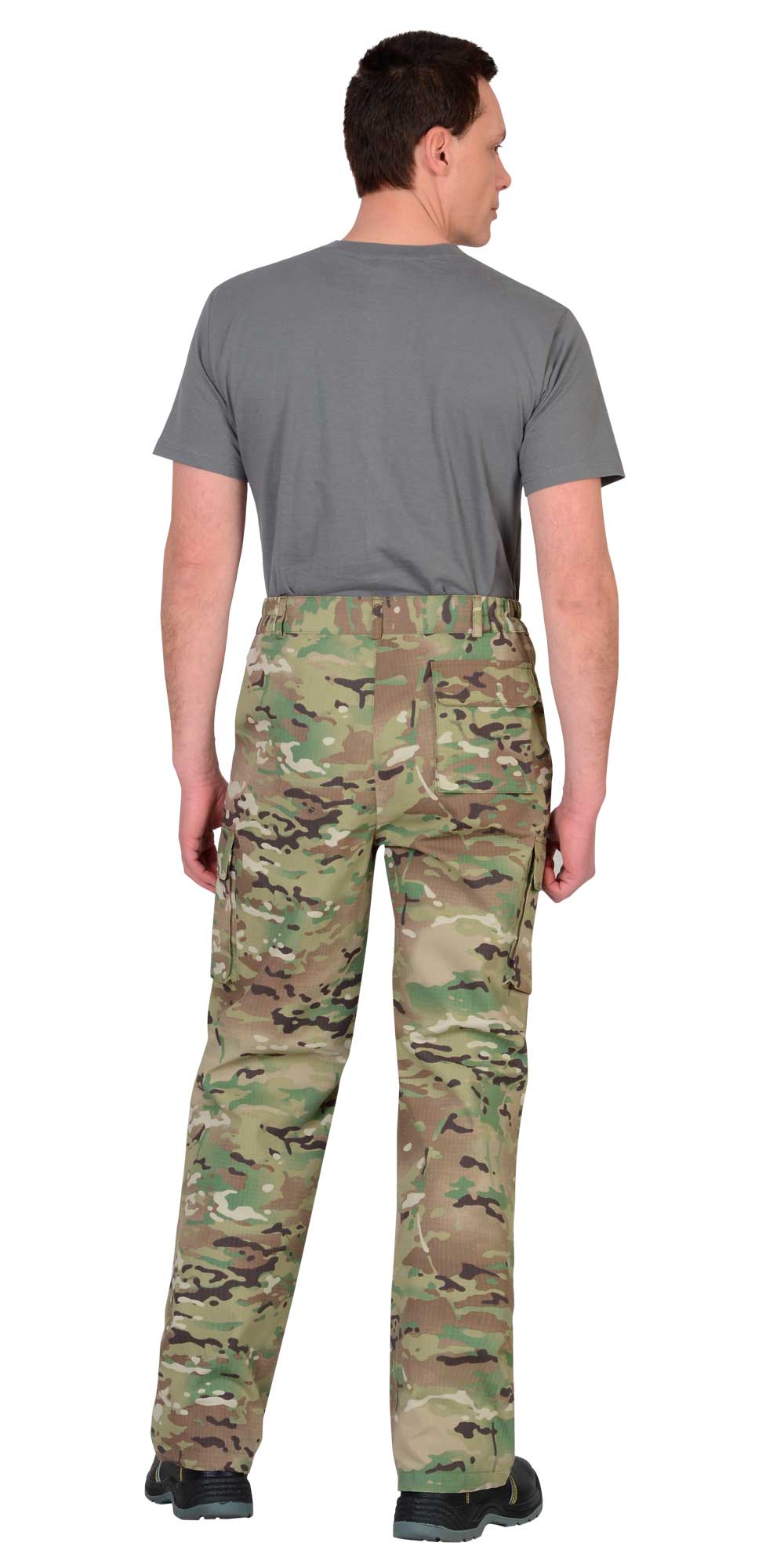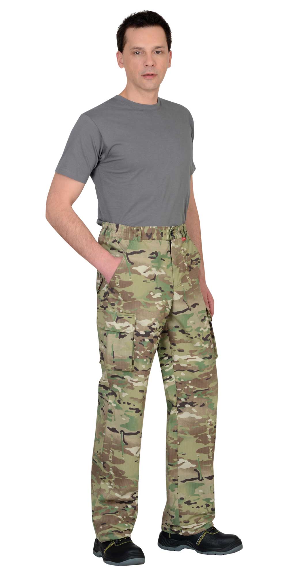 Куртка короткая, прямого силуэта, с центральной застёжкой на молнию накрытой ветрозащитным клапаном, воротник стойка, пристёгивающимся капюшоном, различными многофункциональными накладными карманами с клапанами. Рукава с манжетами и патой регулирующий ширину. Низ куртки с притачным поясом стянутым, частично, резинкой.Брюки прямые с притачным поясом стянутым, частично резинкой и застёгивающимся на пуговицу, со шлёвками, застёжкой гульфика на молнию, с различными функциональными карманами. Низ брюк регулируется эластичным шнуром.Ткань: "Рип-Стоп", ВО, 65% п/э., 35% х/б, 215 г/кв.м.ГОСТ 12.4.280-2014