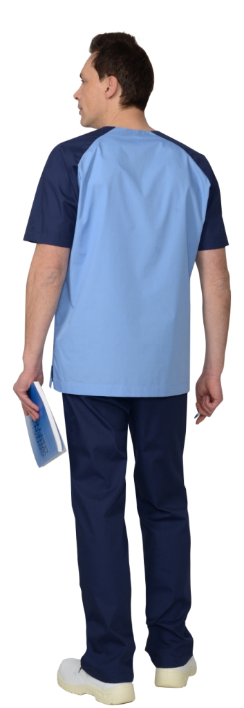 Костюм состоит из куртки и брюк. Куртка прямого покроя; с боковыми разрезами, с V-образным вырезом горловины и верхним левым нагрудным накладным карманом с делением для ручки. Рукава реглан, короткие. Брюки прямого покроя с внутренними боковыми карманами, пояс притачной, частично стянут на эластичную тесьму. Костюм можно дополнительно укомплектовать колпаком.