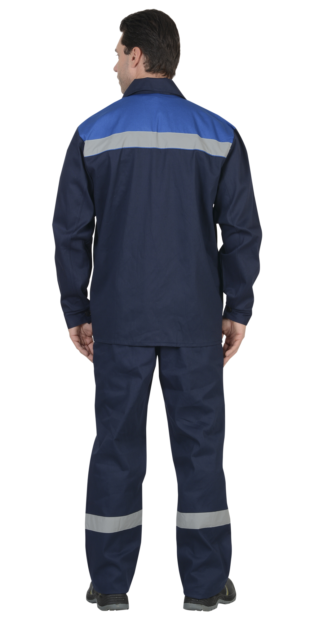 Куртка длинная, прямого силуэта с 3-мя накладными карманами с клапанами, с застежкой на пуговицы, Рукава с манжетами на пуговицах. С СОП- 50 мм по кокетке. Брюки прямого покроя с боковыми накладными карманами, на каждой брючине СОП-50мм. ГОСТ 12.4.280-2014.