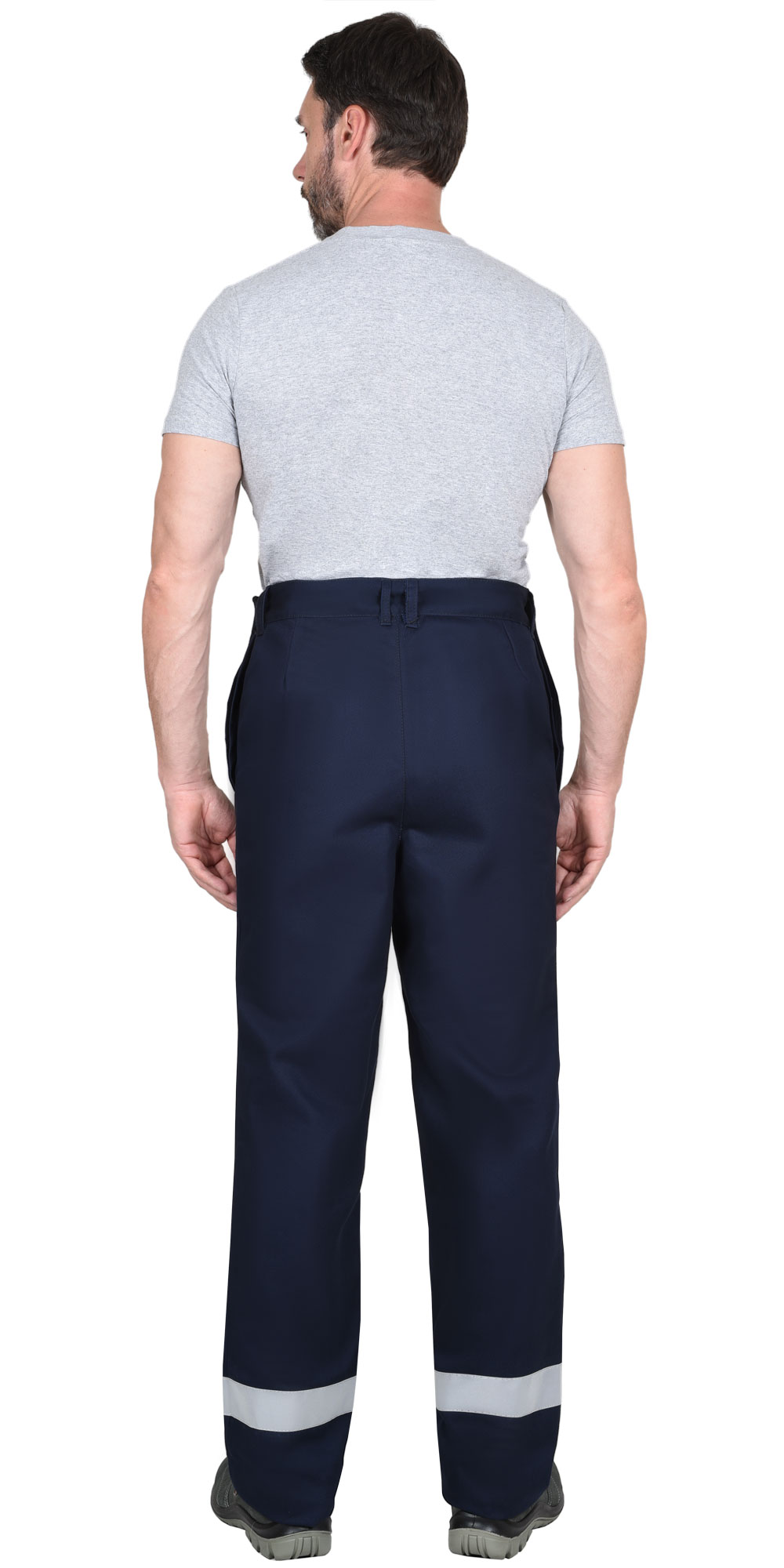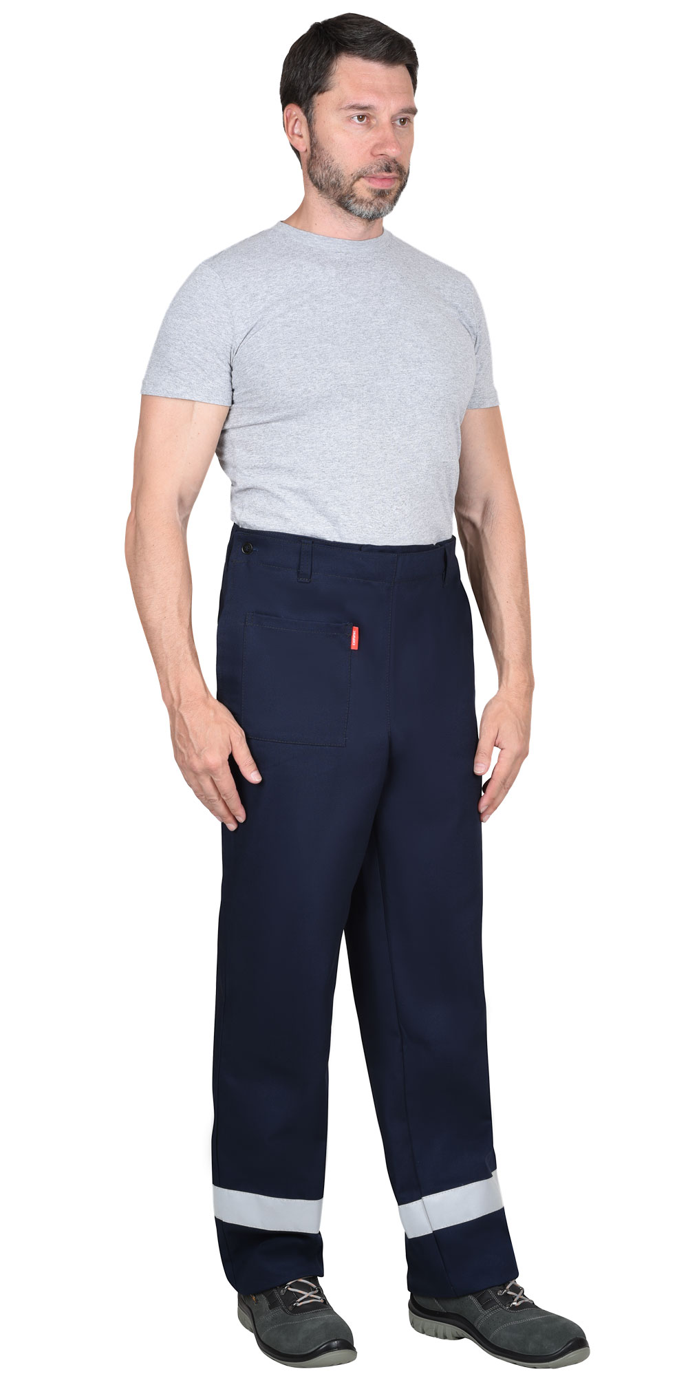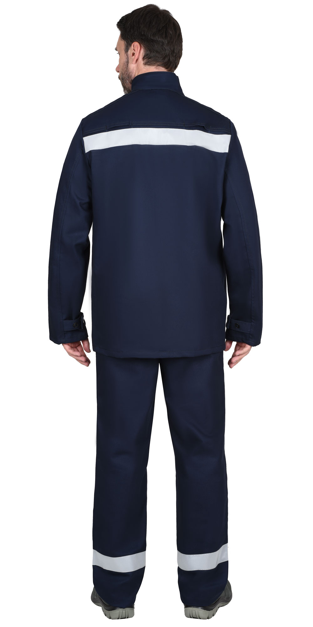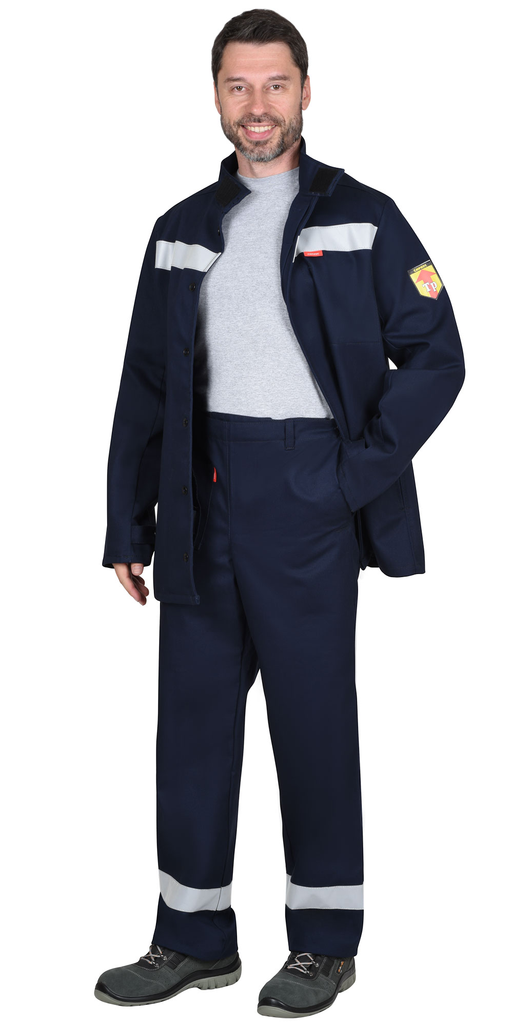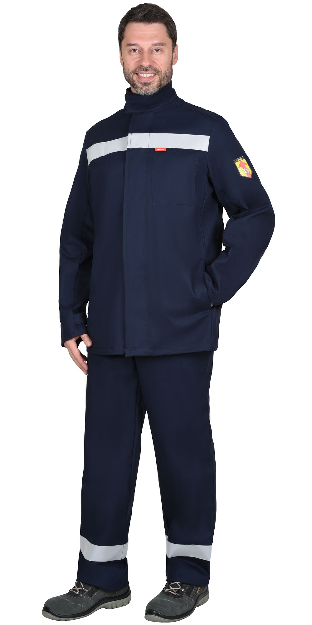 Ткань верха: "FIRE RESISTANT (FR 330)" состав: 100х/б с огнестойкой отделкой. Цвет: темно-синий.Куртка прямая, удлинённая с центральной бортовой супатной застёжкой на шесть обметанных петель и пуговиц, с отложным воротником, с нижними карманами в рельефах, с внутренним нагрудным карманом на левой полочке, отверстиями для воздухообмена под проймами на спинке и на полочках, на кокетке. Рукава втачные, по низу рукава хлястики, застегивающиеся на пуговицы. В куртке предусмотрен СОП шириной 50мм огнестойкий для обозначения сигнальной видимости. Детали: пояс передний половинки, пояс задней половинки, мешковина кармана куртки, мешковина кармана брюк, внутренний карман.Костюм 1 класс защиты, предназначенный для защиты работающих от повышенных температур, для эксплуатации на расстоянии до источника брызг металла, окалины не менее 2 м., кратковременным воздействием открытого пламени, контактом с нагретыми поверхностями или сочетанием перечисленных тепловых факторов.Брюки прямые, с притачным поясом на задних половинках застегивающийся на пуговицы, с цельновыкроенным поясом на передних половинках, с 6 шлевками, с карманами в боковых швах, с накладным карманом на правой передней половинке, с вытачками на задних половинках. В брюках предусмотрен СОП шириной 50мм огнестойкий для обозначения сигнальной видимости.