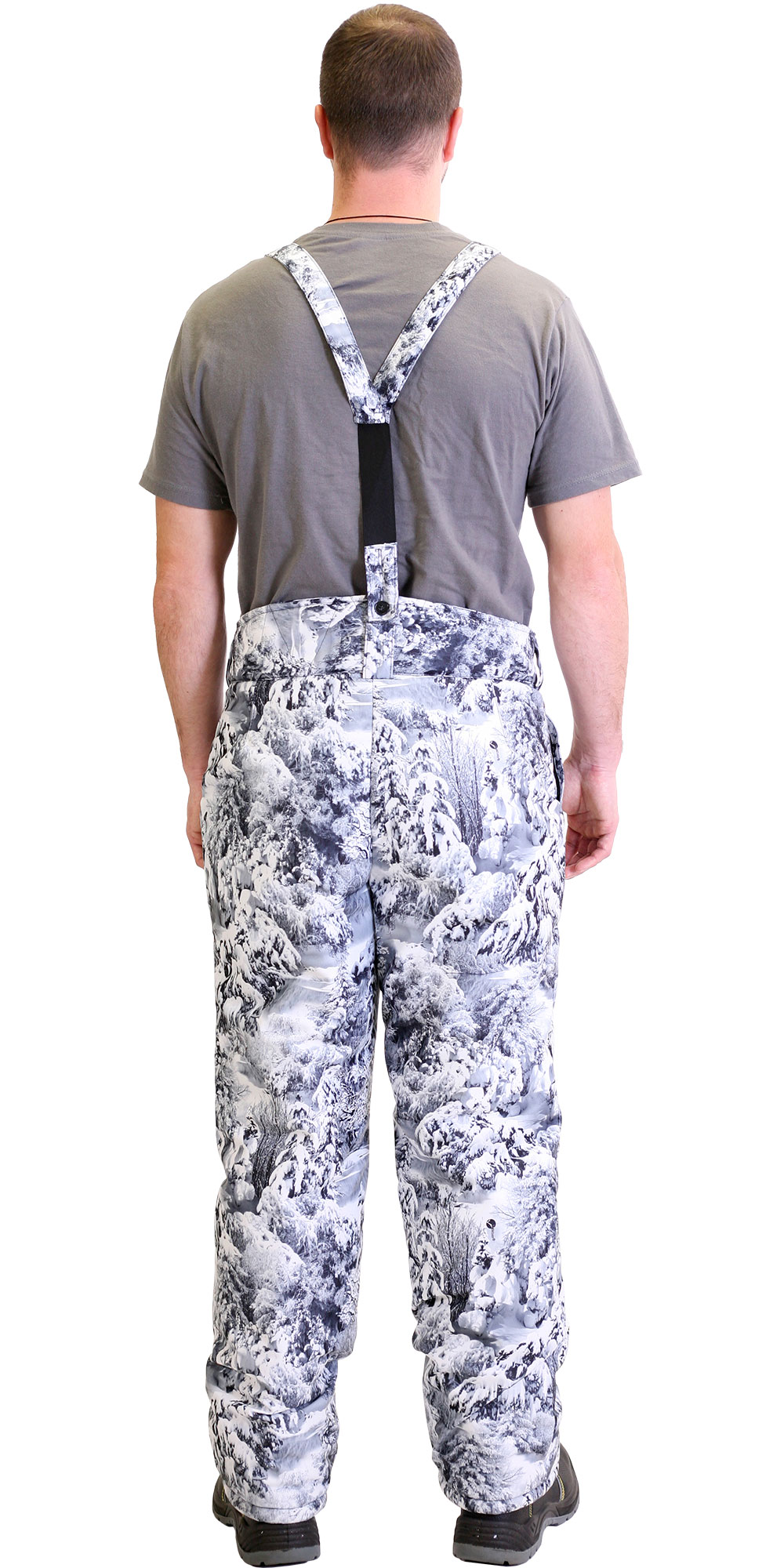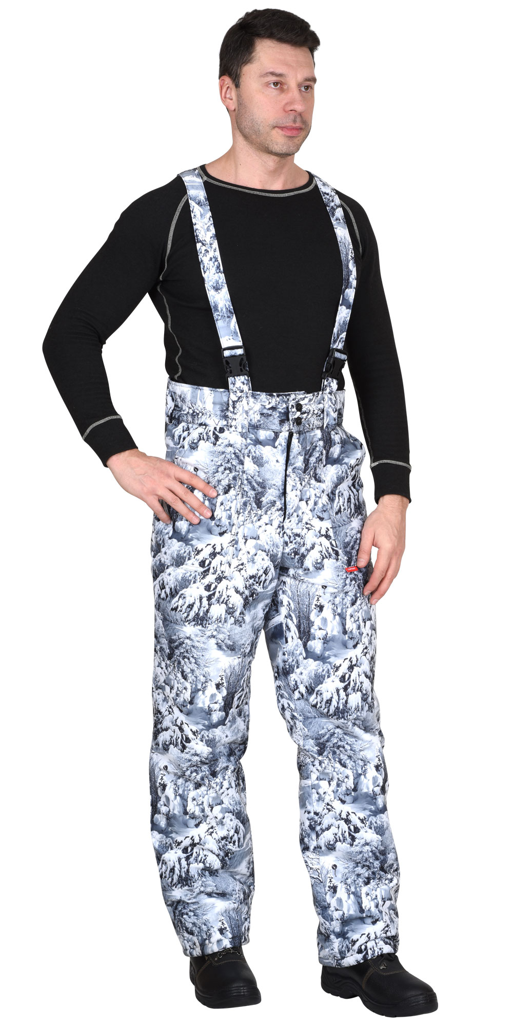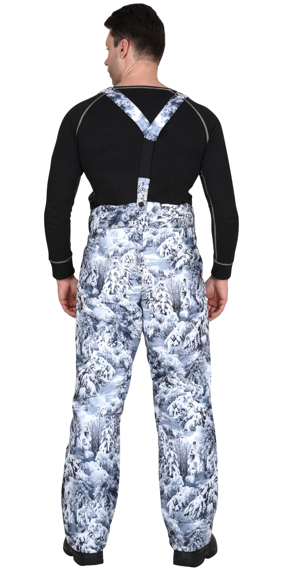 Брюки прямые с притачной утеплённой подкладкой, с притачным широким фигурным поясом, застёгивающимся на две петли и пуговицы, с застёжкой гульфика на молнию, с двумя накладными боковыми карманами, с бретелями.