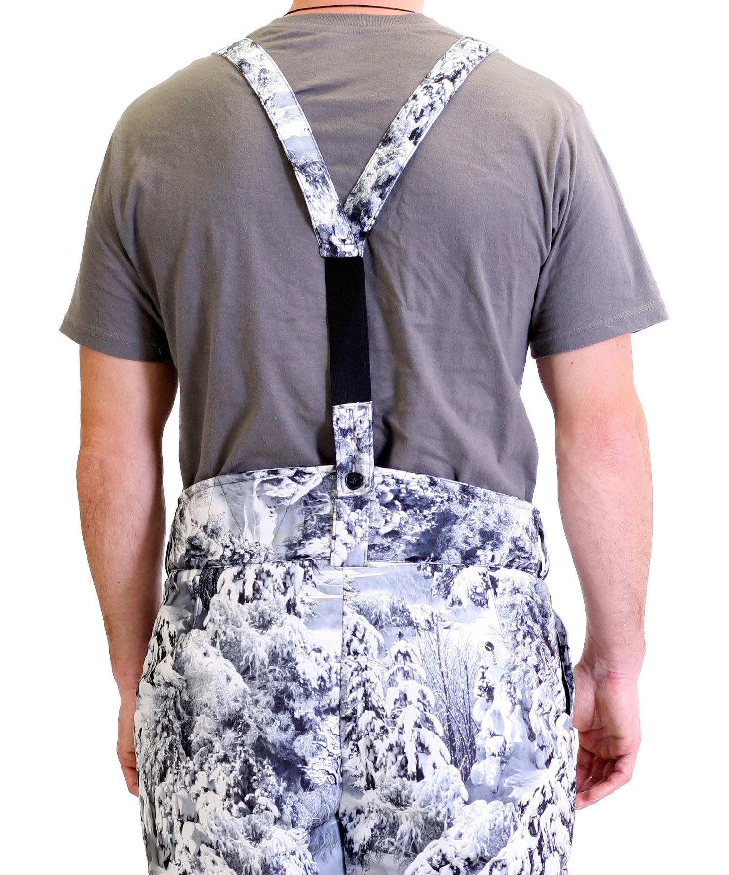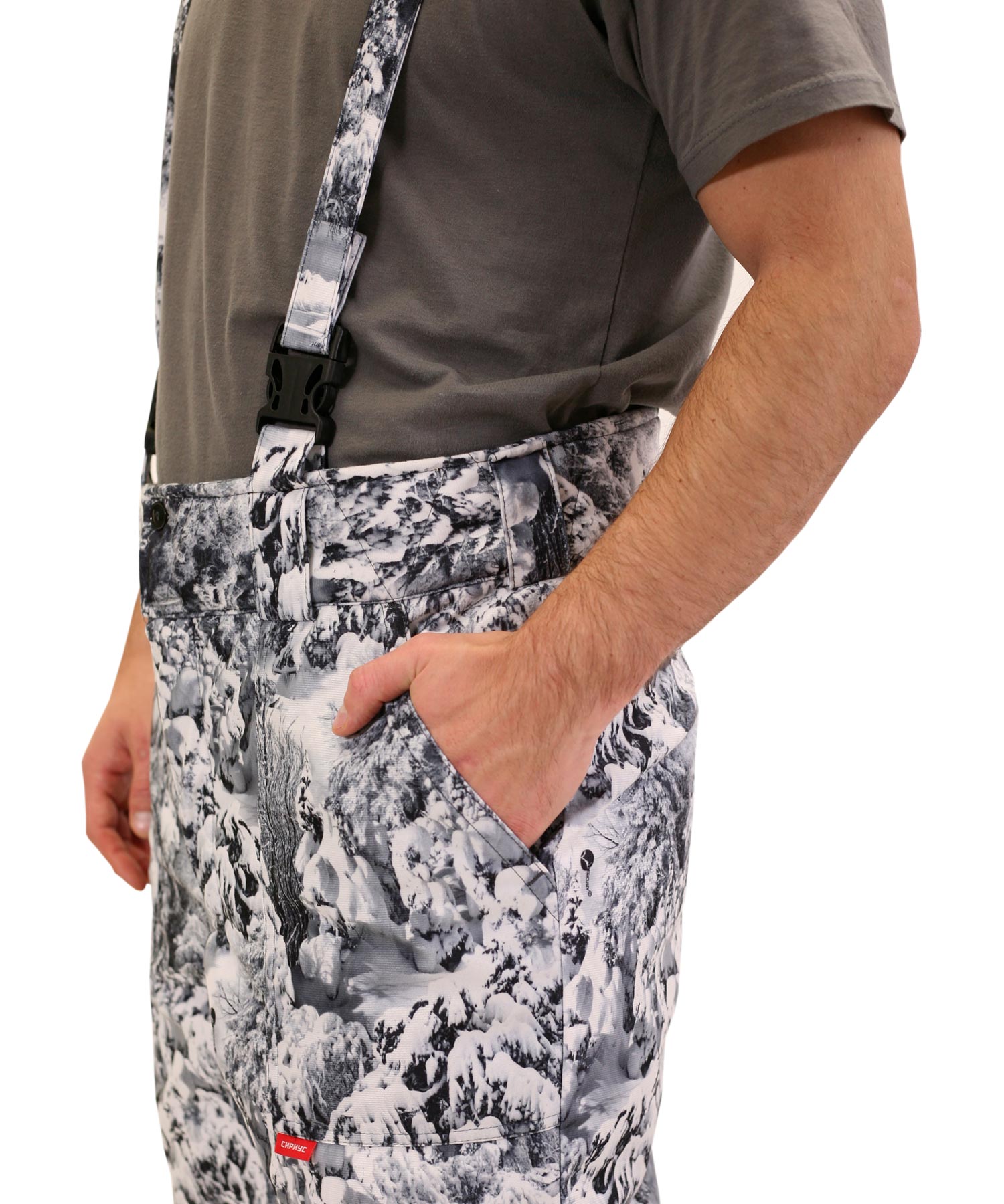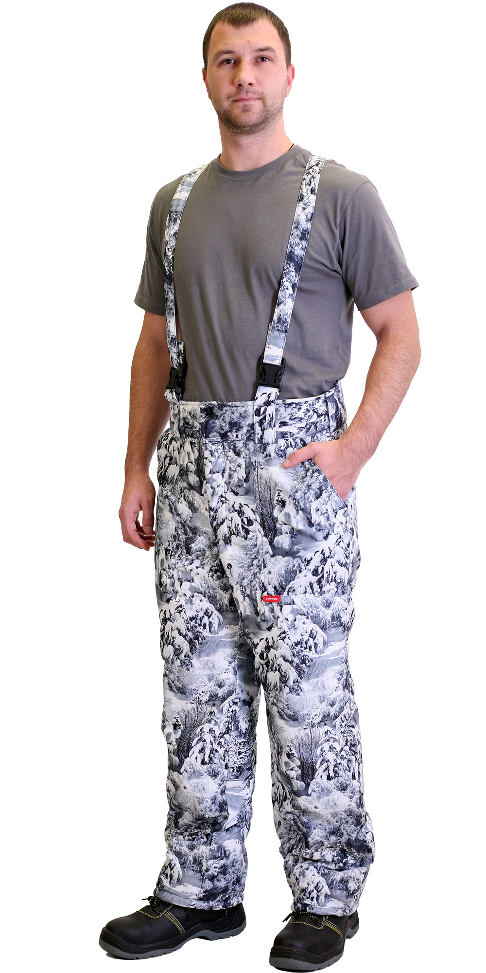 Брюки прямые с притачной утеплённой подкладкой, с притачным широким фигурным поясом, застёгивающимся на две петли и пуговицы, с застёжкой гульфика на молнию, с двумя накладными боковыми карманами, с бретелями.
