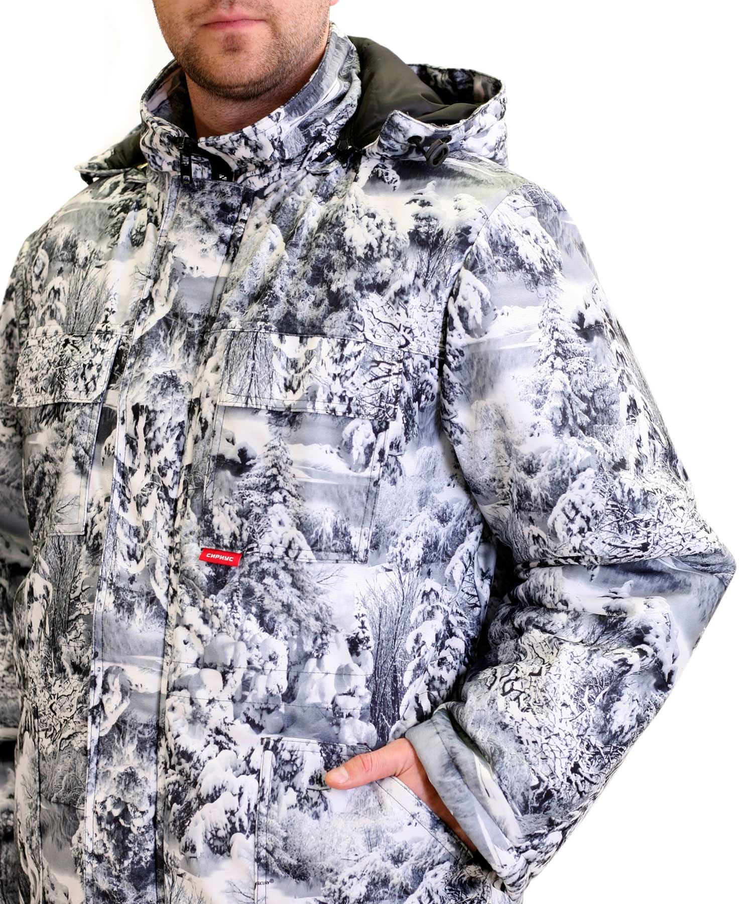 Ткань верха: "Алова", состав: 100% - полиэстер, плотность - 180 г/м2, расцветка КМФ "Белый Лес". Утеплитель: Синтепон - 150 г/м2 - 3 слоя (итого 450 г/ м2 в куртке), 150 г/м2 - 2 слоя (итого 300 г/ м2).