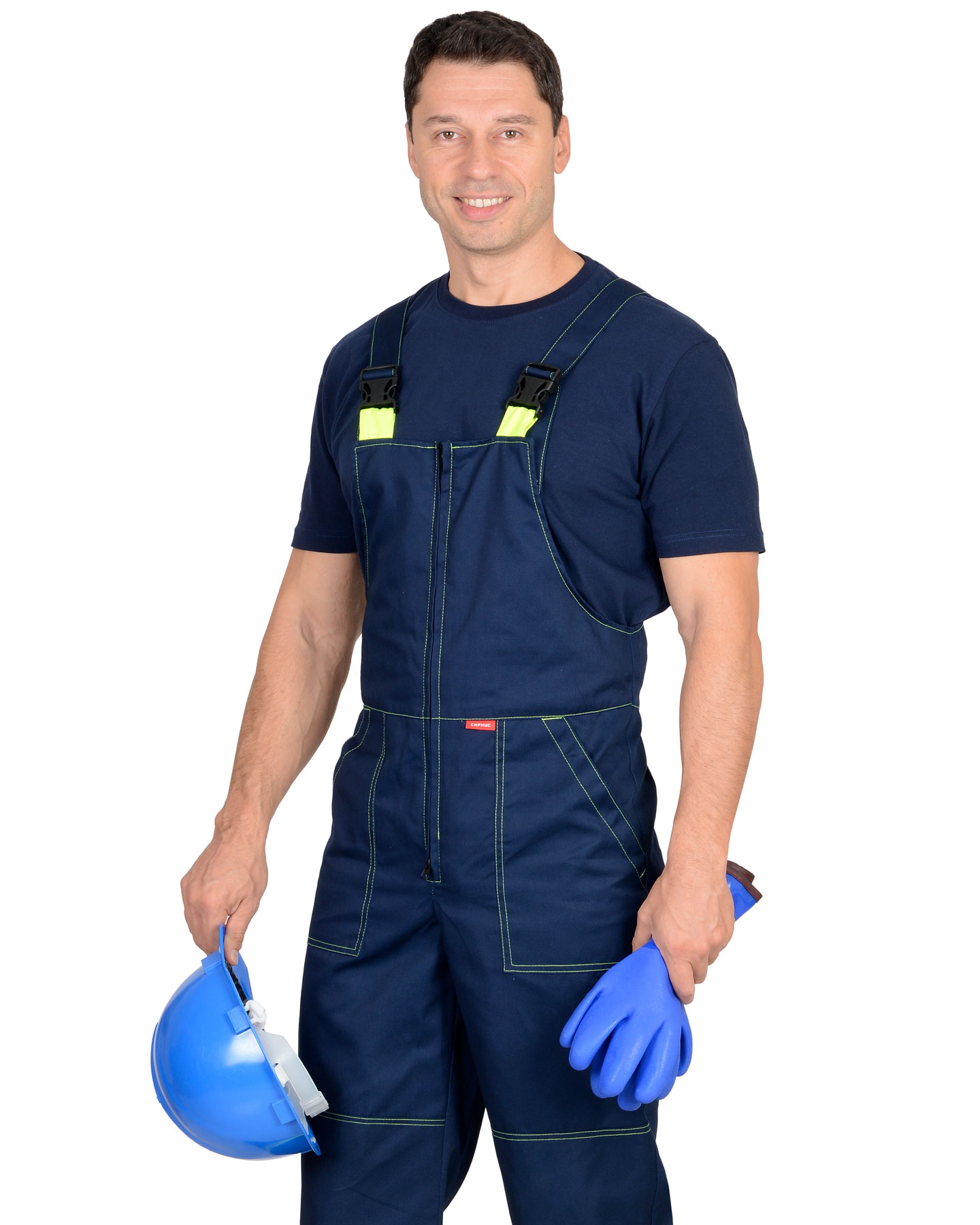Полукомбинезон прямой, с центральной застёжкой на двухзамковую молнию, с накладными боковыми карманами, с наколенниками, с эластичной лентой по спинке для лучшего прилегания. Бретели регулируются при помощи эластичной ленты и пряжек фастексов.