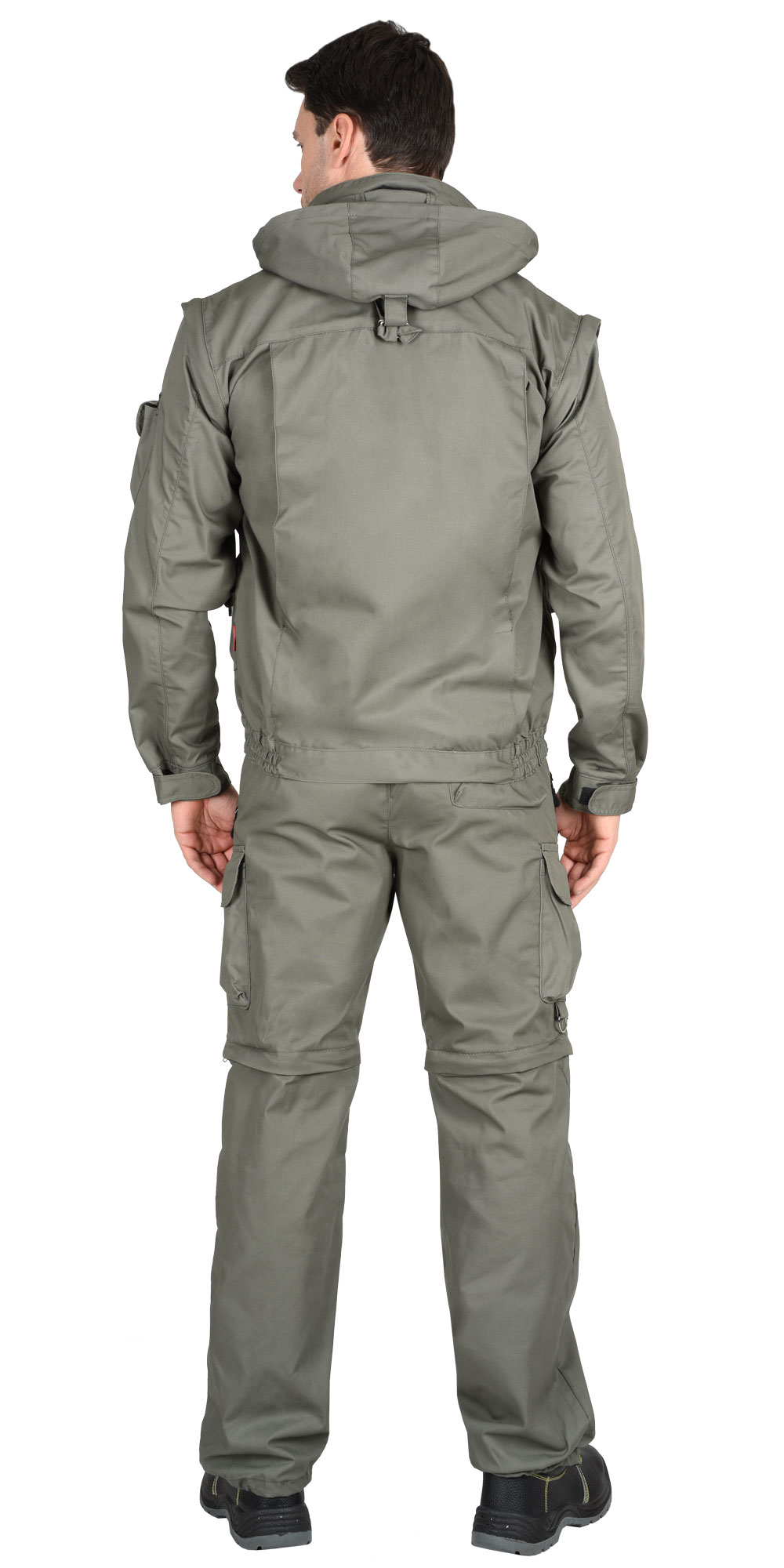 Костюм "Тигр" состоит из куртки и брюк.Куртка короткая, прямого силуэта с центральной застёжкой на молнию накрытой ветрозащитным клапаном, застёгивающимся на четыре кнопки, воротник стойка, пристёгивающимся капюшоном, различными многофункциональными карманами на "молнии", с клапанами на "липучках". Рукава пристёгиваются на "молнию", манжеты рукавов с патой регулирующие ширину при помощи "липучки". Низ куртки с притачным поясом стянутым, частично, резинкой.Брюки прямые с притачным поясом с 5-ю шлёвками, частично стянутый резинкой, застёгивающийся на пуговицу, застёжка гульфика на тесьму - "молния", с различными многофункциональными карманами. Низ брюк отстёгивается для трансформации брюк в шорты.Ткань верха: "Родос" с ВО отделкой, состав - 65% п/э, 35 % х/б, поверхностная плотность 245 г/м2.