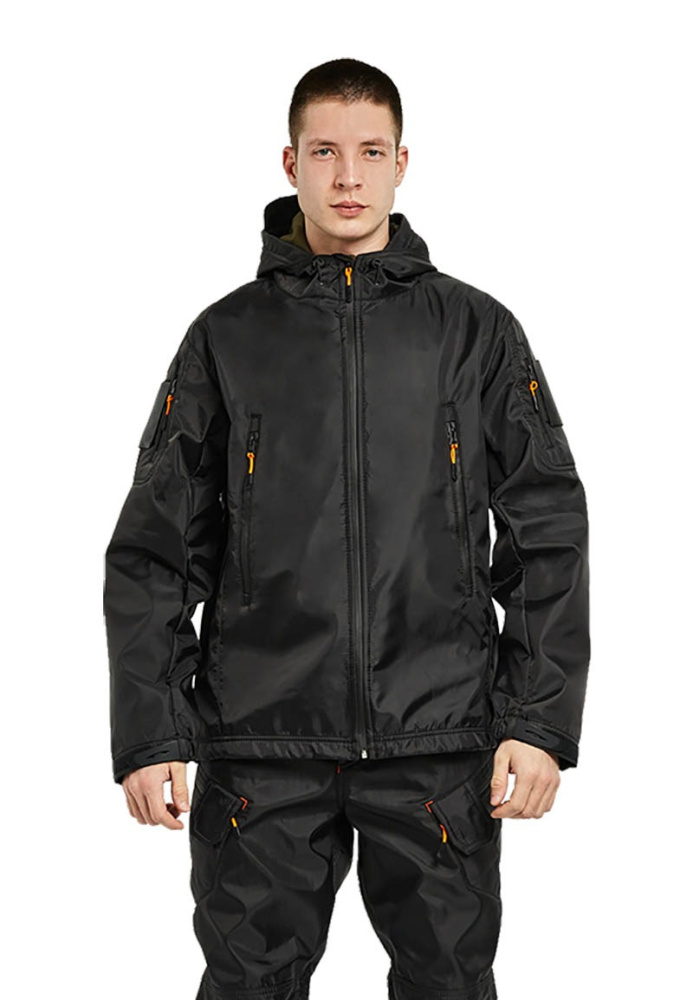 Универсальный мужской костюм состоит из куртки с капюшоном и брюк.