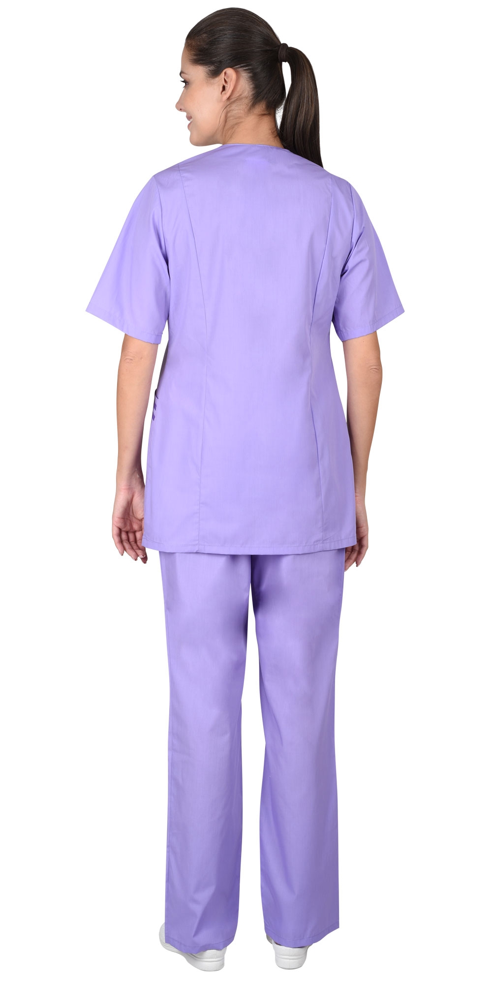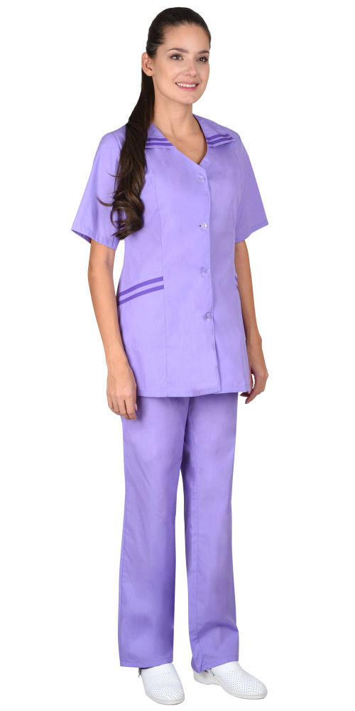 Костюм состоит из блузы и брюк. Блуза приталенного силуэта с застёжкой на пуговицы, короткими рукавами, с отделкой по воротнику и нижним карманам. Брюки прямого покроя без карманов с притачным поясом стянутым резинкой.