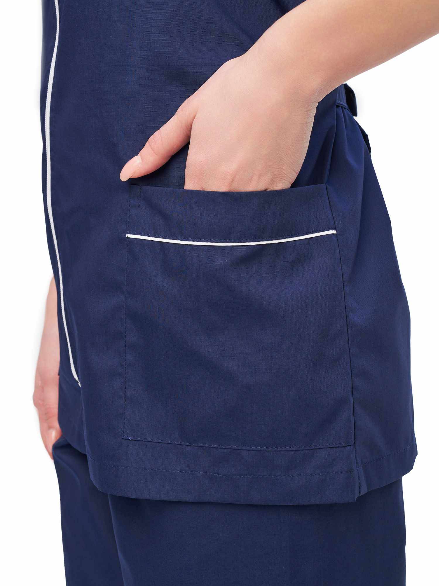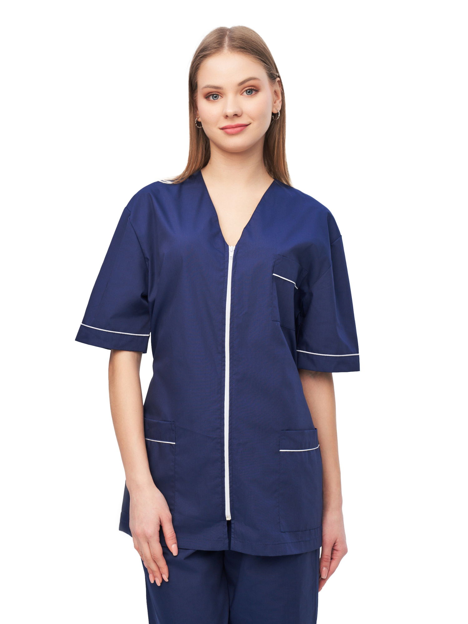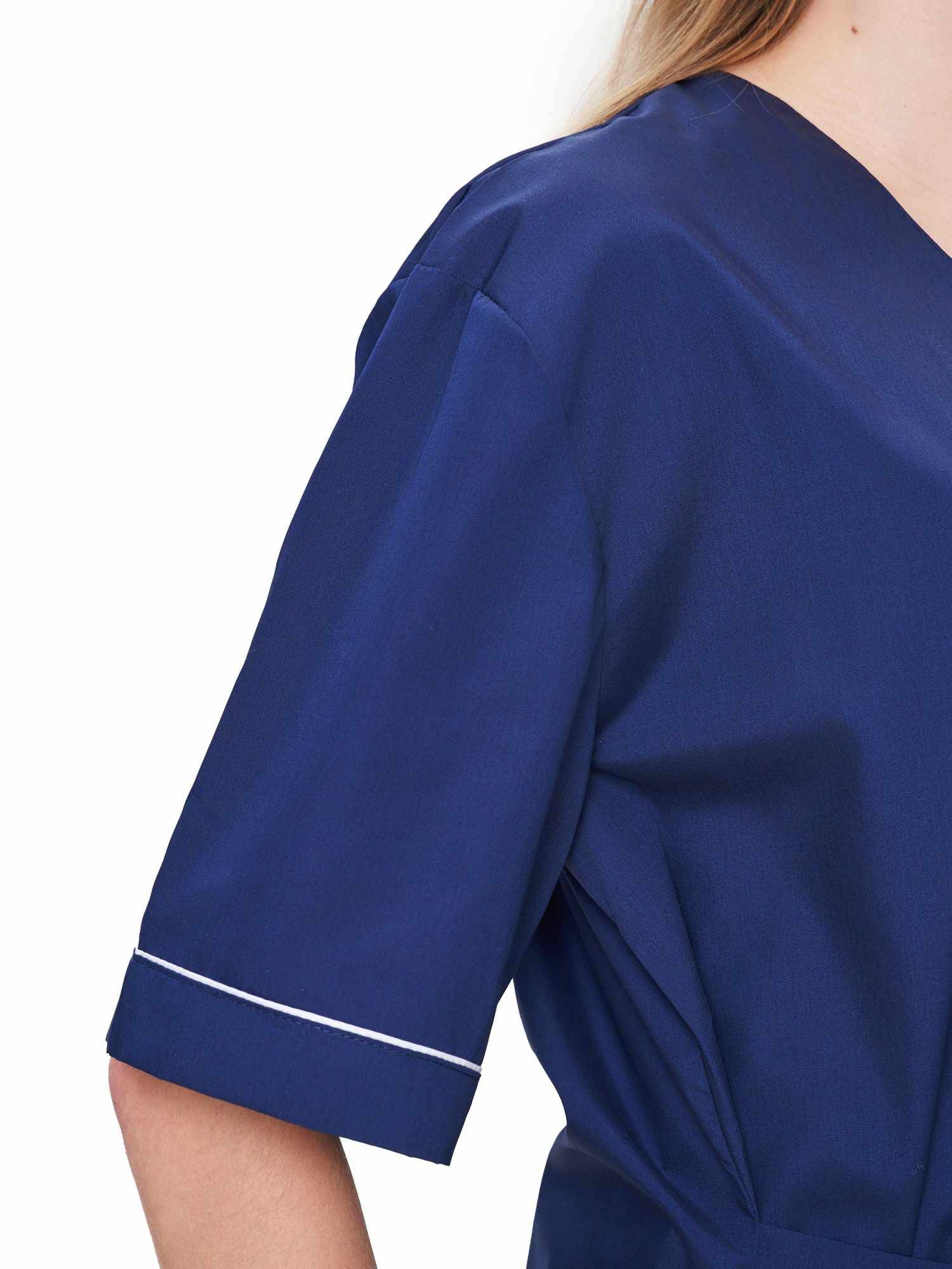 Современный удобный женский костюм со свободной посадкой, рекомендован для сферы косметологии и работников медицинских учреждений из высококачественной смесовой ткани прекрасно переносят многократные стирки и выглядят презентабельно даже при длительных сроках эксплуатации. Широкий размерный ряд продукции позволит без труда подобрать костюм правильно по фигуре, в соответствии со спецификой профессии и с учетом индивидуальных требований сотрудника. Костюм женский «Глория» для косметологов и медработников прост в уходе, не мнется и быстро сохнет, а материал долгое время сохранит свой первоначальный яркий цвет. Костюм состоит из блузы и брюк темно-синего цвета с белой отделкой. Сегодня современная мода вмешивается не только в подиумные и уличные образы. Она диктует свои правила разным сферам жизни, в том числе в сфере косметологии и медицине. Костюм состоит из прочной смесовой ткани ТИСИ, отталкивающей различного рода загрязнения. Материал устойчив к пятнам и истиранию, тем самым косметологи и медработники всегда будут выглядеть опрятно и привлекательно.
