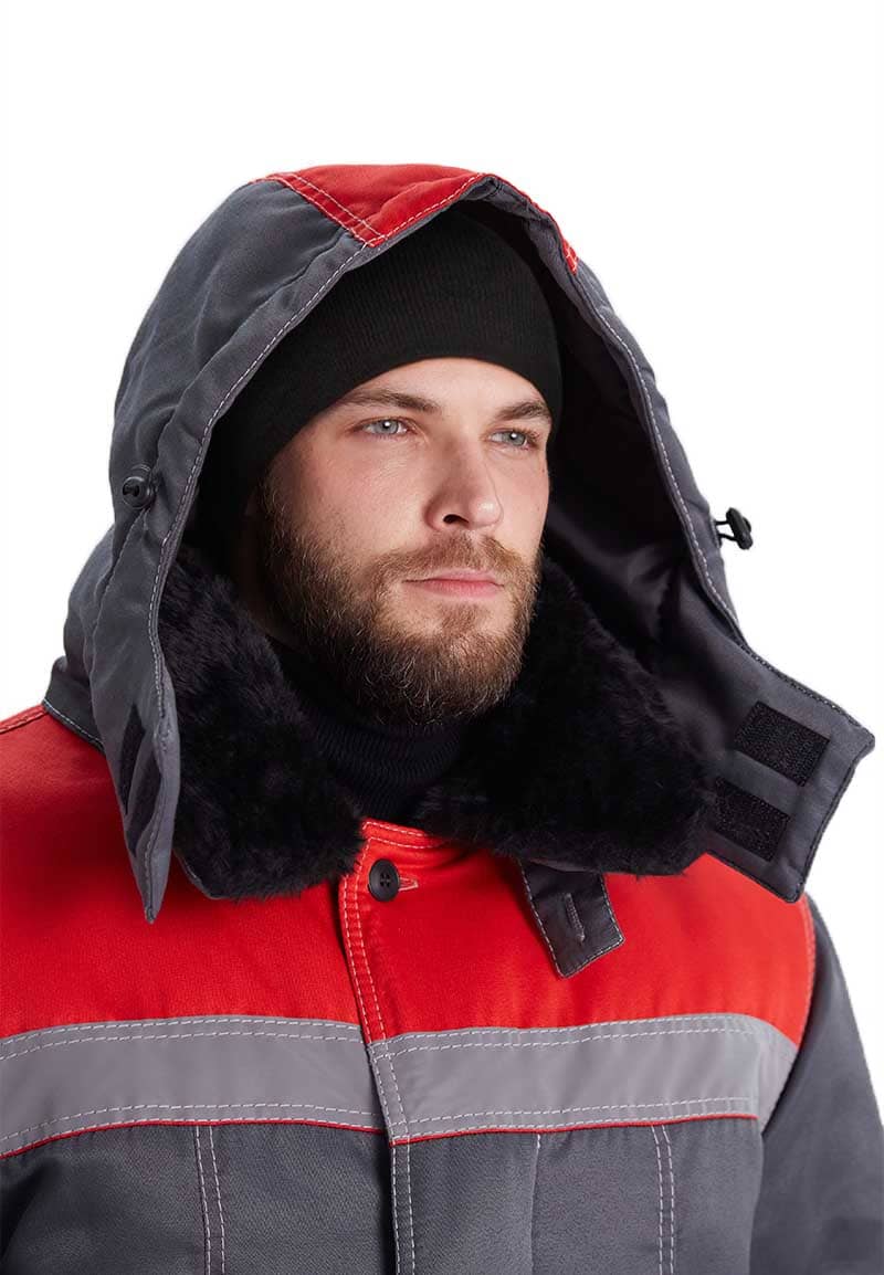 - Съемный утепленный капюшон, фиксируется на воротнике с помощью пуговиц, на подбородочной части застегивается на липучку, по лицевому срезу проходит кулиса, утяжкой служит шнур-резинка с фиксаторами, на затылочной части капюшон регулируется по высоте с помощью паты на липучке