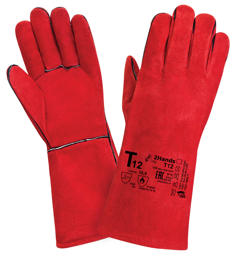 Перчатки сварщика (краги) 2Hands (Ту Хэндс) спилковые для защиты от механических воздействий и повышенных температур. Перчатки пятипалые с подкладкой из хлопка и льна (брезента), длина 350 мм (+10/-5мм). Окрашенный спилок КРС сорта АВ (1,4 +/- 0,2 мм), обработка, обеспечивающая сохранение мягкости спилка в течение длительного времени хранения,  швы - оригинальная нить Кевлар, усилены вставками из кожи черного цвета, используется специальная упрочненная нить. Эти перчатки - базовая модель перчаток сварщика 2Hands. Перчатки изготавливаются из высококачественного спилка спинной части шкур, прошедшего предварительный отбор. Размер 10,5 (T12ECO2 10,5 и 11,5)