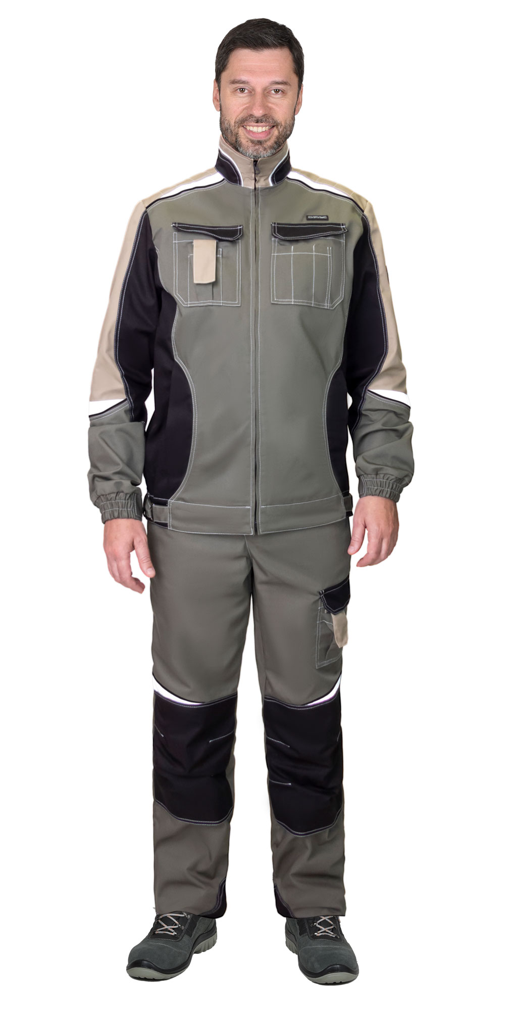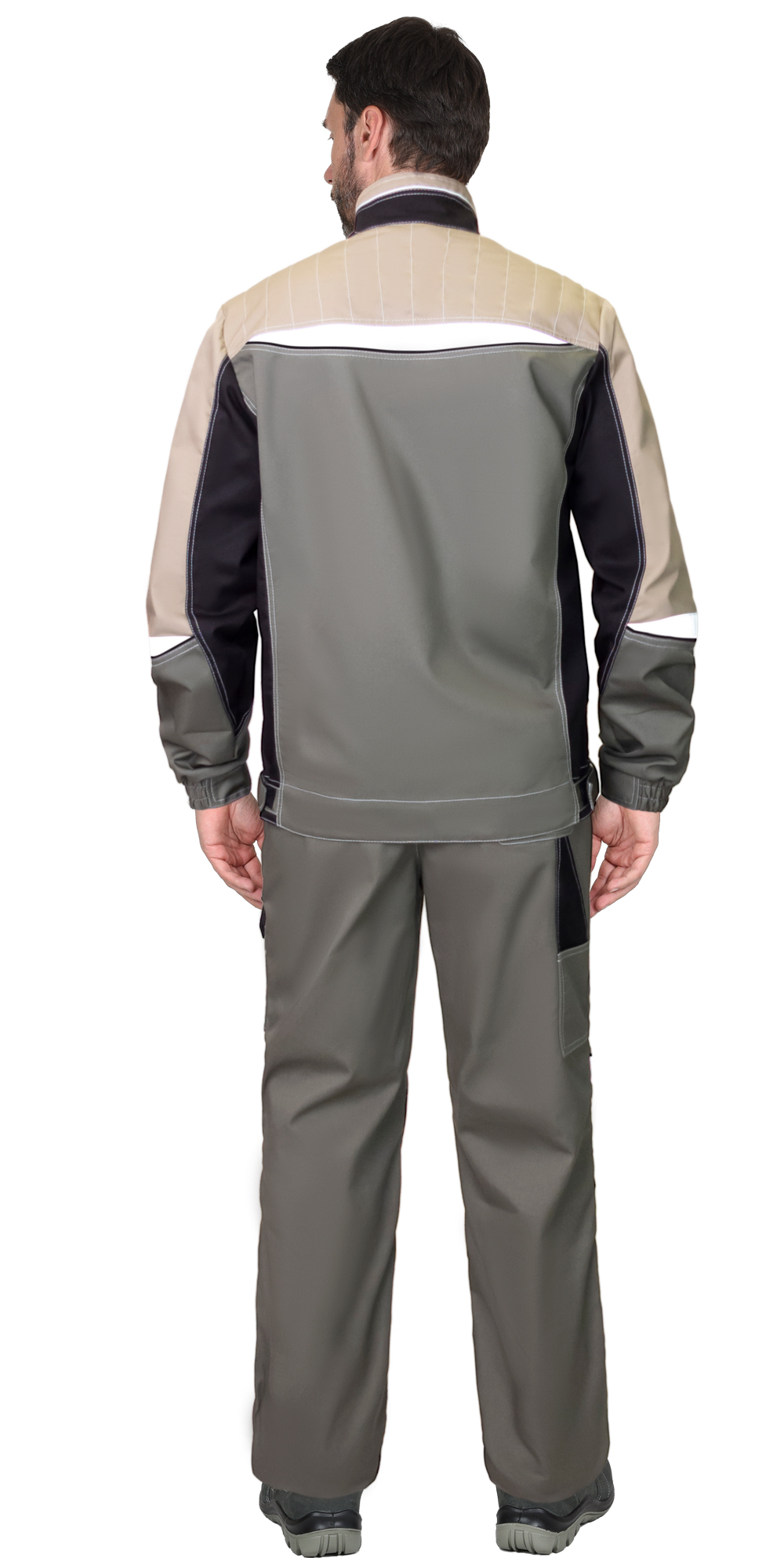 Куртка комбинированная трёхцветная, укороченная, прямого силуэта, с воротником стойка, с центральной застёжкой на молнию, с отрезными бочками, с верхними накладными карманами с клапанами, с нижними прорезными карманами на молнию. Объём куртки внизу регулируется при помощи хлястиков, пластиковой рамки и липучки. Рукава втачные, с отрезными манжетами, с частичной стяжкой на резинку.