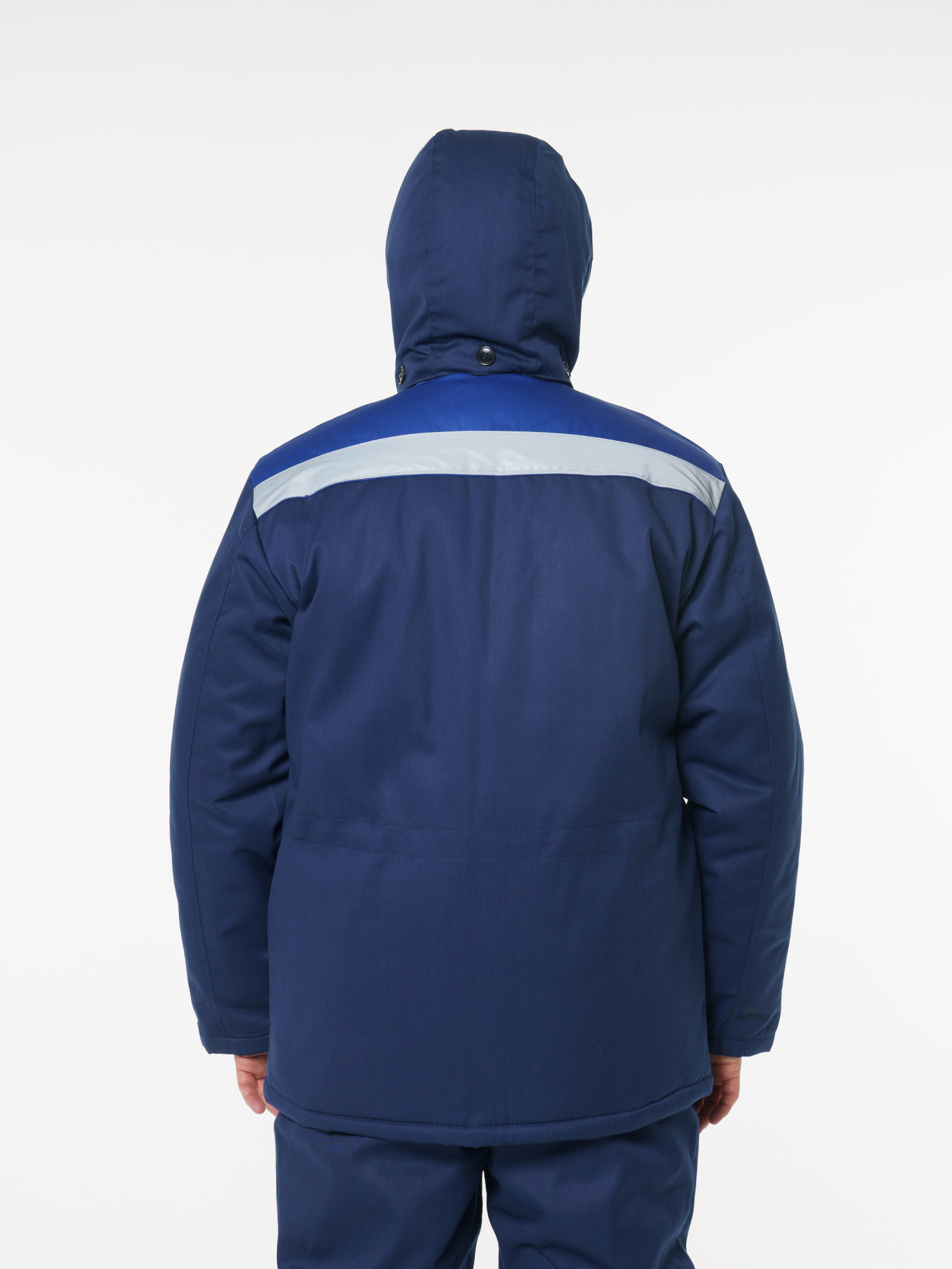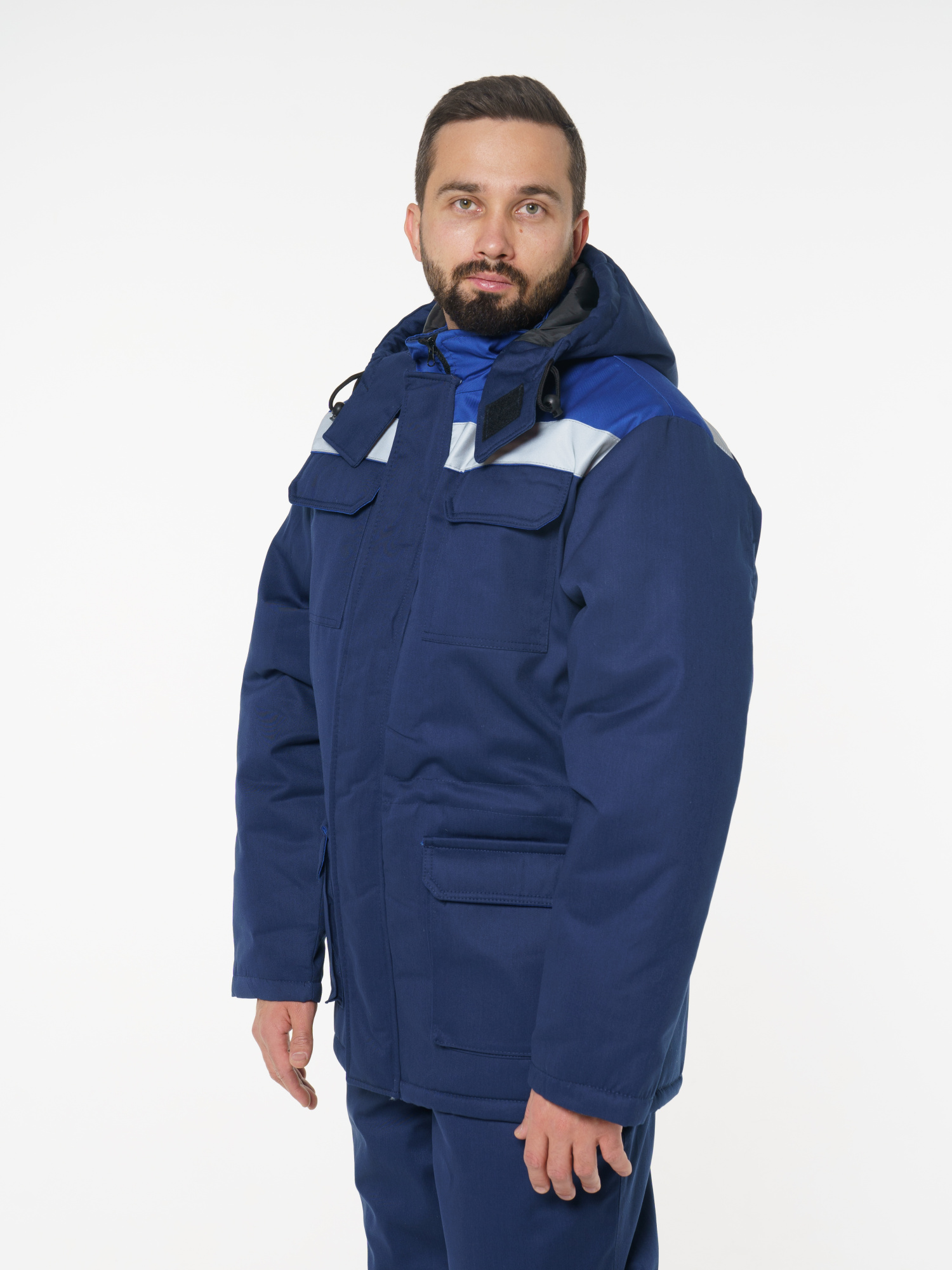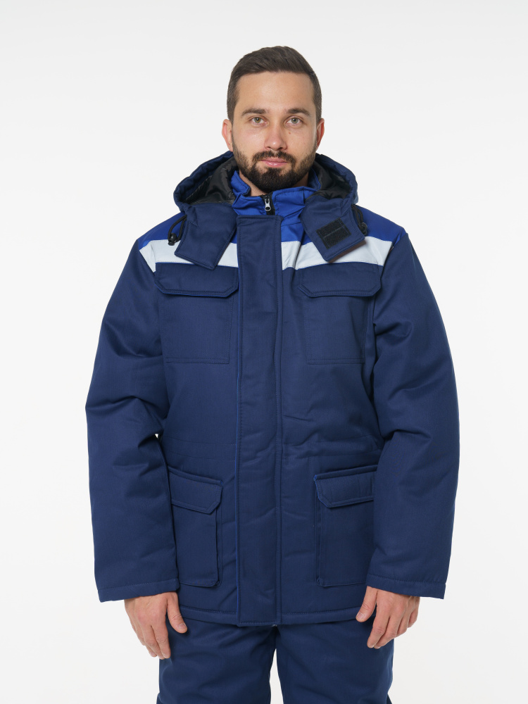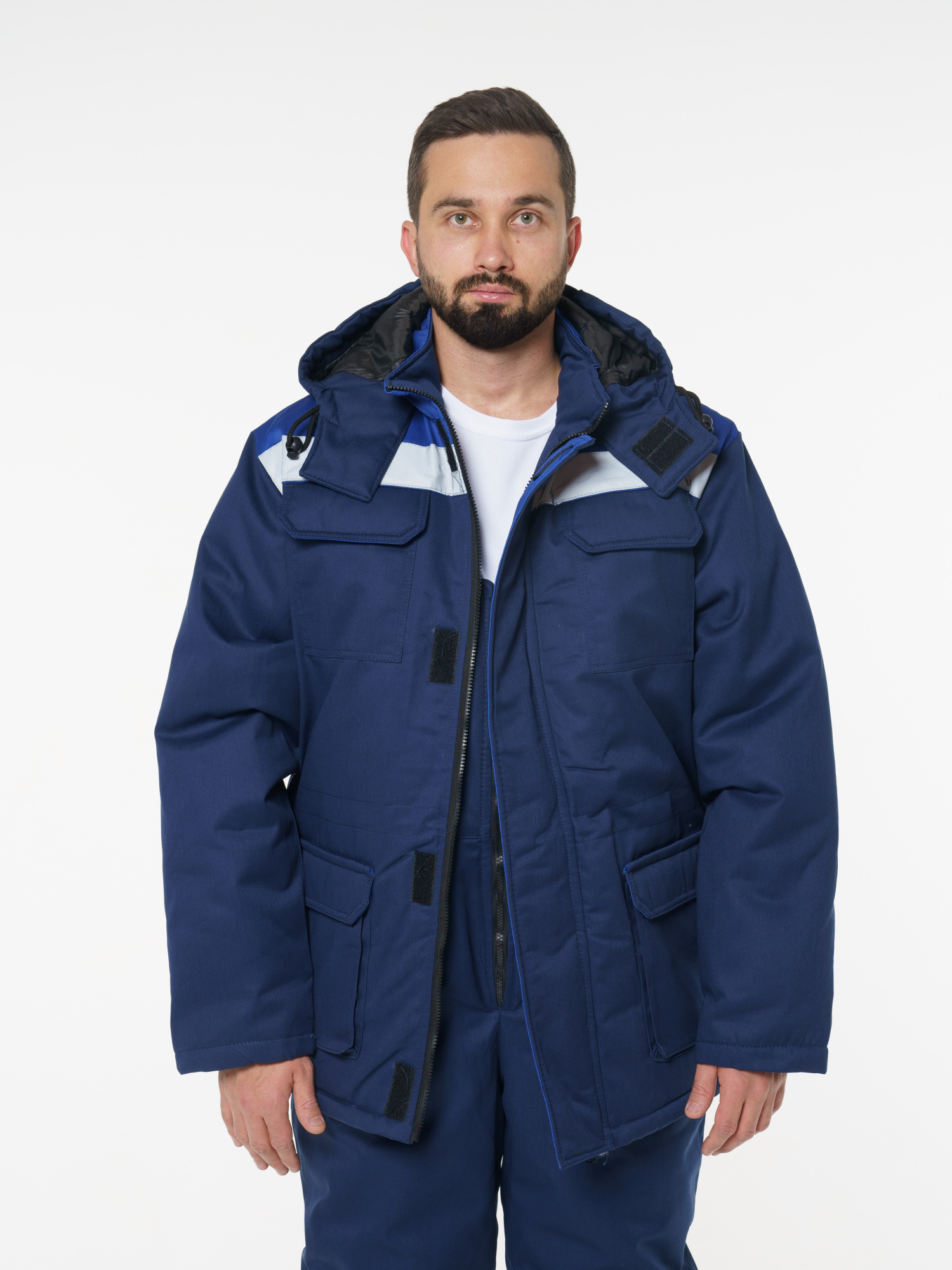 Куртка прямого силуэта, с центральной застежкой на молнию с ветрозащитной планкой на липучках. Нагрудные накладные карманы и нижние объемные накладные карманы-портфель с клапаном на липучках. Кокетки полочек и спинки выделены СВ кантом. В рукавах трикотажные манжеты-напульсники. По линии талии кулиса со шнуром-резинкой и фиксатором. Воротник-стойка. Съемный утепленный капюшон на пуговицах, по лицевому вырезу кулиса со шнуром-резинкой и фиксаторами, по лицевой части застегивается на липучки. Подкладка простегана с утеплителем, внутренний накладной карман на левой полочке.