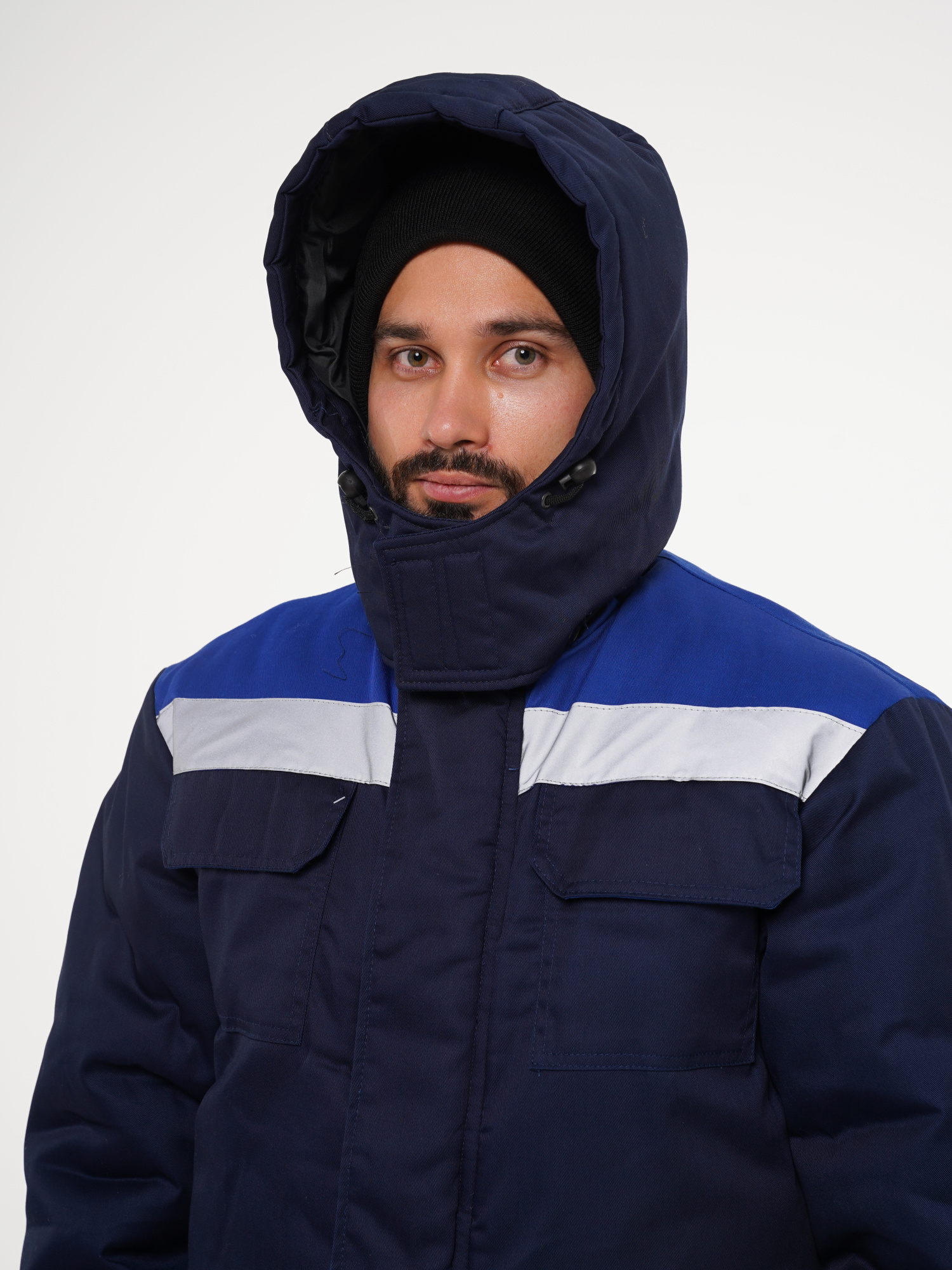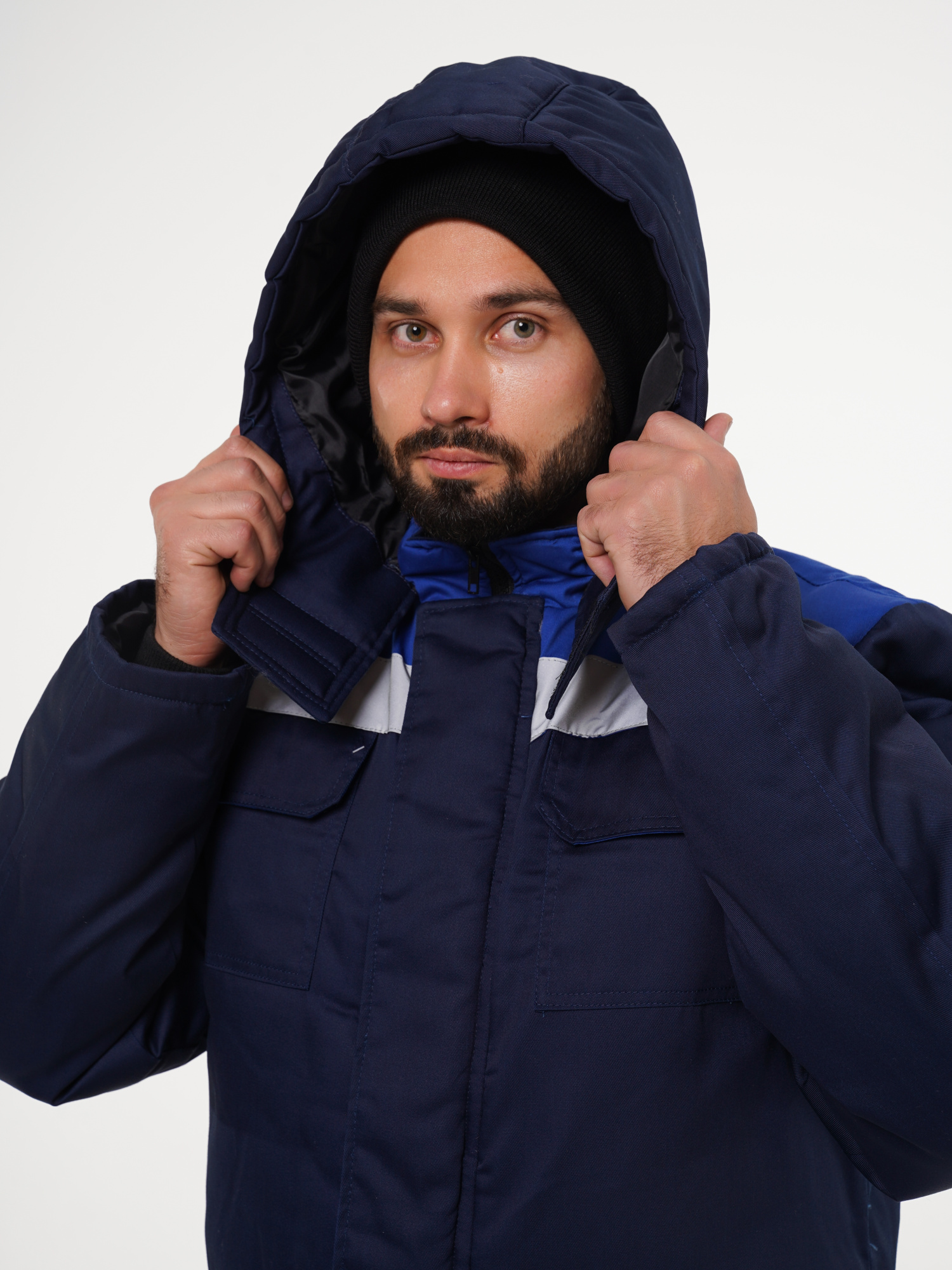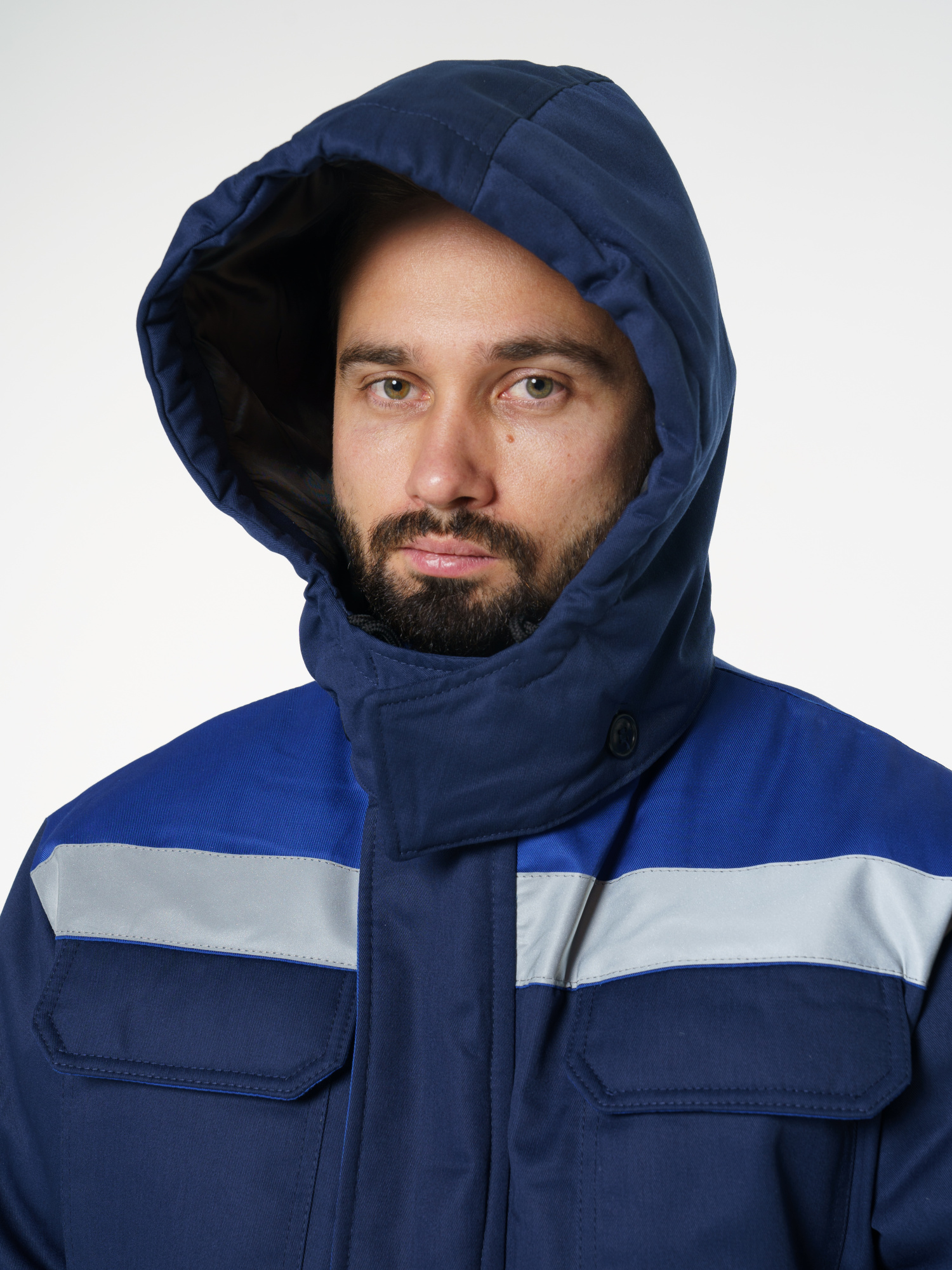 Куртка прямого силуэта, с центральной застежкой на молнию с ветрозащитной планкой на липучках. Нагрудные накладные карманы и нижние объемные накладные карманы-портфель с клапаном на липучках. Кокетки полочек и спинки выделены СВ кантом. В рукавах трикотажные манжеты-напульсники. По линии талии кулиса со шнуром-резинкой и фиксатором. Воротник-стойка. Съемный утепленный капюшон на пуговицах, по лицевому вырезу кулиса со шнуром-резинкой и фиксаторами, по лицевой части застегивается на липучки. Подкладка простегана с утеплителем, внутренний накладной карман на левой полочке.