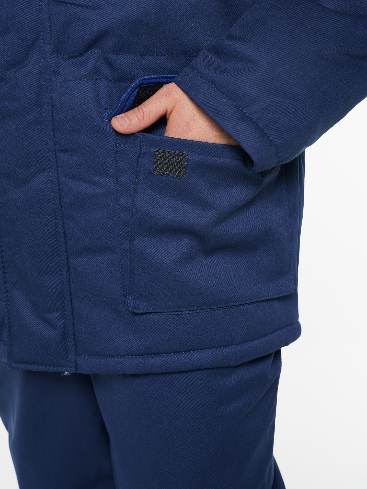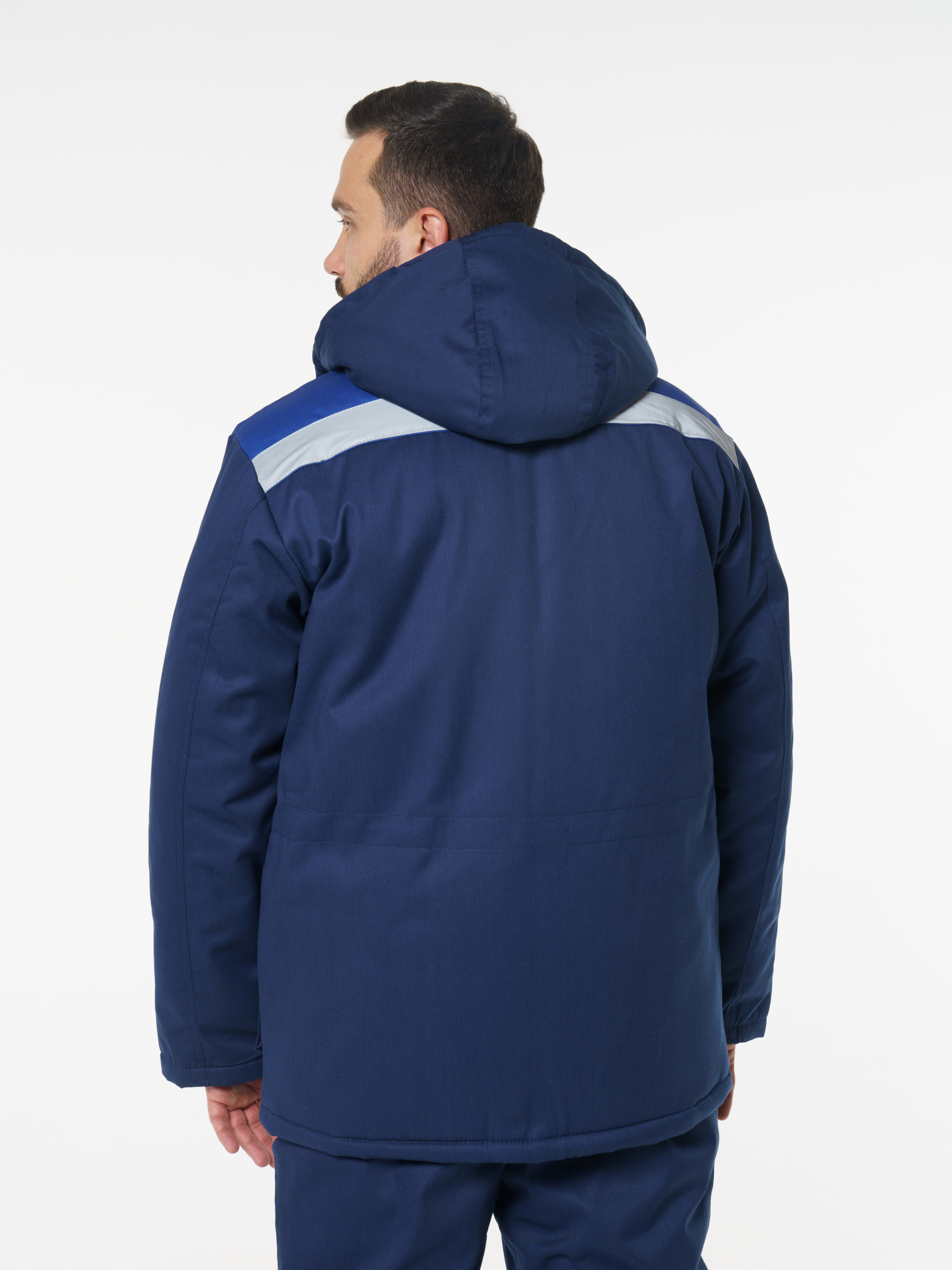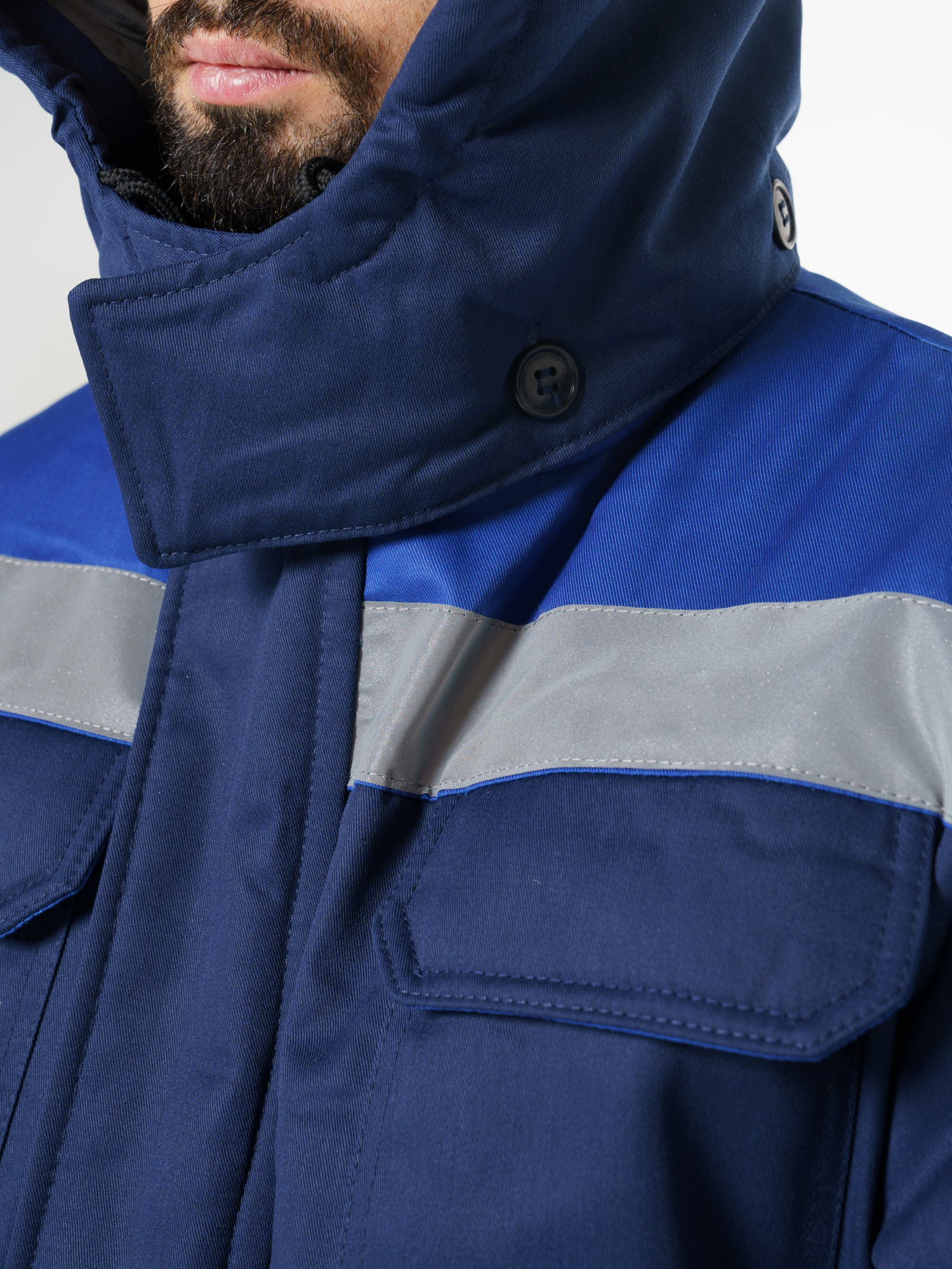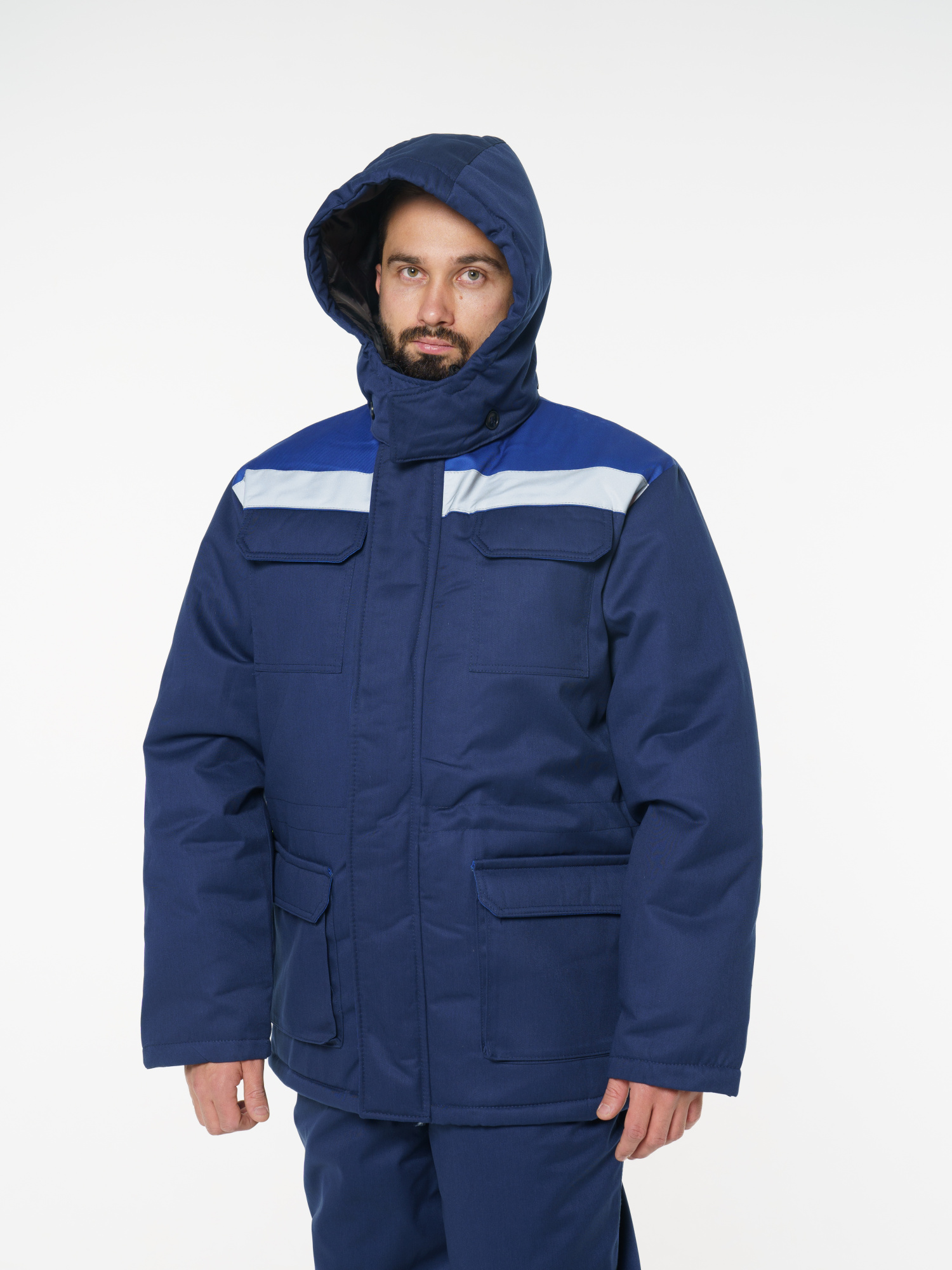 Куртка прямого силуэта, с центральной застежкой на молнию с ветрозащитной планкой на липучках. Нагрудные накладные карманы и нижние объемные накладные карманы-портфель с клапаном на липучках. Кокетки полочек и спинки выделены СВ кантом. В рукавах трикотажные манжеты-напульсники. По линии талии кулиса со шнуром-резинкой и фиксатором. Воротник-стойка. Съемный утепленный капюшон на пуговицах, по лицевому вырезу кулиса со шнуром-резинкой и фиксаторами, по лицевой части застегивается на липучки. Подкладка простегана с утеплителем, внутренний накладной карман на левой полочке.