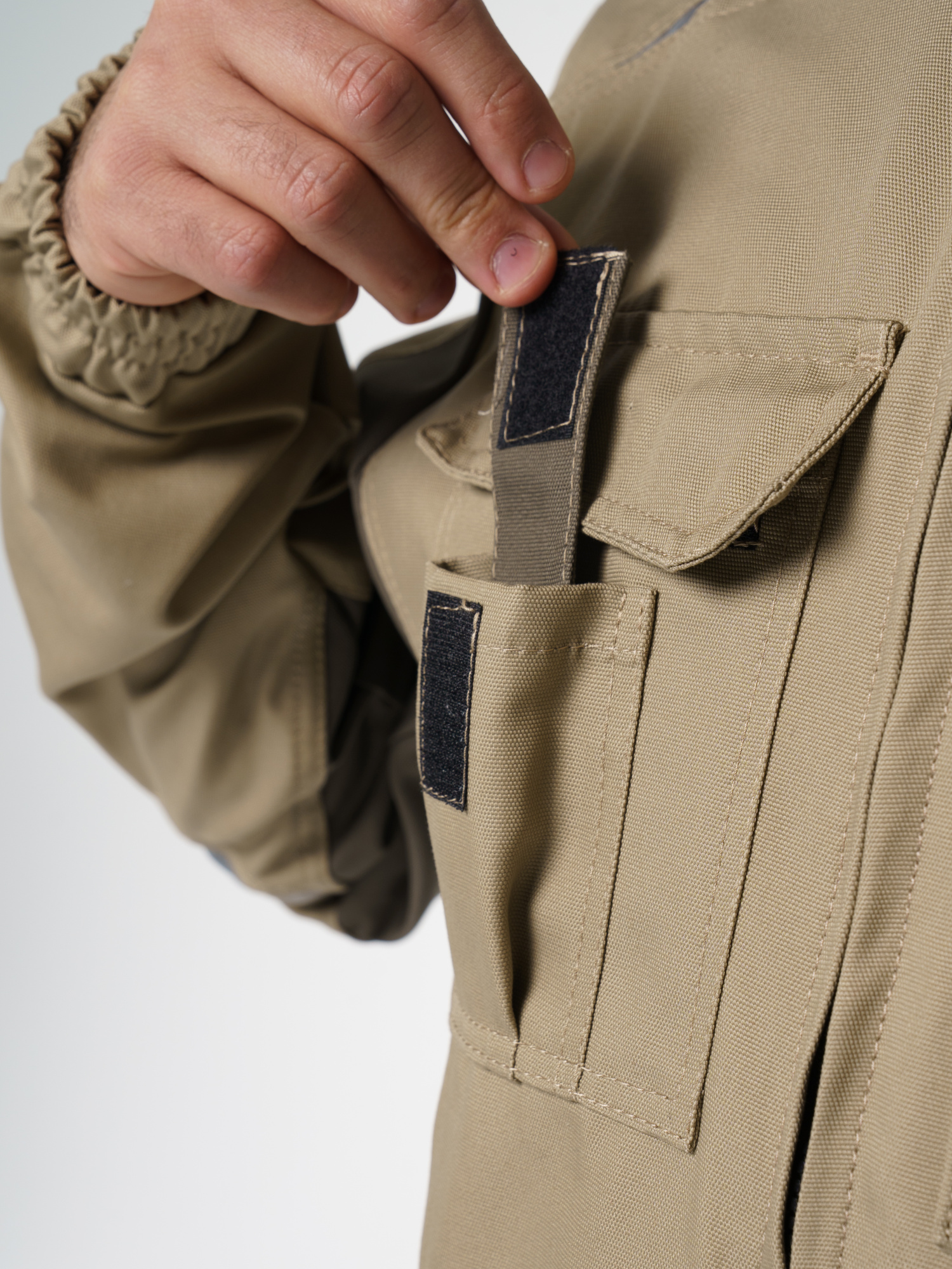 Куртка прямого силуэта; короткая; воротник стойка; с центральной застёжкой на молнию; с верхними фигурными карманами с фигурными клапанами; низ регулируется при помощи хлястиков с полукольцами. На куртке есть СВ элементы.