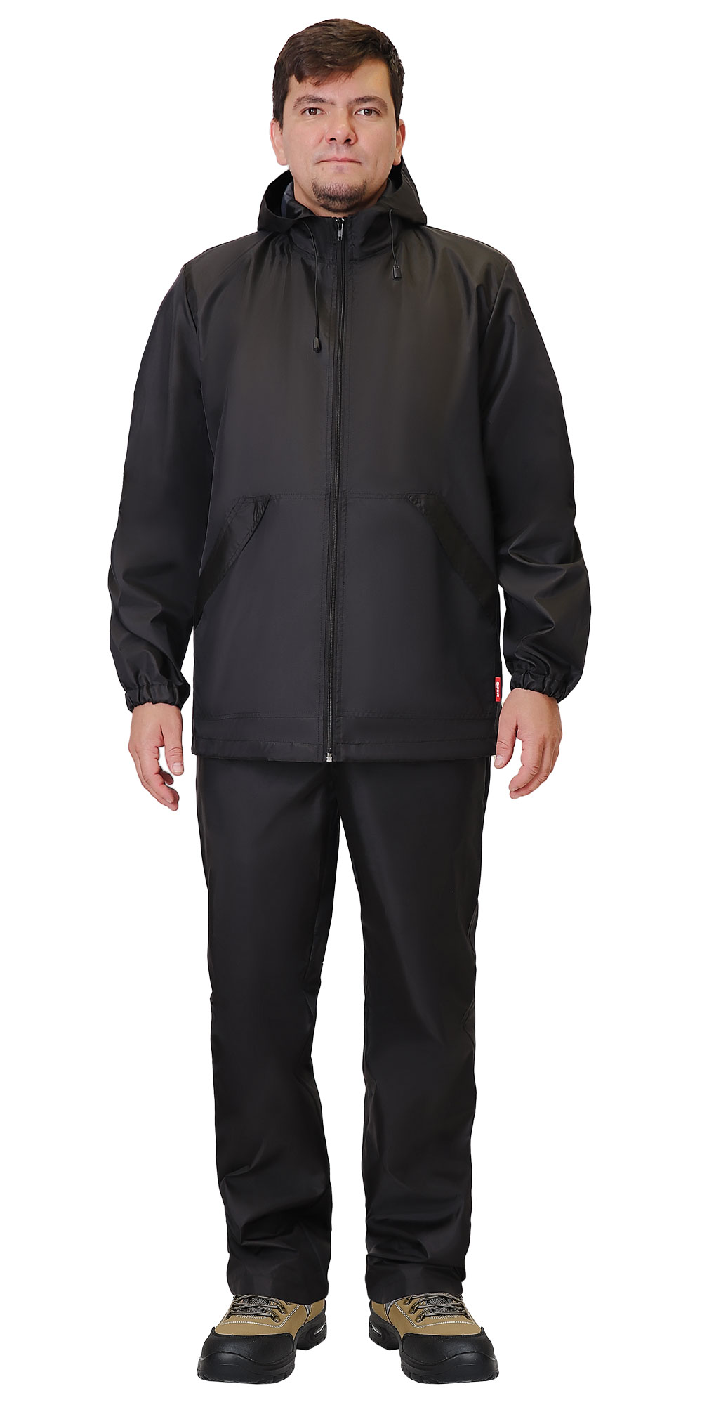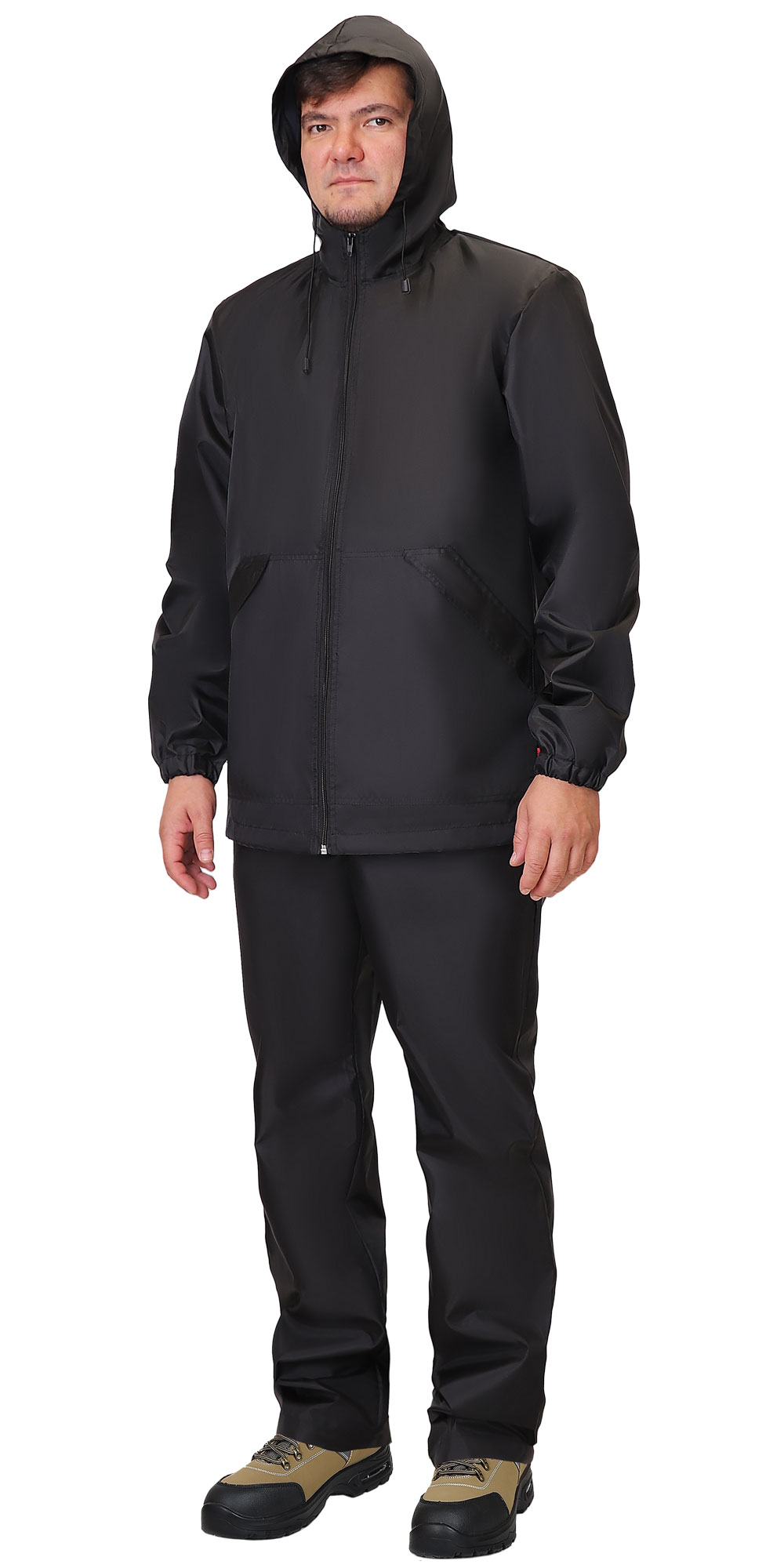 Куртка из полиэфирной водоотталкивающей ткани, с застёжкой на молнию, с капюшоном, с большими накладными карманами с наклонным входом, низ рукавов собран на резинку, объём куртки понизу и объём капюшона по лицевому вырезу регулируются эластичным шнуром с фиксаторами.