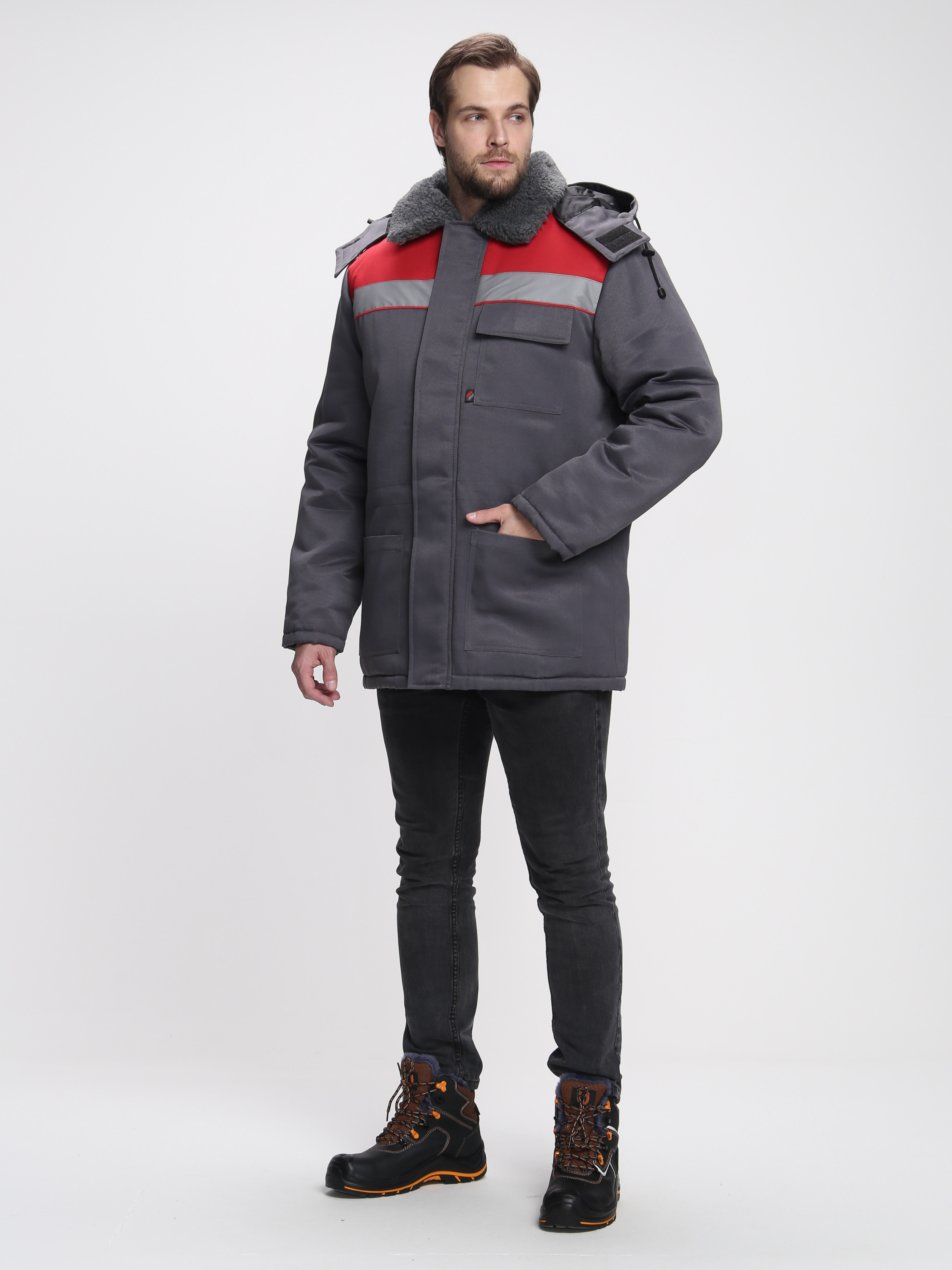 Куртка зимняя Бригада NEW (тк.Смесовая,210), т.серый/красный (ЧЗ) (128-132/170-176)
