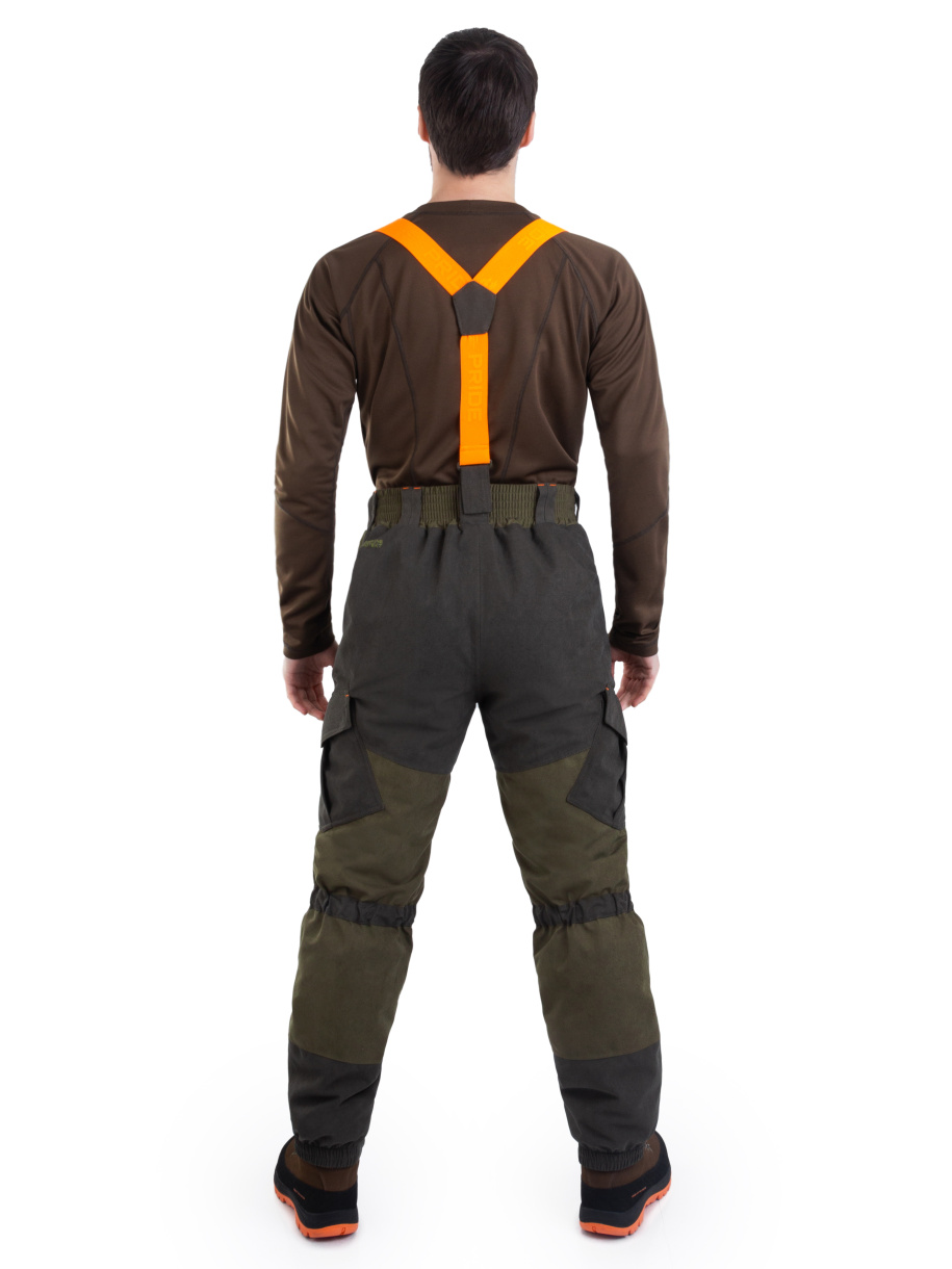 Брюки на широком поясе со шлевками для ремня. Съемные подтяжки. 4 кармана. 2 на влагозащитных молниях в верхней части брюк и 2 объемных в области бедер. Эластичные кулисы под коленом и низу брюк для защиты от проникновения холодного воздуха.