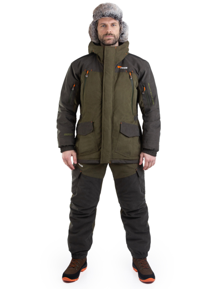 Костюм состоит из куртки и брюк. На куртке расположены 7 карманов, 2 вместительных вертикальных на влагозащитных молниях, 2 объемных нижних с клапанами на магнитных кнопках, 2 на руквах и 1 внутренний на подкладке. Интегрированный регулируемый капюшон с высокой стойкой. Две ветрозащитные планки на магнитных кнопках. Эластичные кулисы в области талии и локтей формируют атлетический силуэт. Утяжки по низу куртки для регулировки объема.