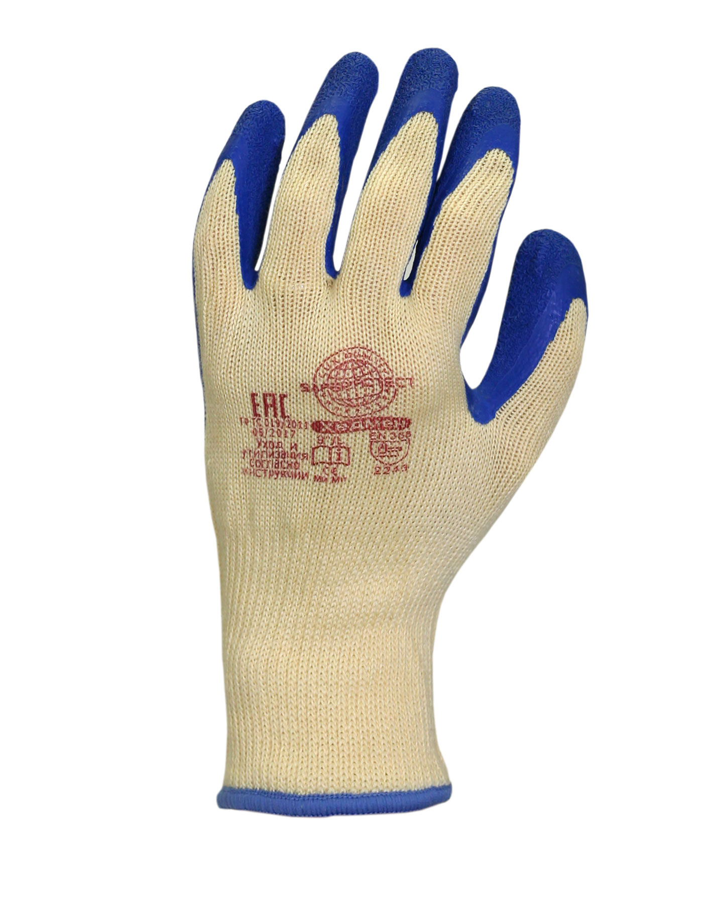 Х/б+полиэстер, 10кл. вязки. Покрытие ладони и пальцев: вспененный латекс. Манжет: эластичная резинка с цветным оверлоком. Прочные эластичные перчатки обладают отличными сцепными характеристиками. Надежная защита от проколов и порезов. Хорошая тактильная чувствительность. Дышащая чувтвительность тыльная чторона руки.