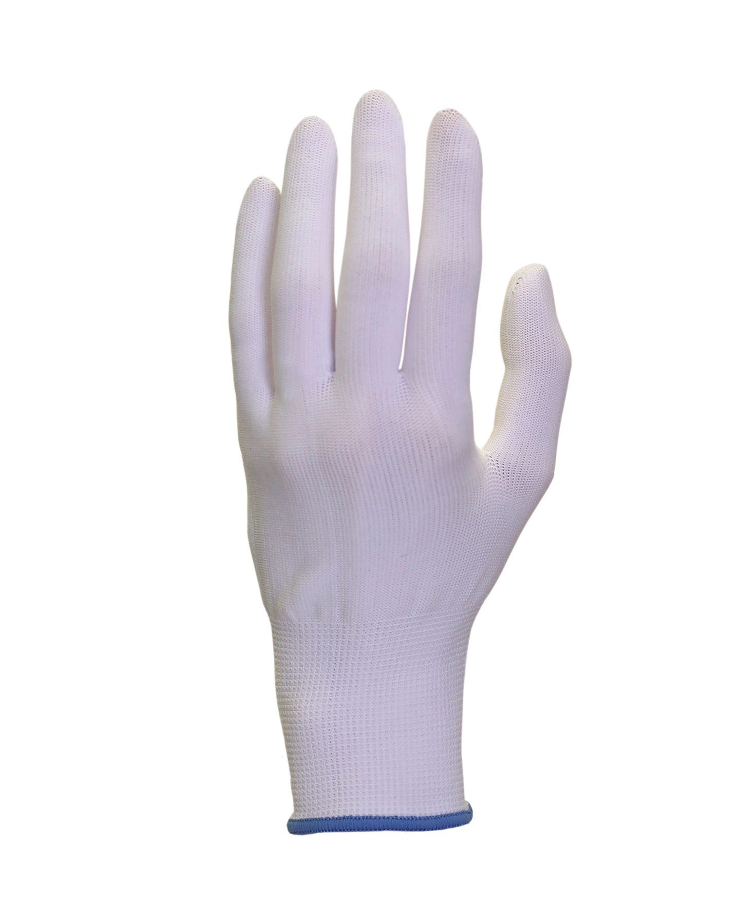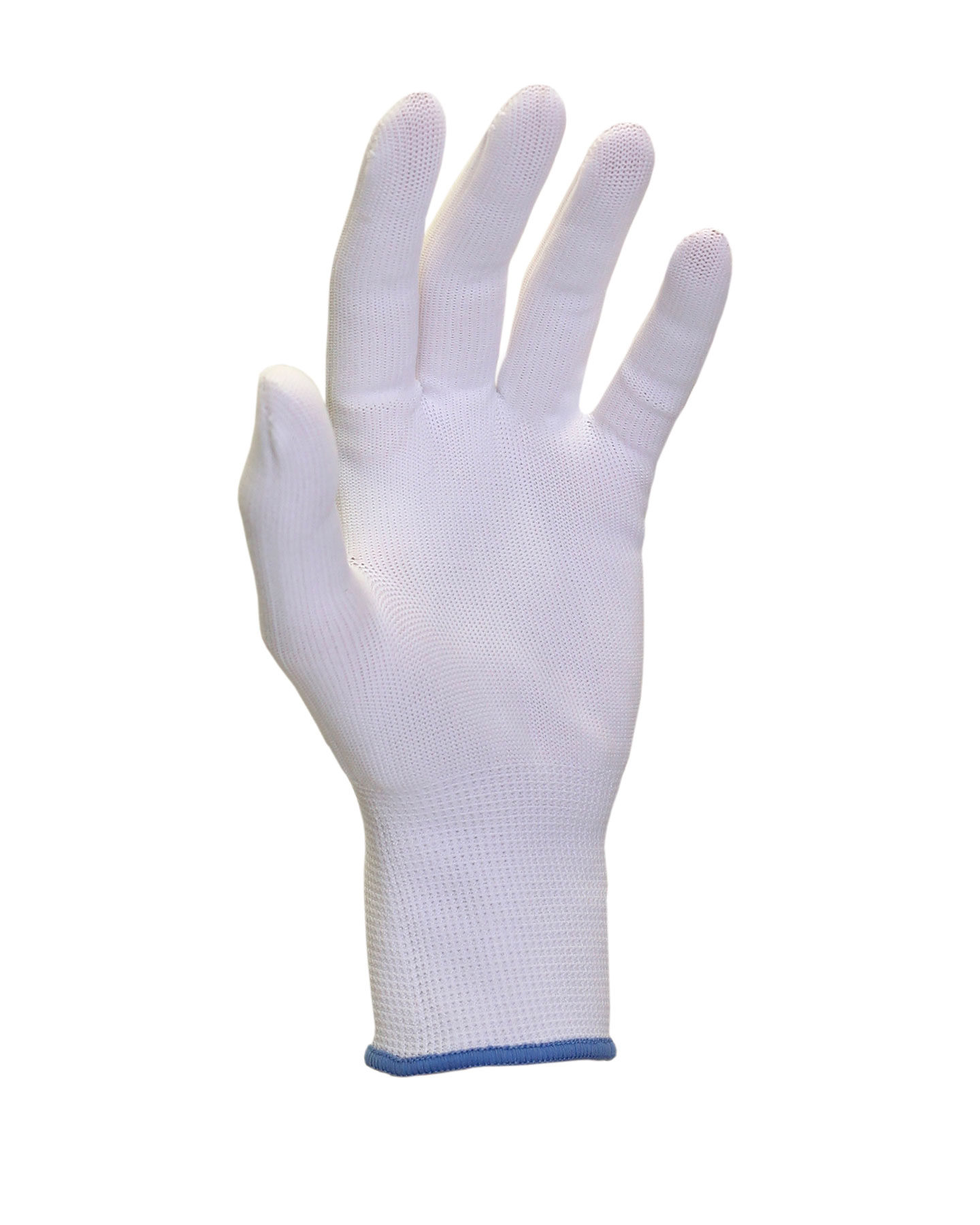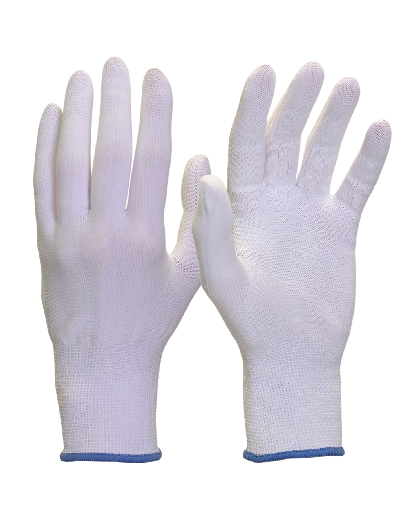 Перчатки из 100% нейлона, 13 кл. вязки, цвет белый. Отличная тактильная чувствительность, отличная воздухопроницаемость, широкий диапазон применения. Цветной оверлок.
